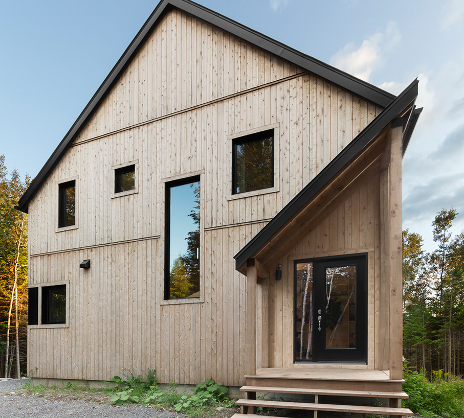 Désirant une résidence pour y loger leur famille, ces propriétaires étaient déjà vendus à l’idée d’un lieu sain, inventif et ensoleillé. Un toit angulaire en guise de porche d’entrée ajoute une note originale à la façade nord. Entièrement recouverts de planches de cèdre de l’est, les murs extérieurs reflètent l’esprit écologique du constructeur désirant utiliser les ressources locales.