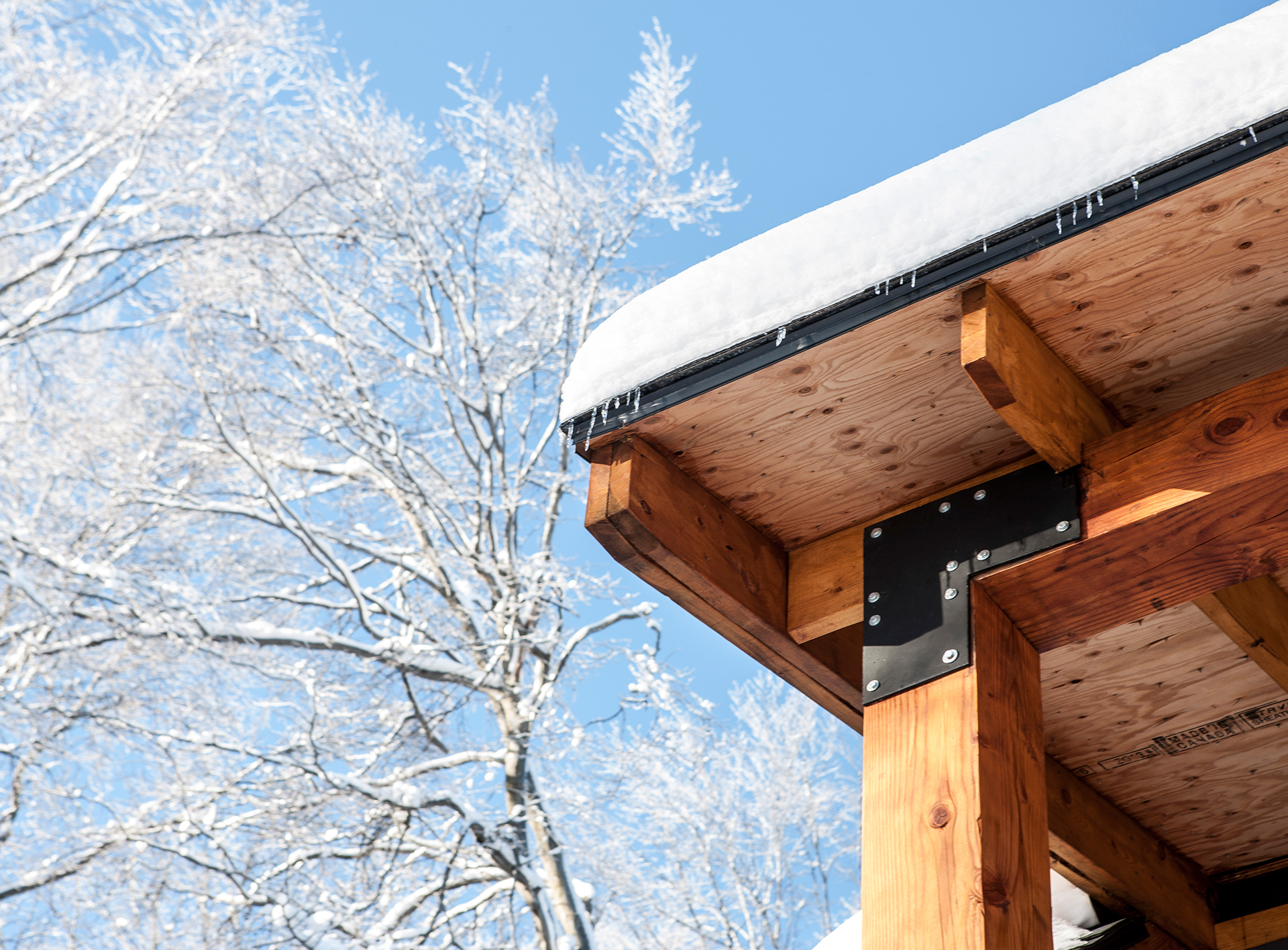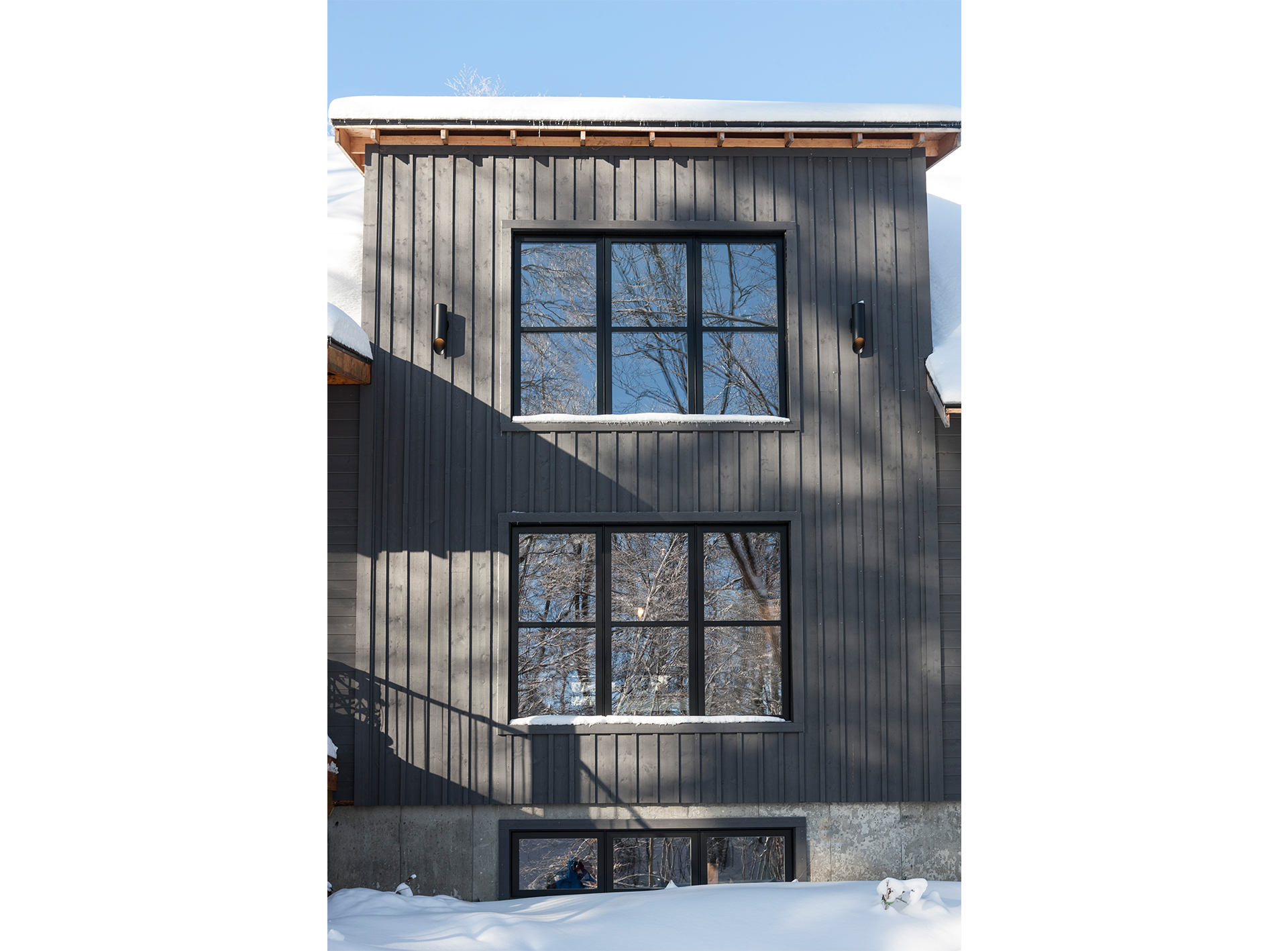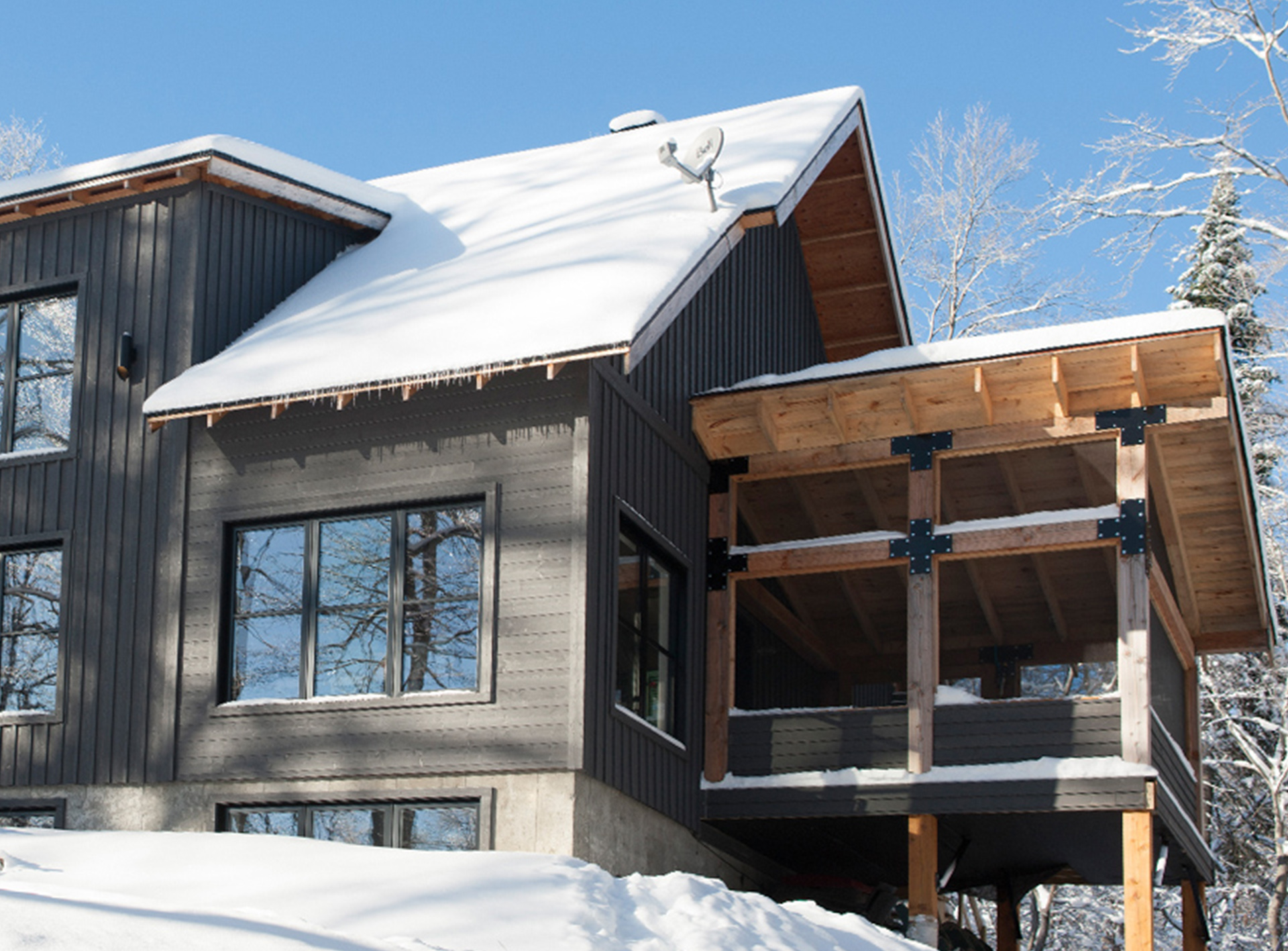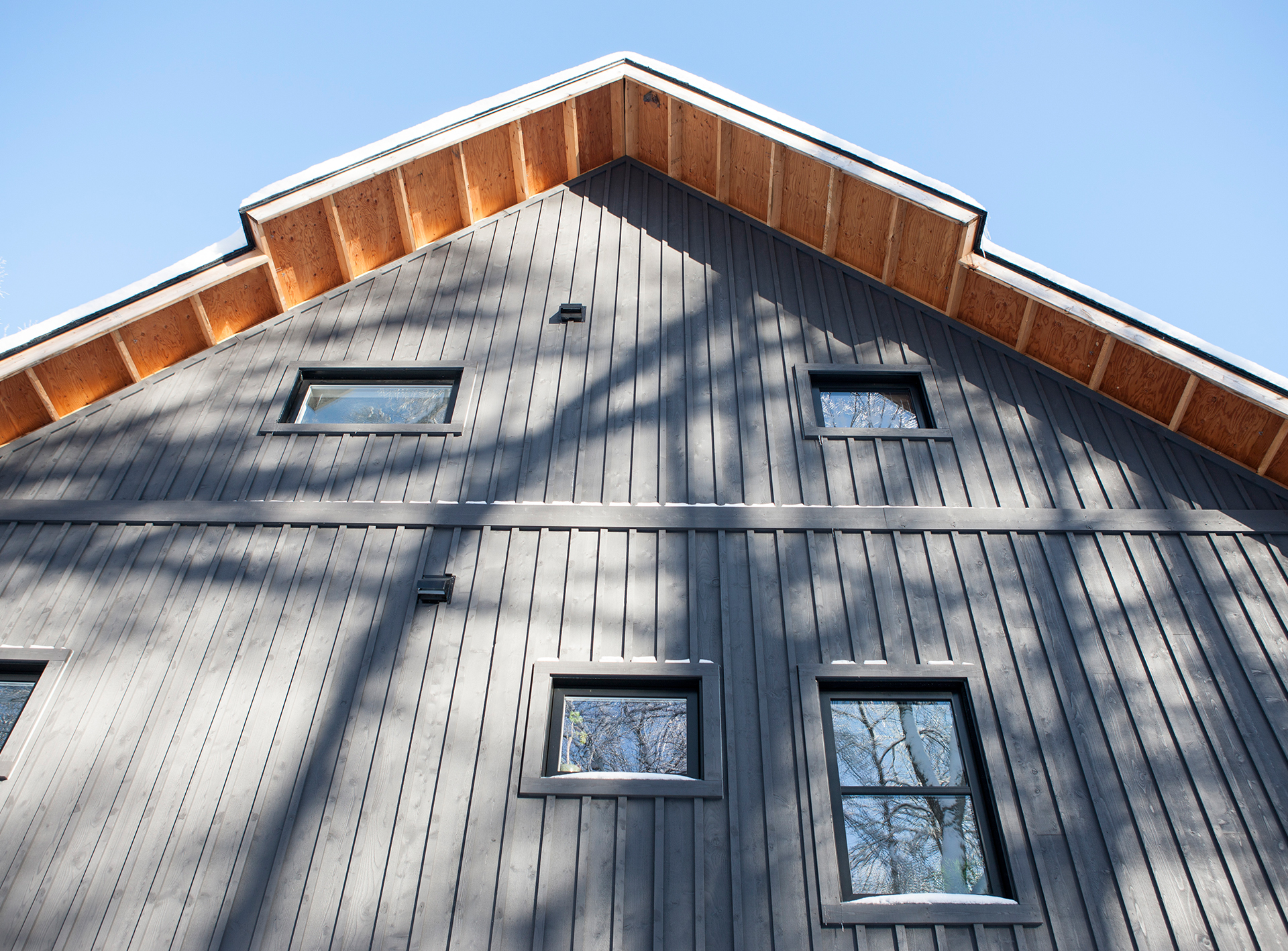 Orientée au sud, l’implantation permet une véranda moustiquaire pour le déjeuner du matin au son du ruisseau coulant tout près. D’une architecture simple, l’élément clé repose sur l’utilisation du bois et du métal. L’orientation changeante du revêtement extérieur dynamise la façade en mettant en valeur la lucarne. Cette double hauteur laisse entrer abondamment la lumière et la chaleur du soleil.