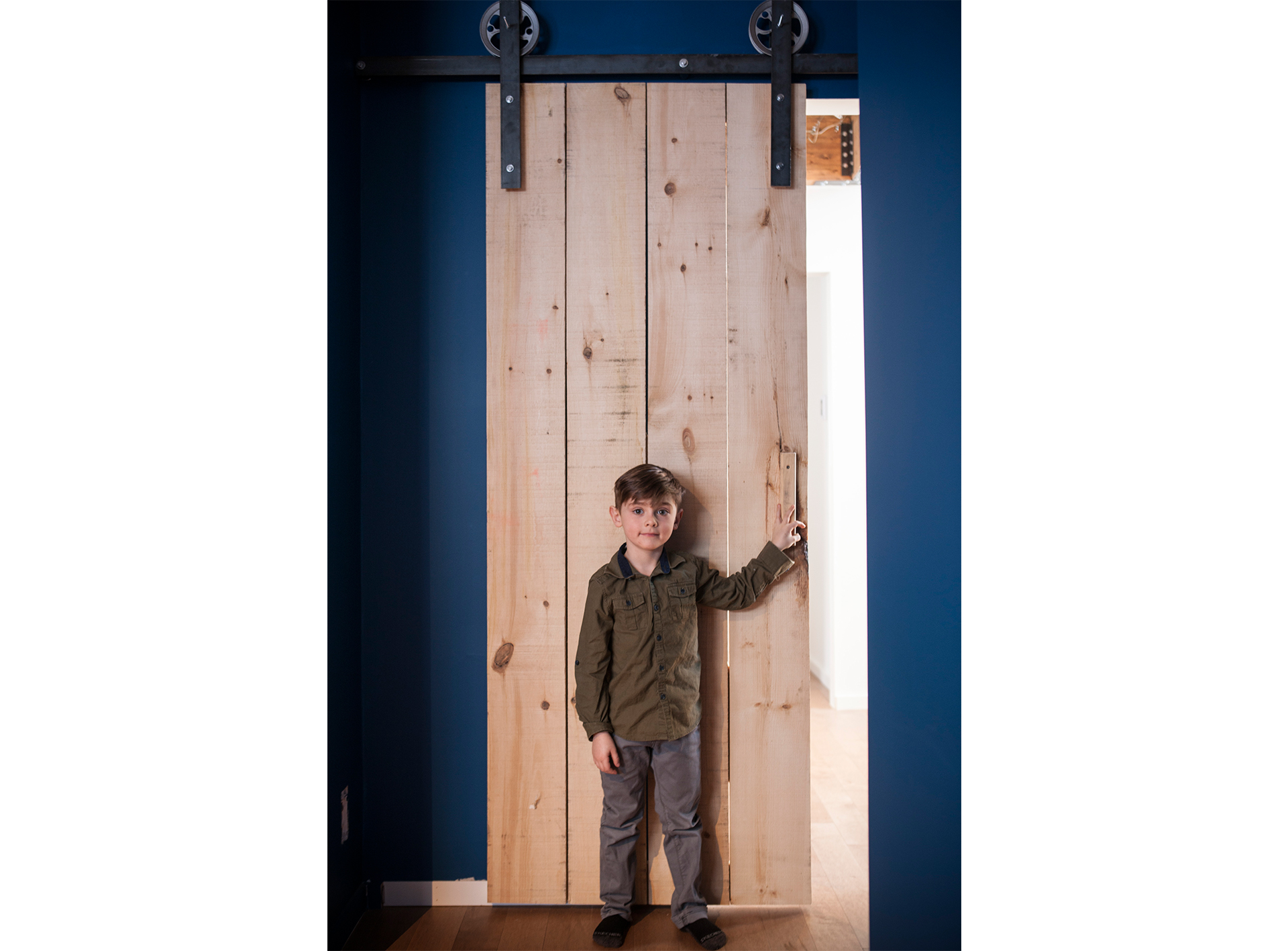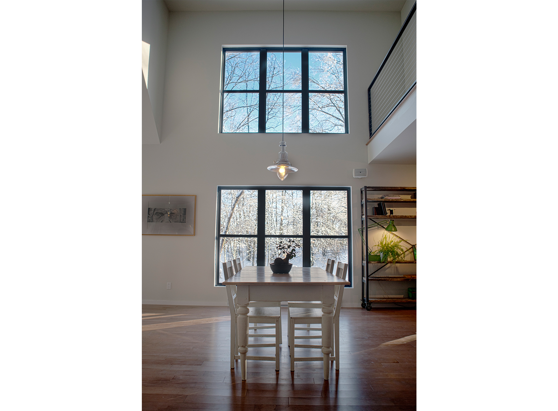 Tous les éléments métalliques, tels les limons d’escaliers, fer-angles, paliers et garde-corps ont été conçus et réalisés par les propriétaires eux-mêmes. Tout en simplicité, le blanc, le noir, et le gris côtoient le bois naturel créant une ambiance « industrielle chic ».