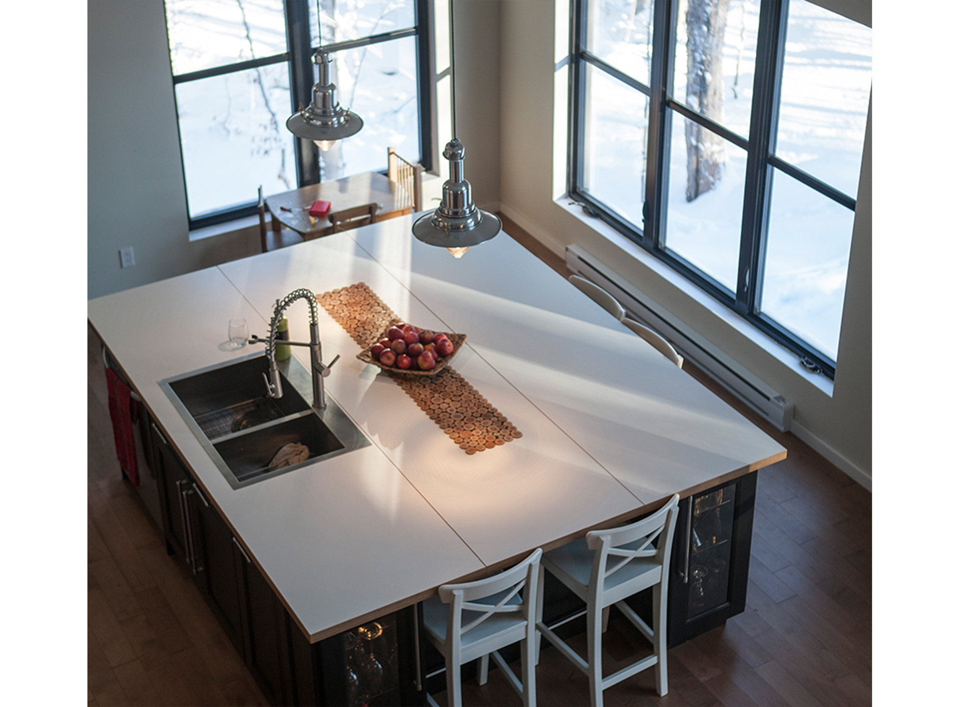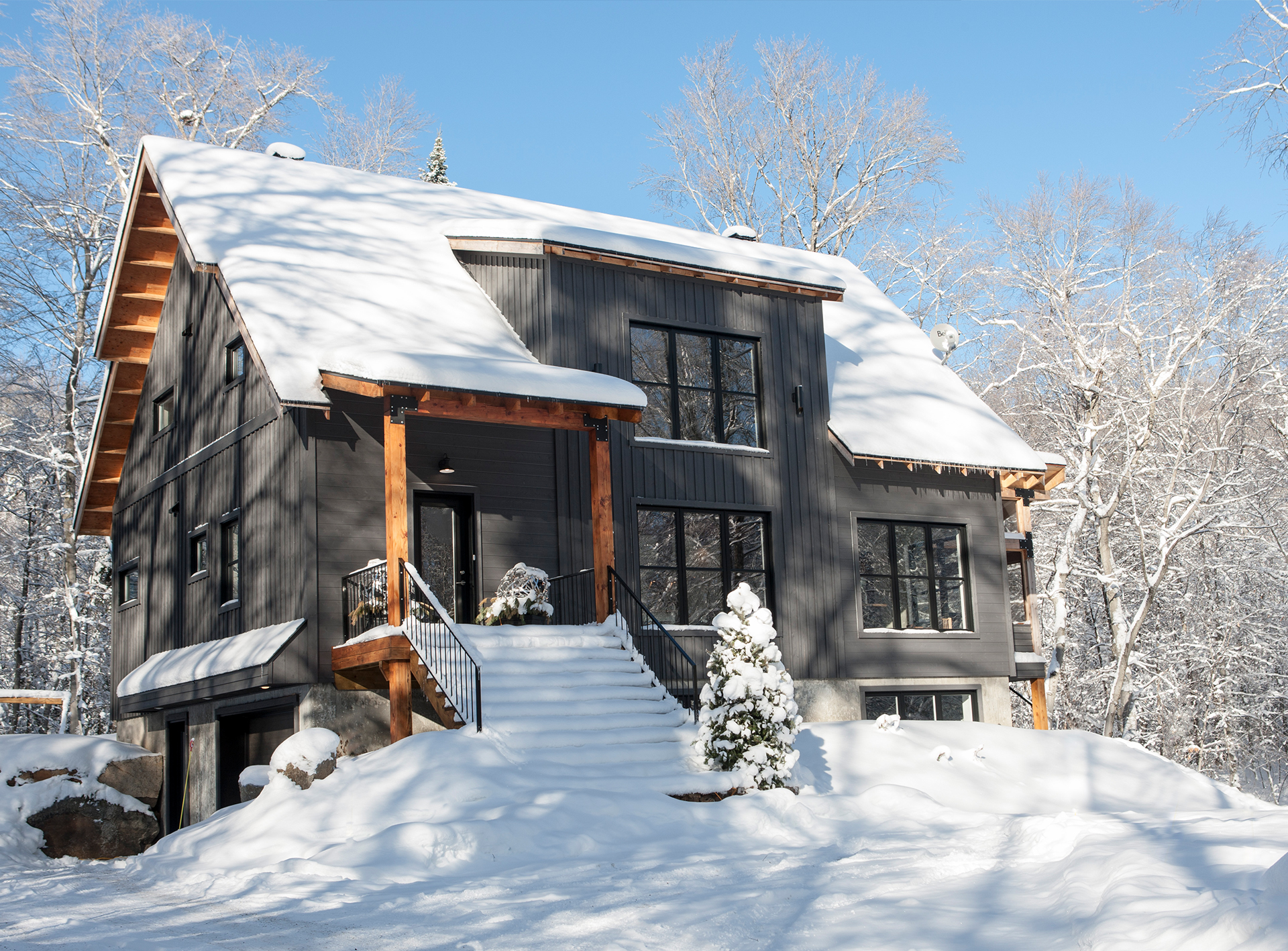 Blottie dans une forêt de feuillus, près de Saint-Sauveur, cette maison accueille une famille avec deux enfants. Se disant plutôt de type exigeant, les clients n’ont fait aucun compromis sur le style désiré.