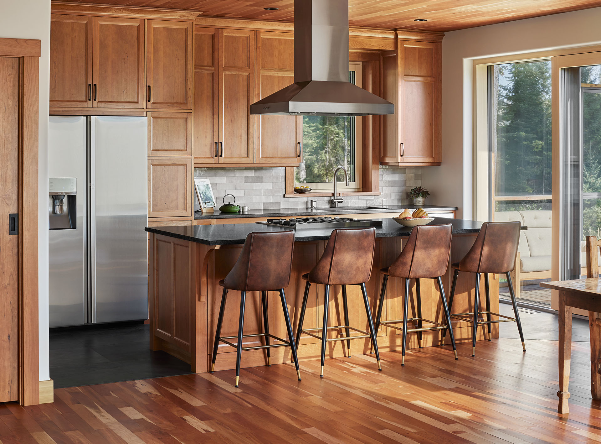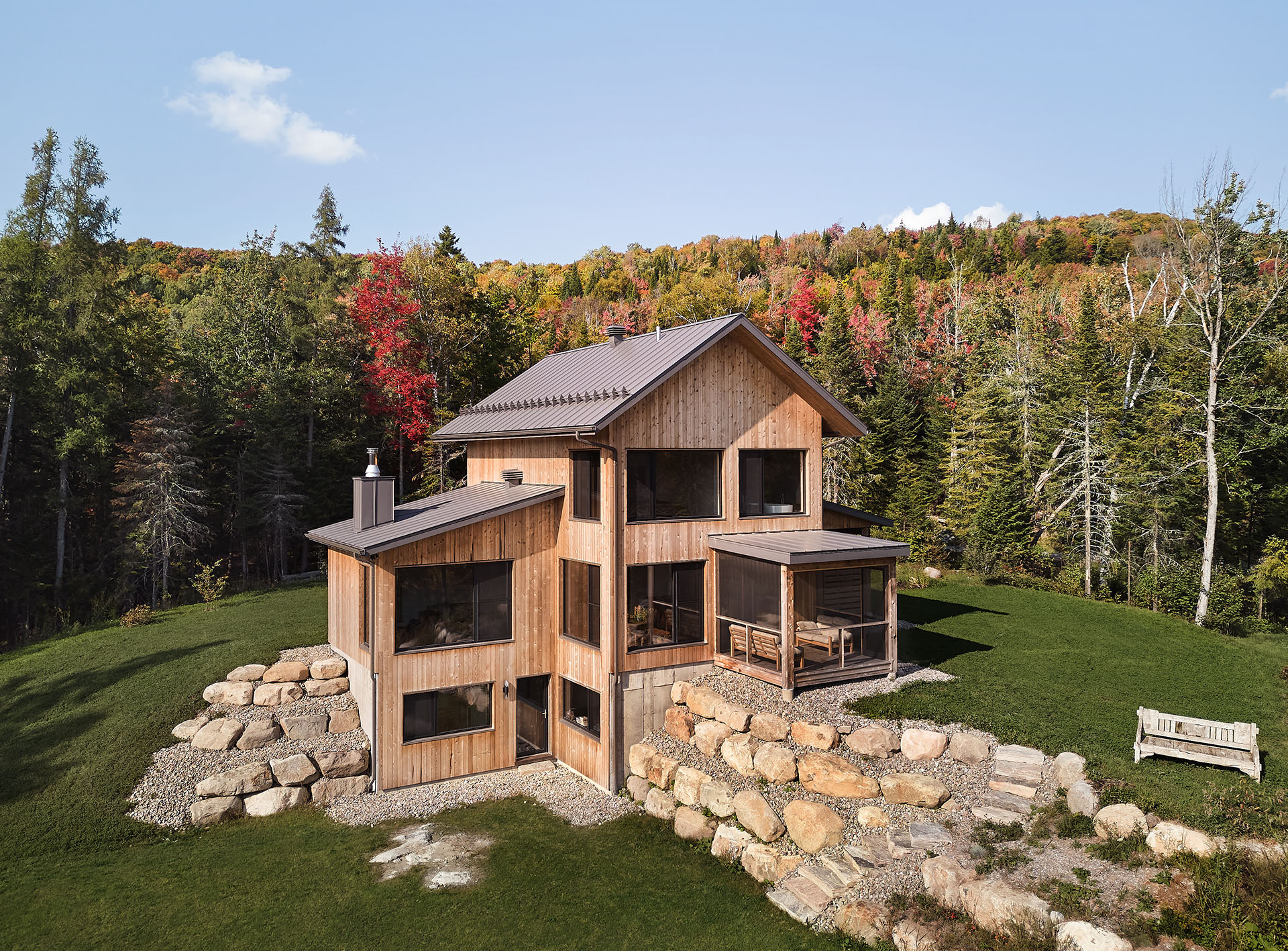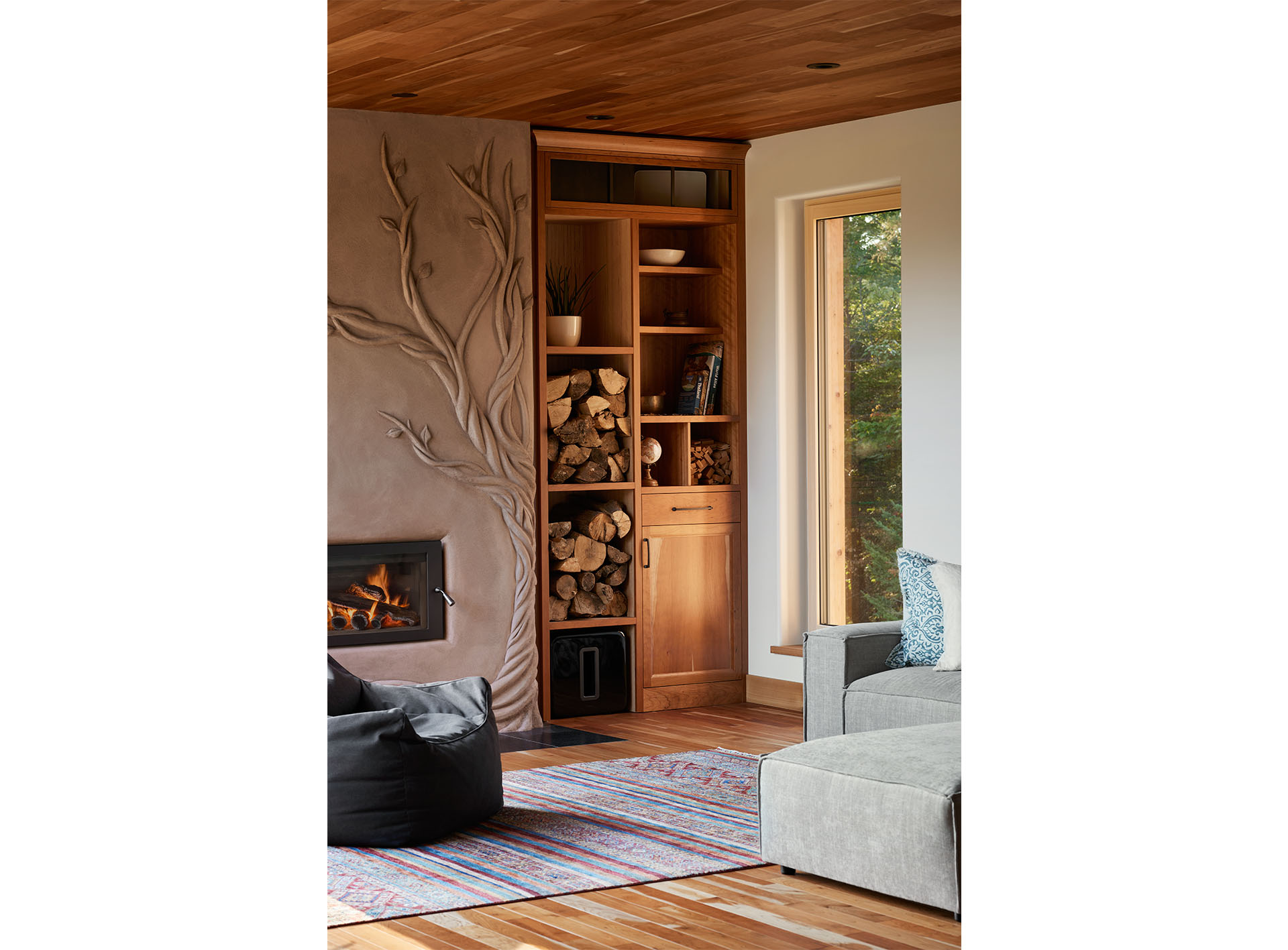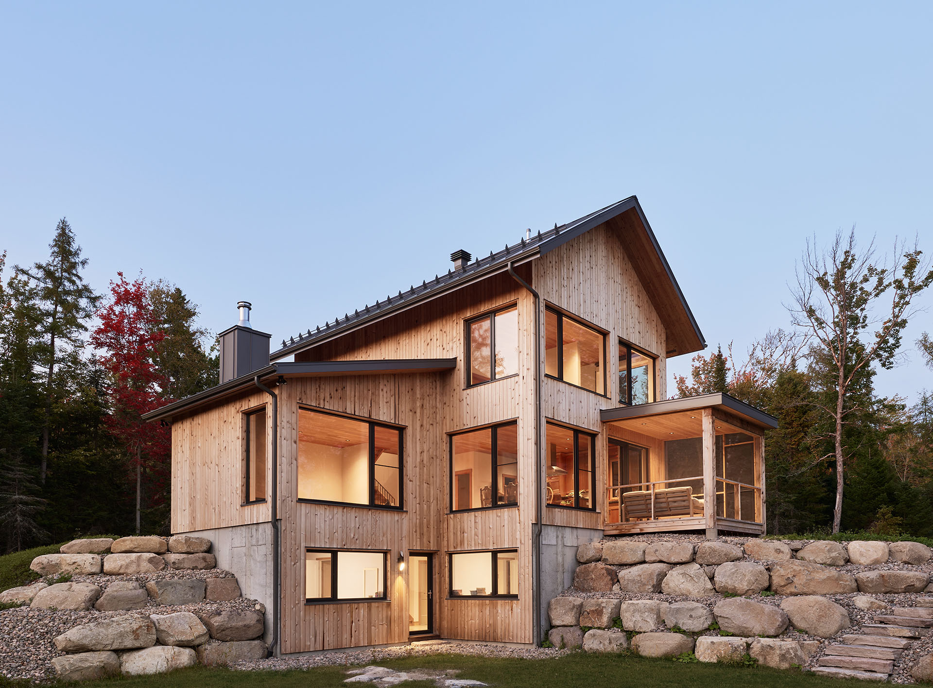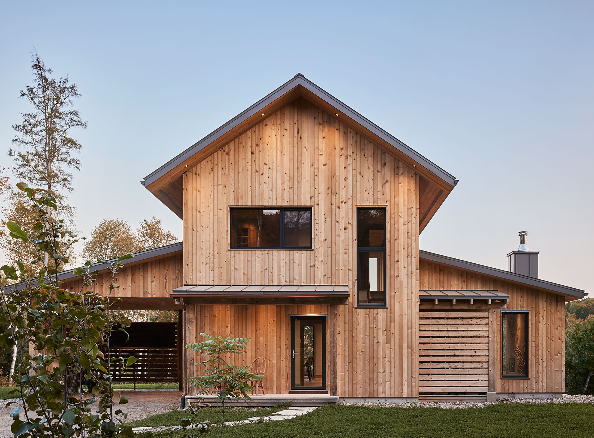 La famille souhaitait une architecture simple, des lignes épurées et des matériaux respectueux de l’environnement. Le revêtement en cèdre récupéré, l’installation de portes et fenêtres haute performance, une étanchéité à l’air impeccable, ainsi que l’utilisation de matériaux locaux et sains, sont autant d’éléments qui caractérisent cette maison éco-énergétique. Les débords de toit à l’étage, minutieusement calculés, protègent la maison de la surchauffe en été, tout en permettant un ensoleillement optimal durant l’hiver.