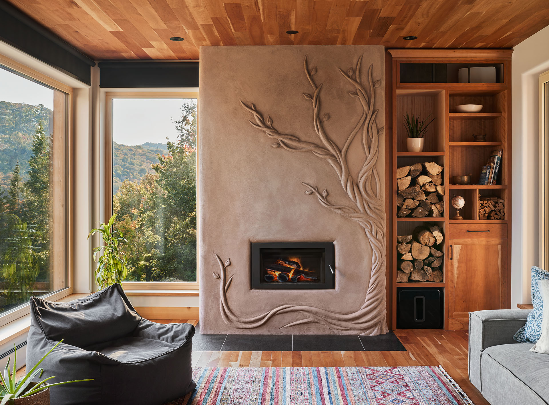 L’enduit de chaux appliqué sur le foyer, les escaliers, les armoires et les plafonds en bois confère à chaque pièce une atmosphère de calme et de sérénité, un refuge où il fait bon vivre.