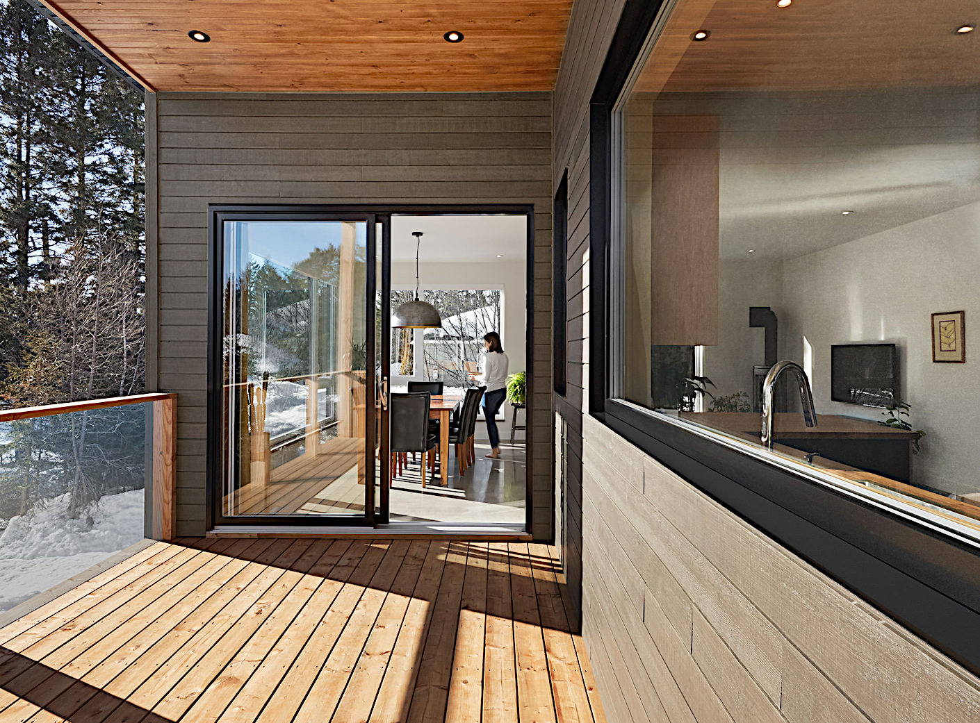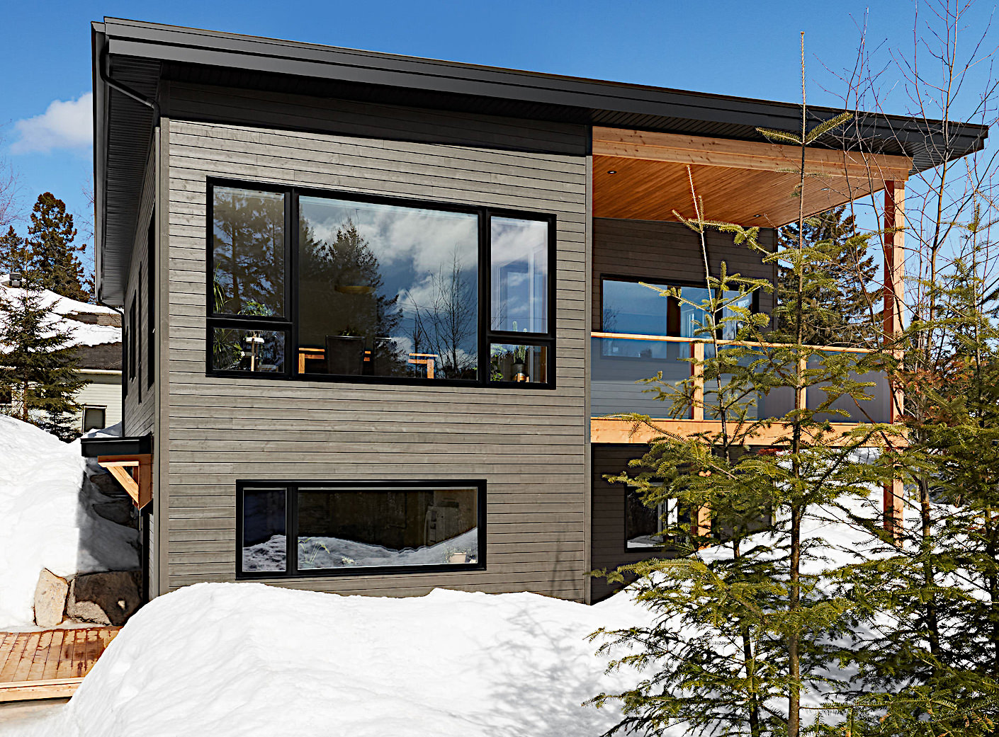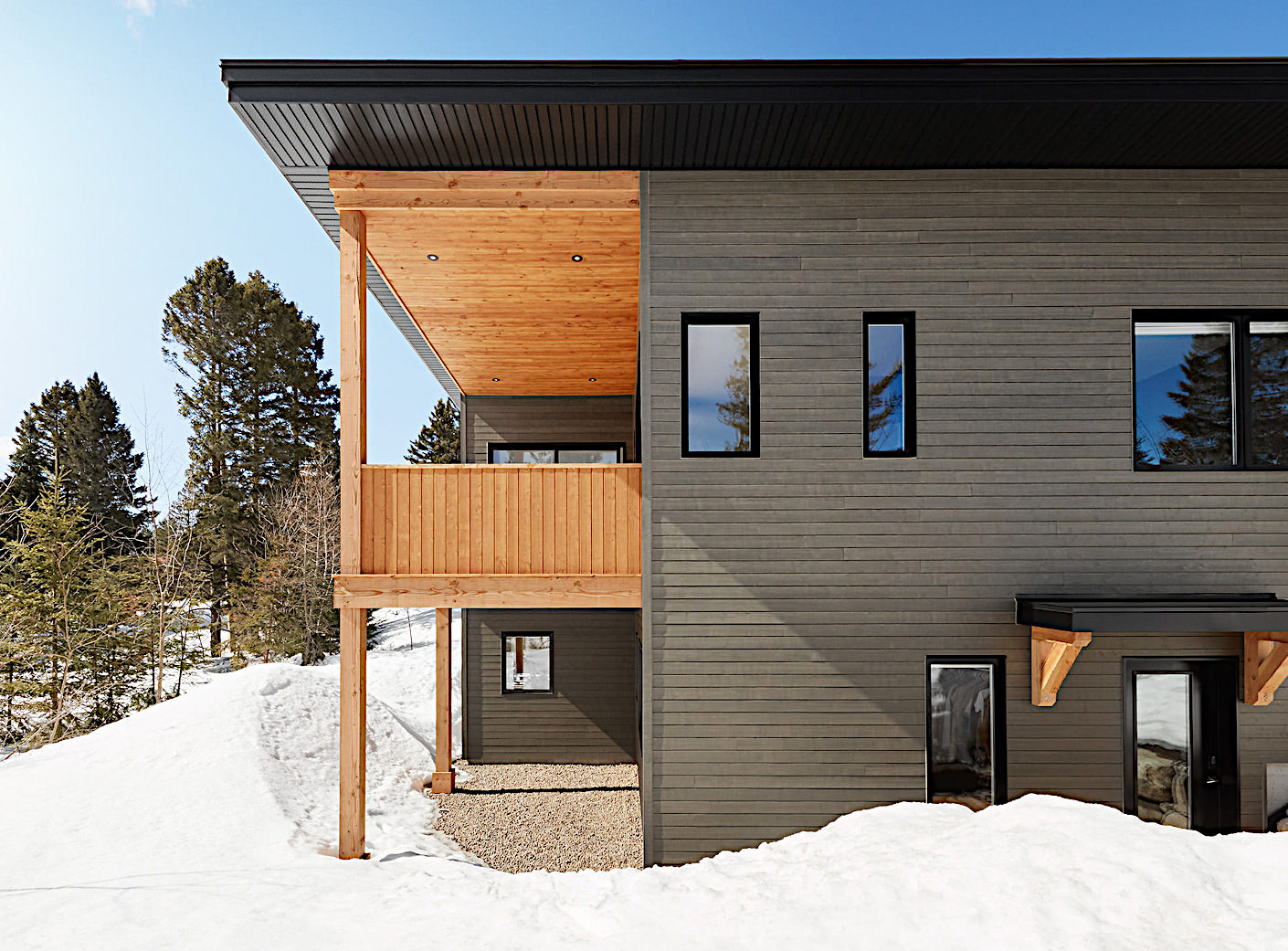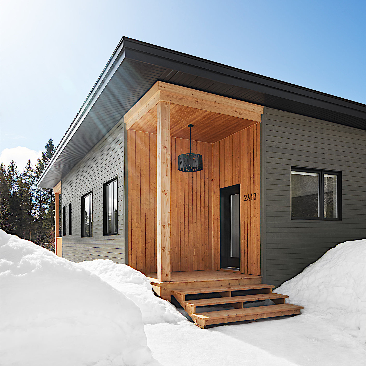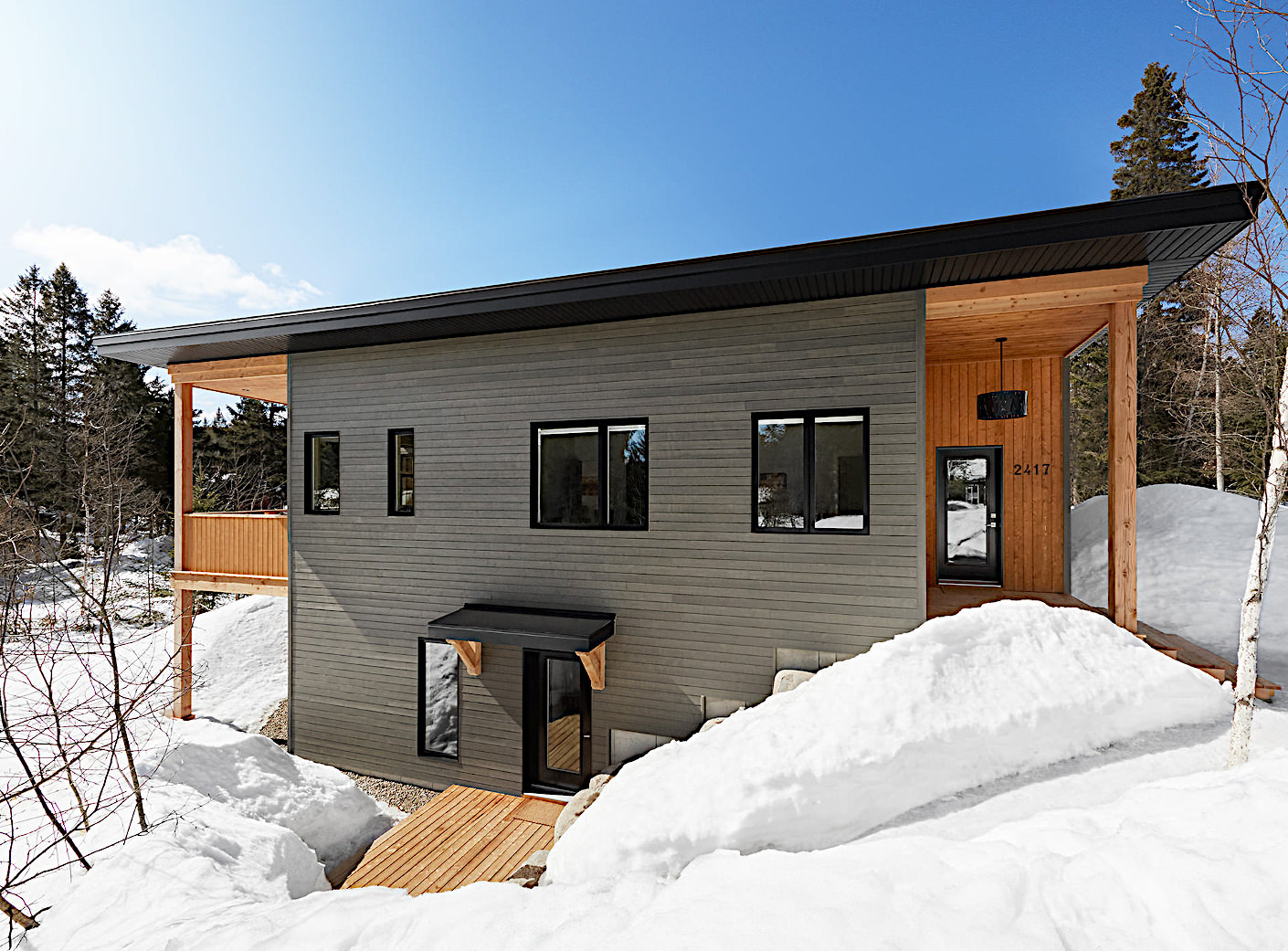 Tout en simplicité, la toiture de faible pente, les poutres de bois, les portes et fenêtres noires, le revêtement de bois aux couleurs foncés et naturelles, font de cette résidence une intégration réussie au sein même du quartier. Une tout nouvel environnement répondant davantage aux besoins actuels des clients...moins de travail, plus de plaisirs!