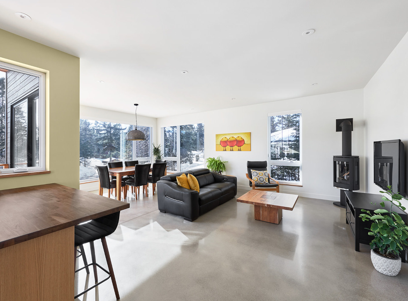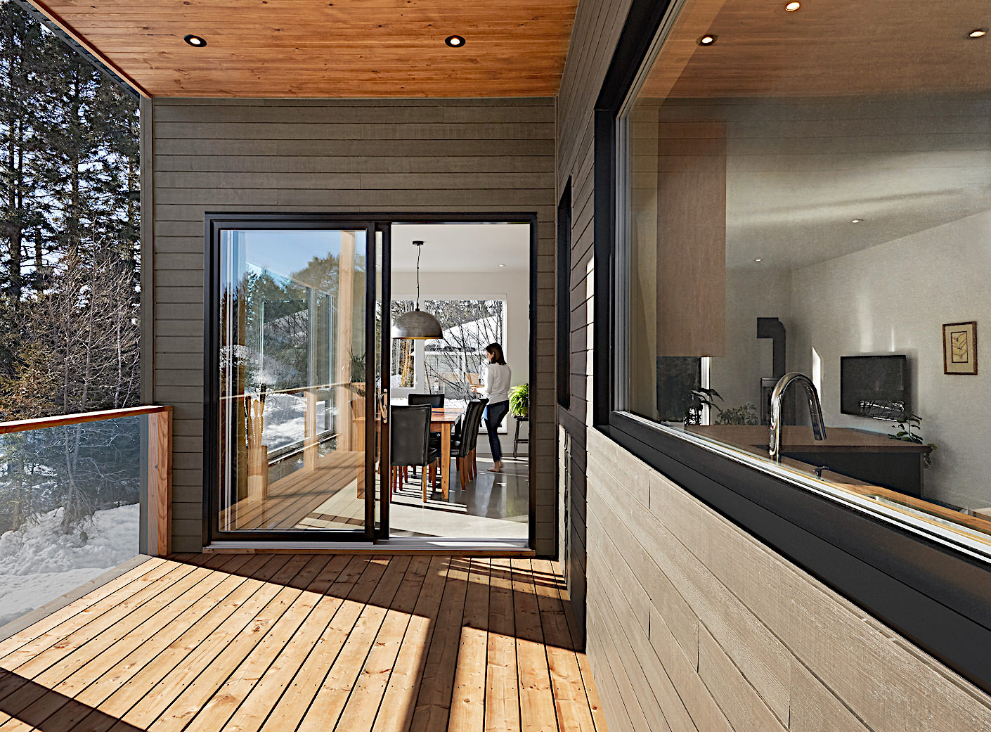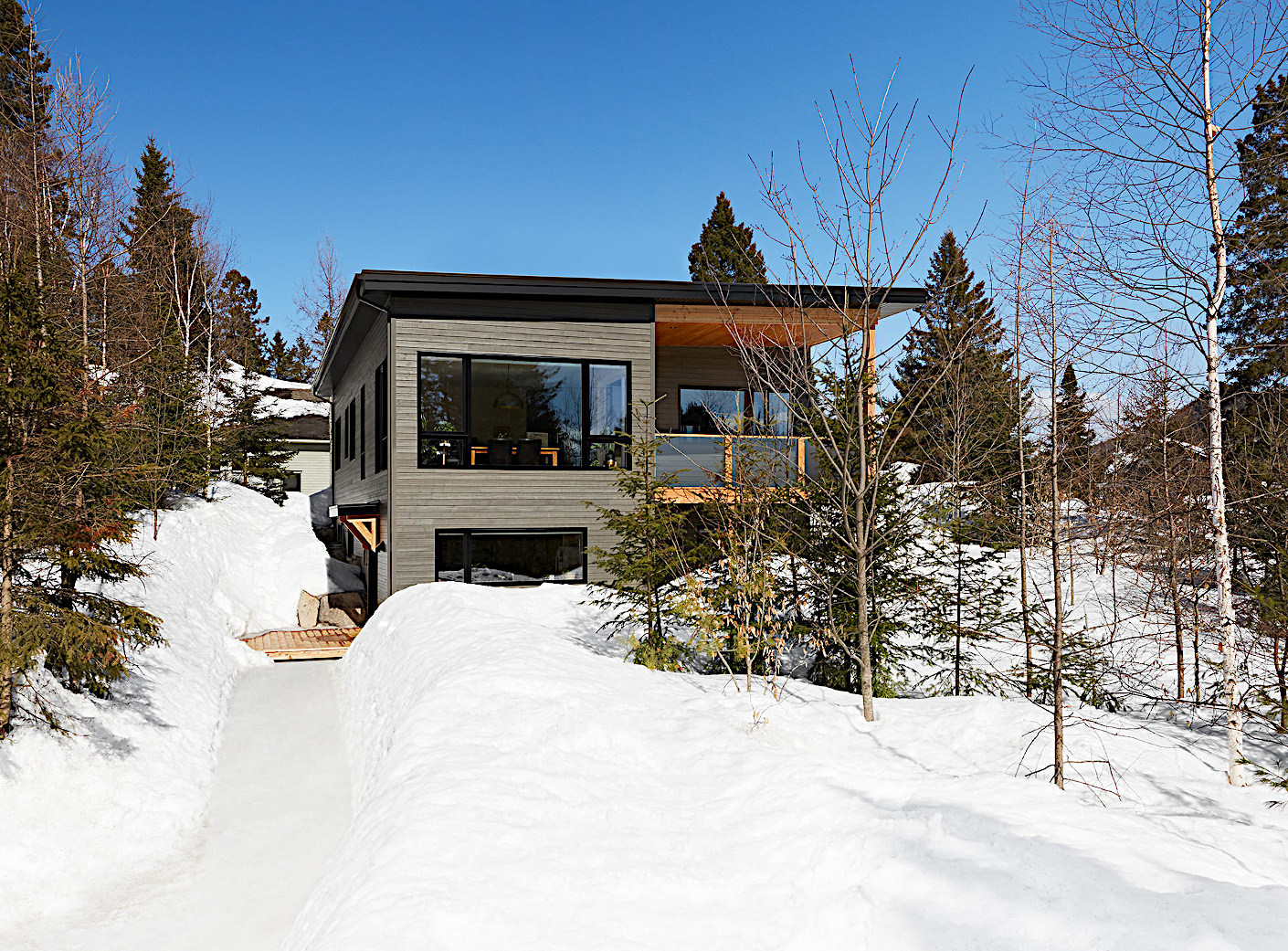 La résidence Croteau-Gareau est une maison aux allures contemporaines, située tout près du coeur villageois de Val-david. Voulant réduire leur superficie habitable et se consacrer davantage aux loisirs et à leur famille, les clients se tournent vers l'option d'une maison plein-pied avec un bachelor au rez-de-jardin.