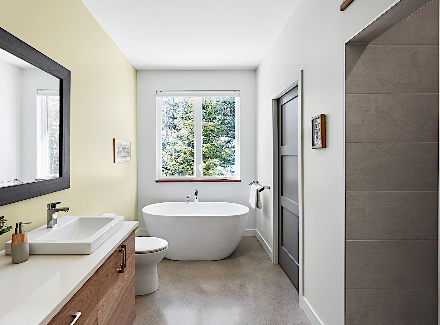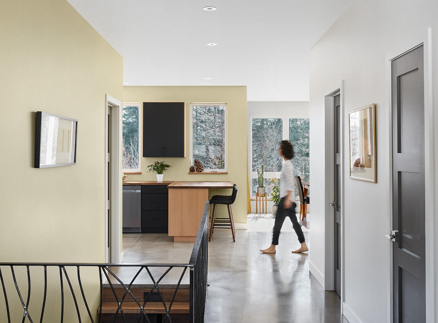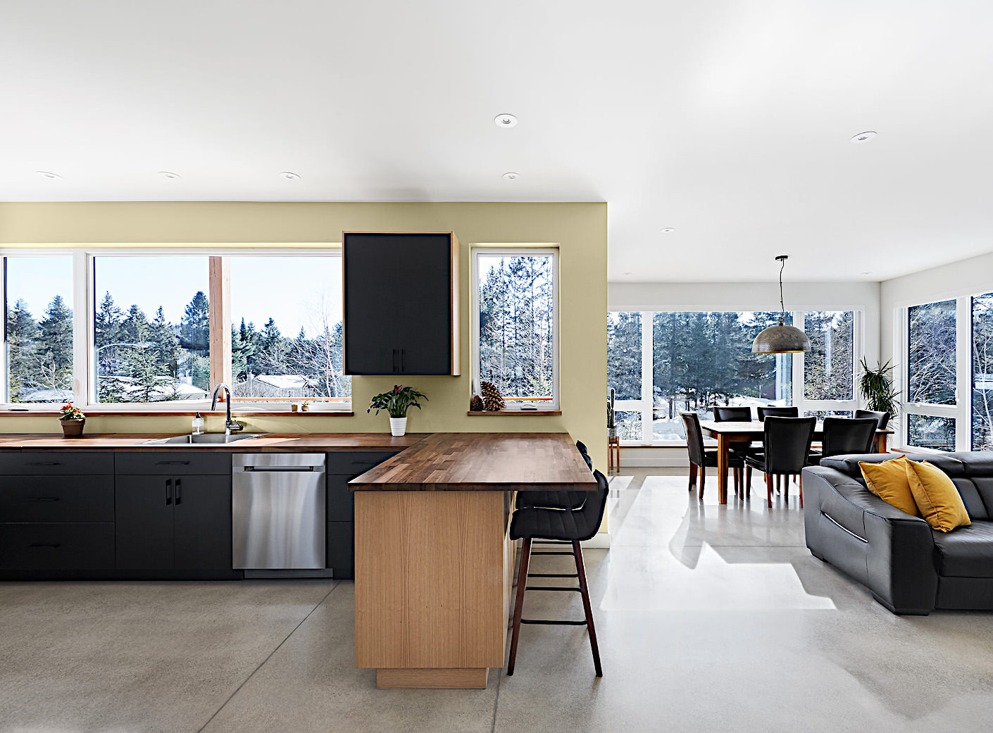 La résidence Croteau-Gareau est une maison aux allures contemporaines, située tout près du coeur villageois de Val-david. Voulant réduire leur superficie habitable et se consacrer davantage aux loisirs et à leur famille, les clients se tournent vers l'option d'une maison plein-pied avec un bachelor au rez-de-jardin.