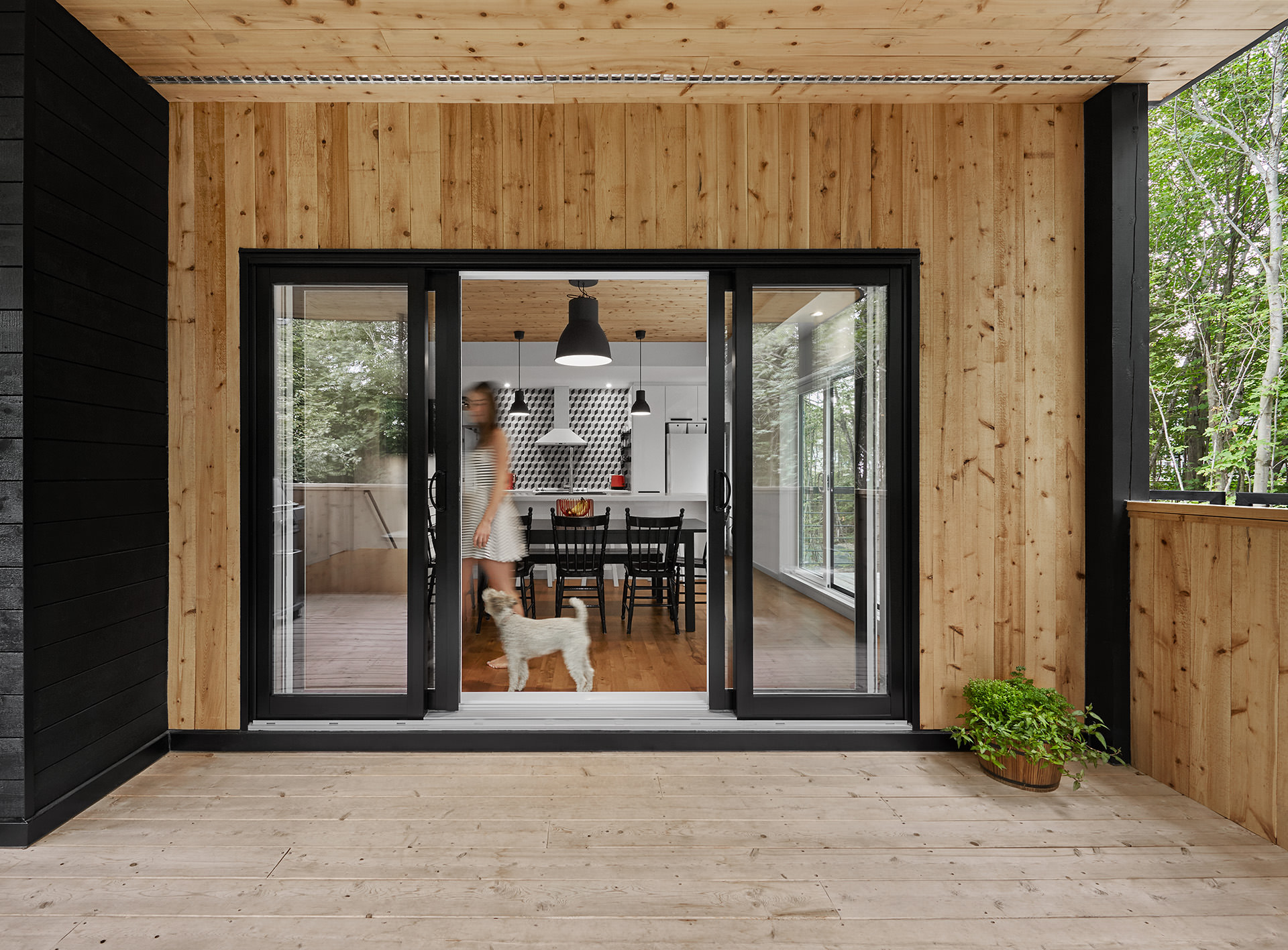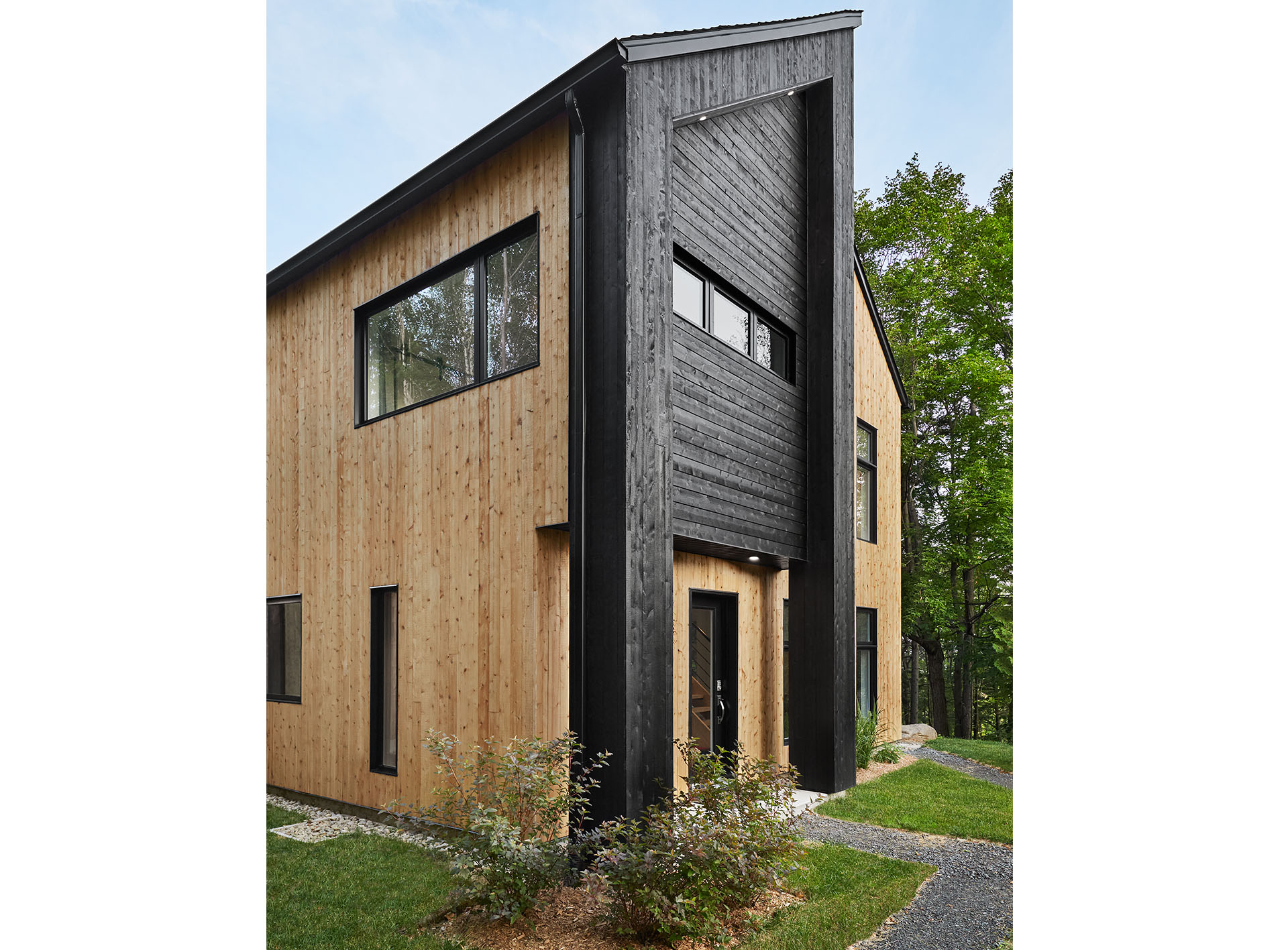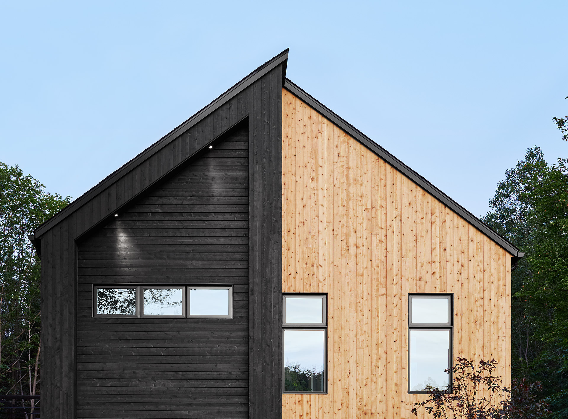 Tout de bois vêtue, le revêtement de cette résidence met en valeur le cèdre blanc de l'est, procuré dans une scierie locale des Laurentides. Les portes et fenêtres noires contrastent avec le blond du bois huilé.