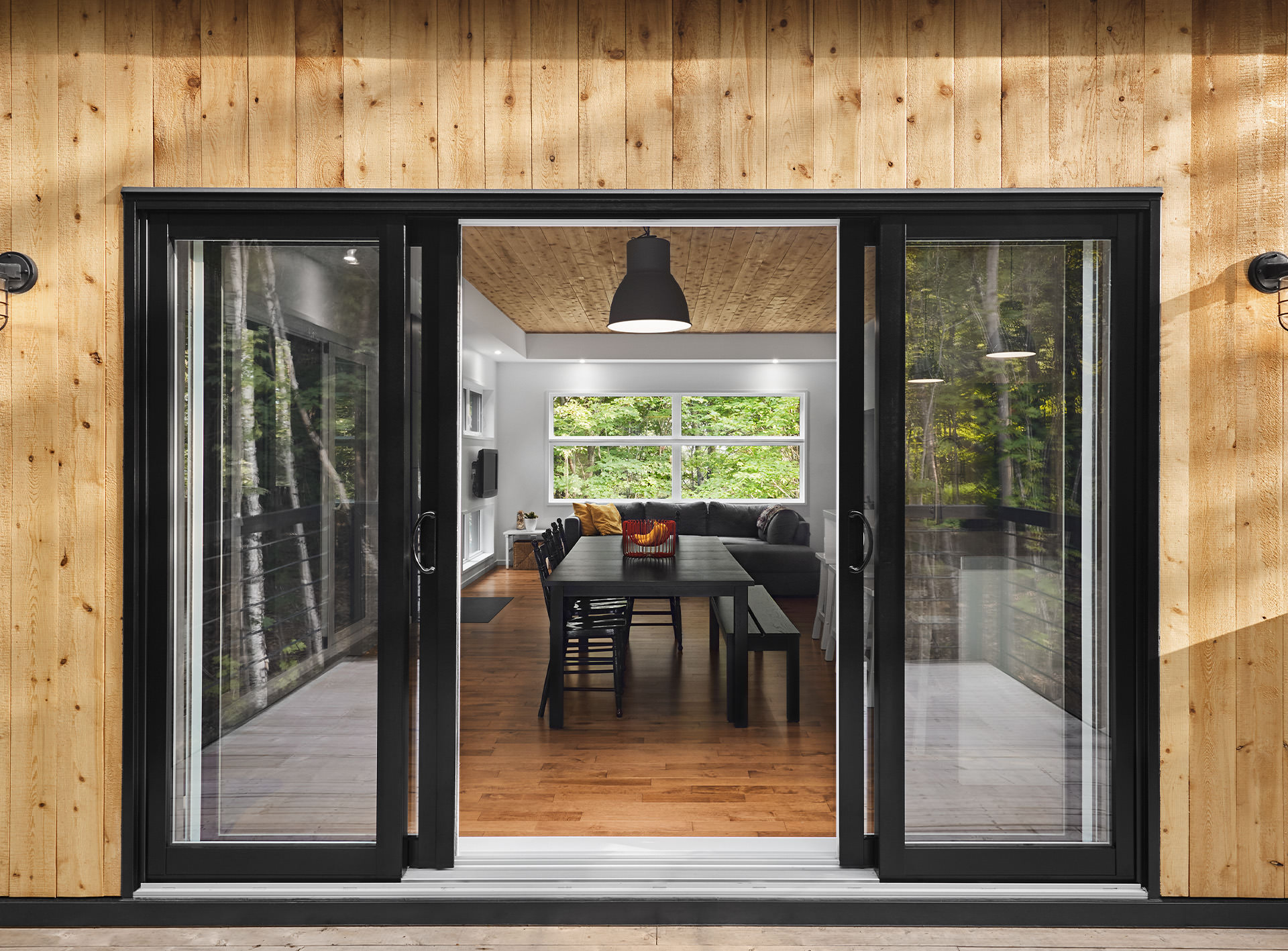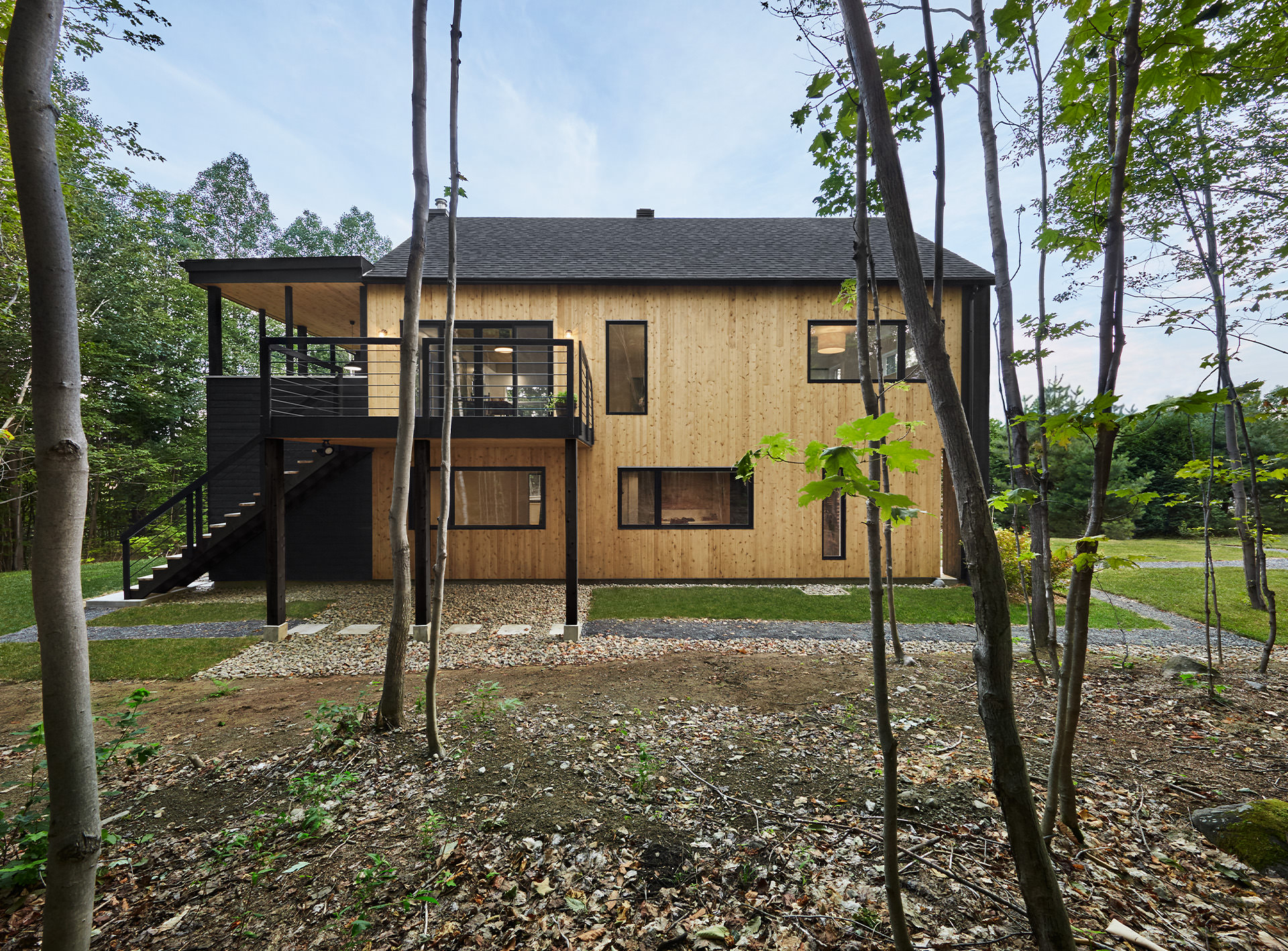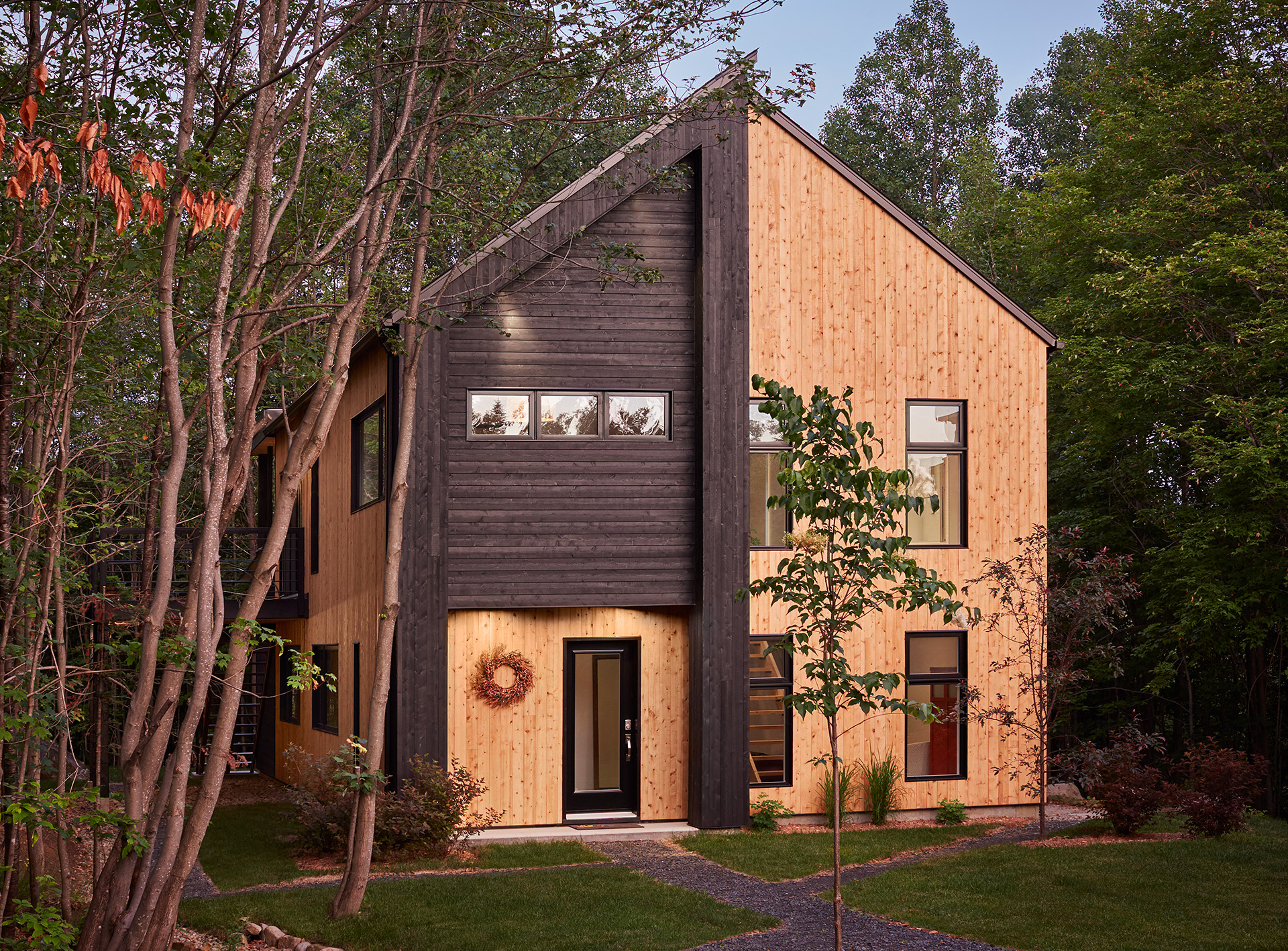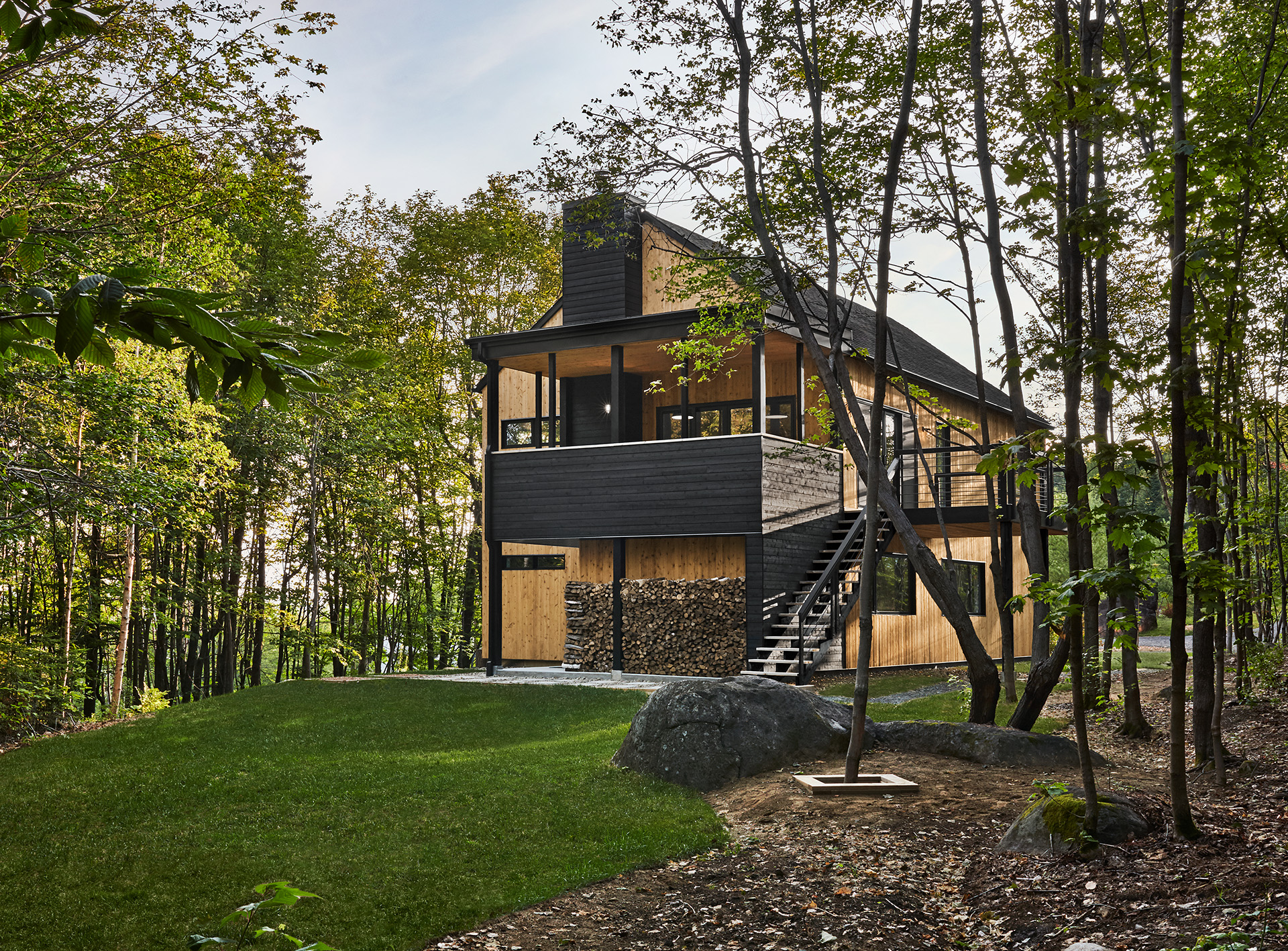 Tout de bois vêtue, le revêtement de cette résidence met en valeur le cèdre blanc de l'est, procuré dans une scierie locale des Laurentides. Les portes et fenêtres noires contrastent avec le blond du bois huilé.
