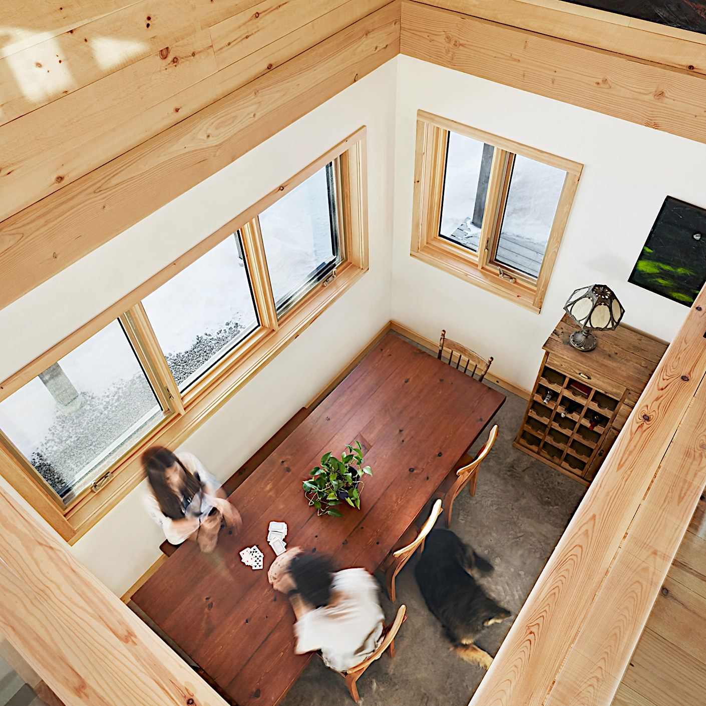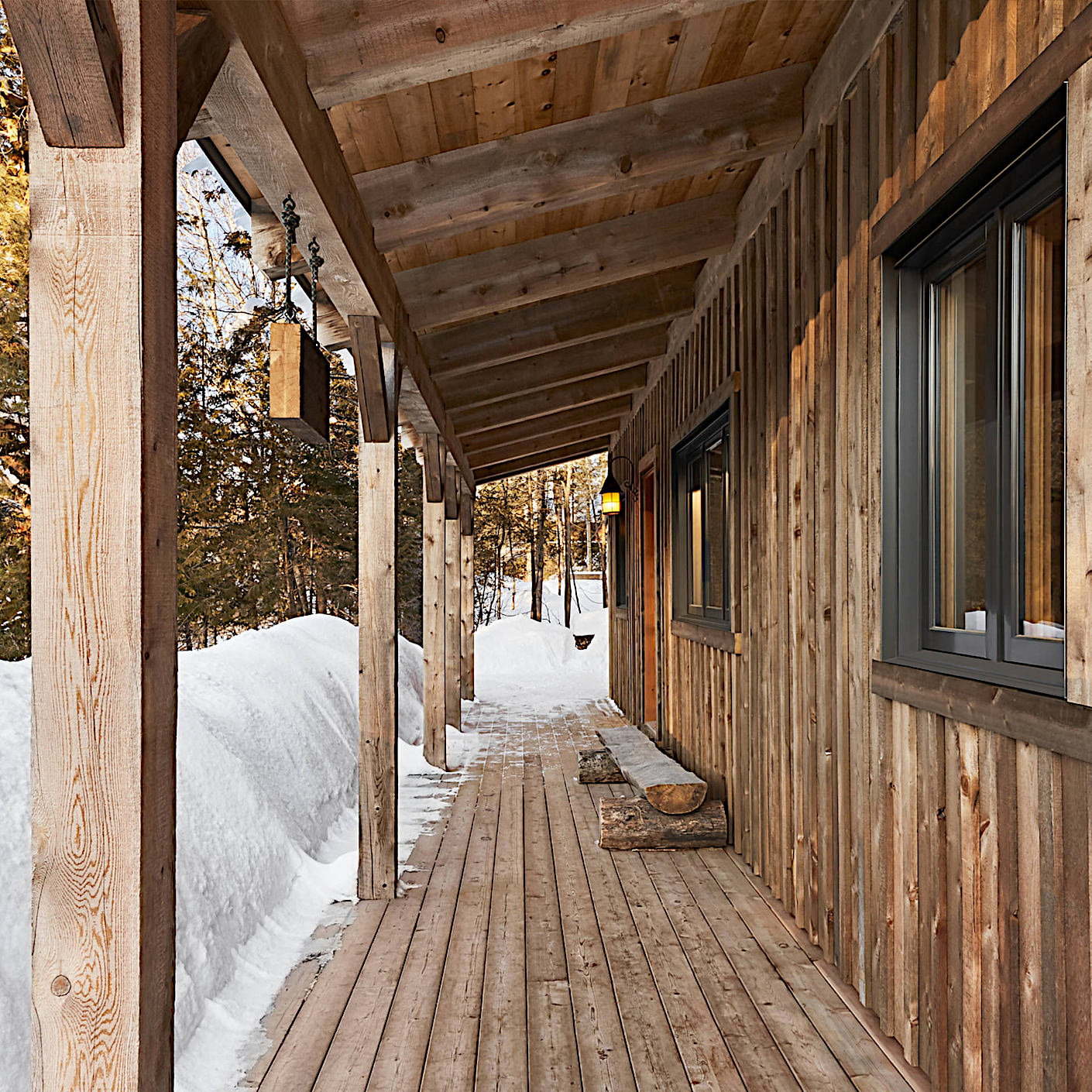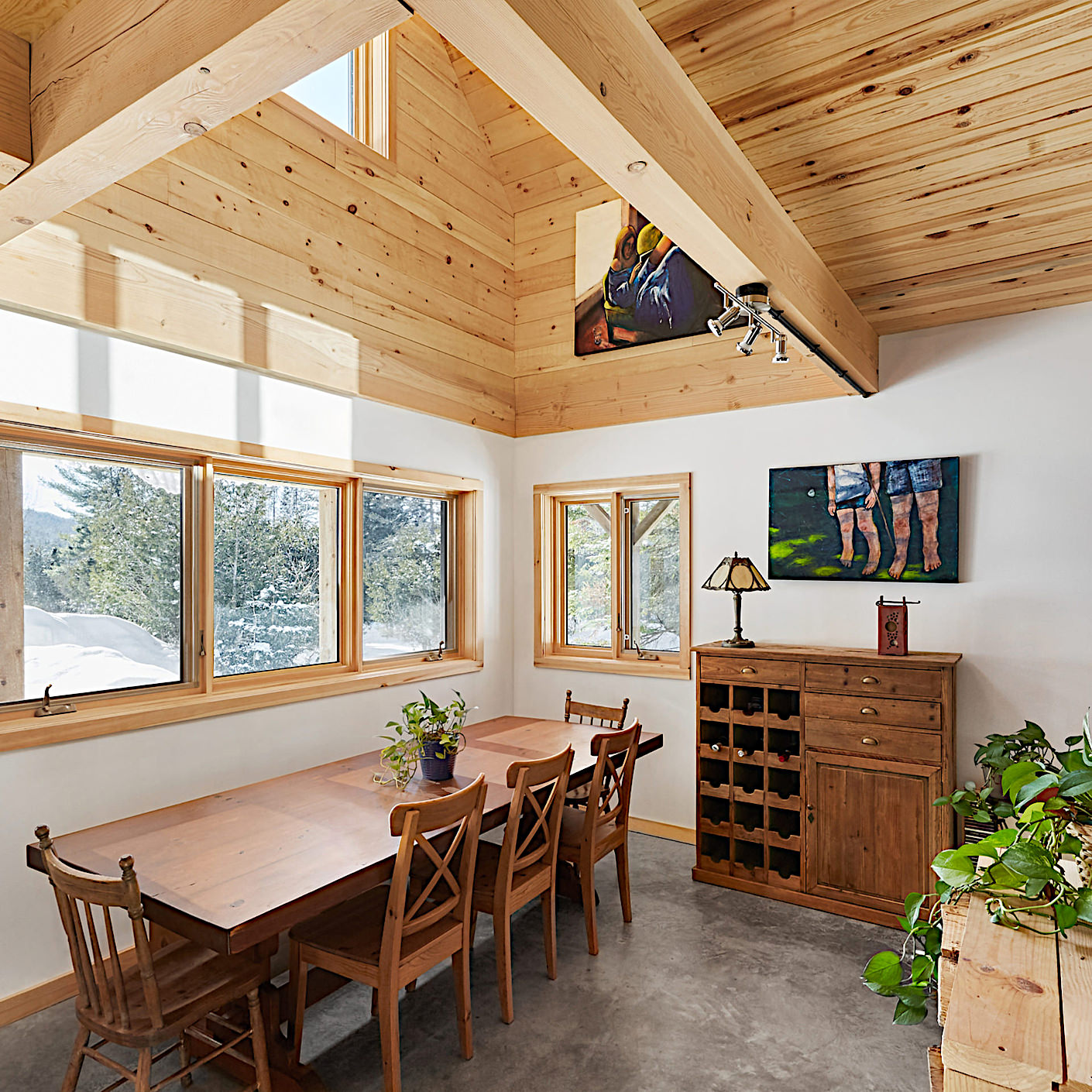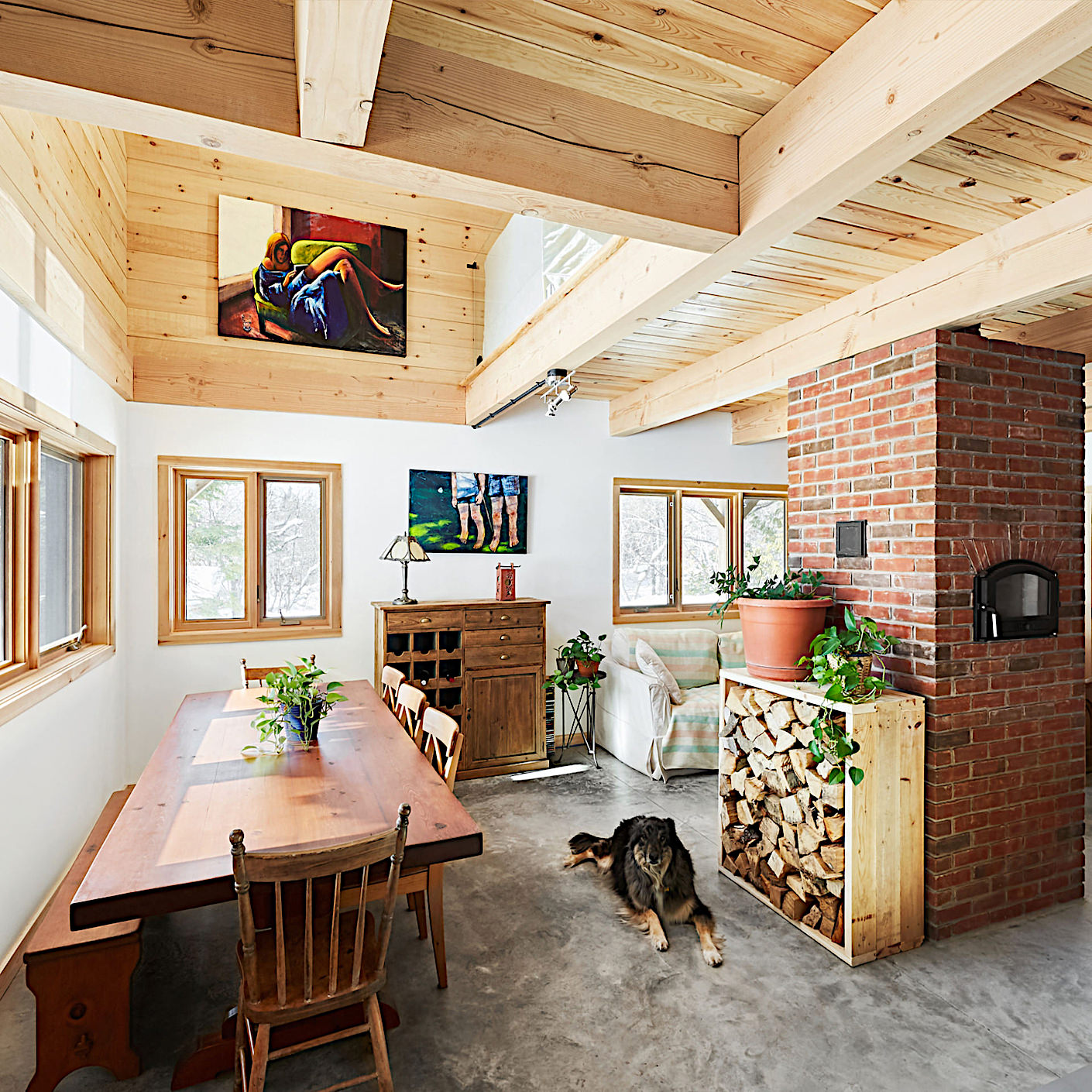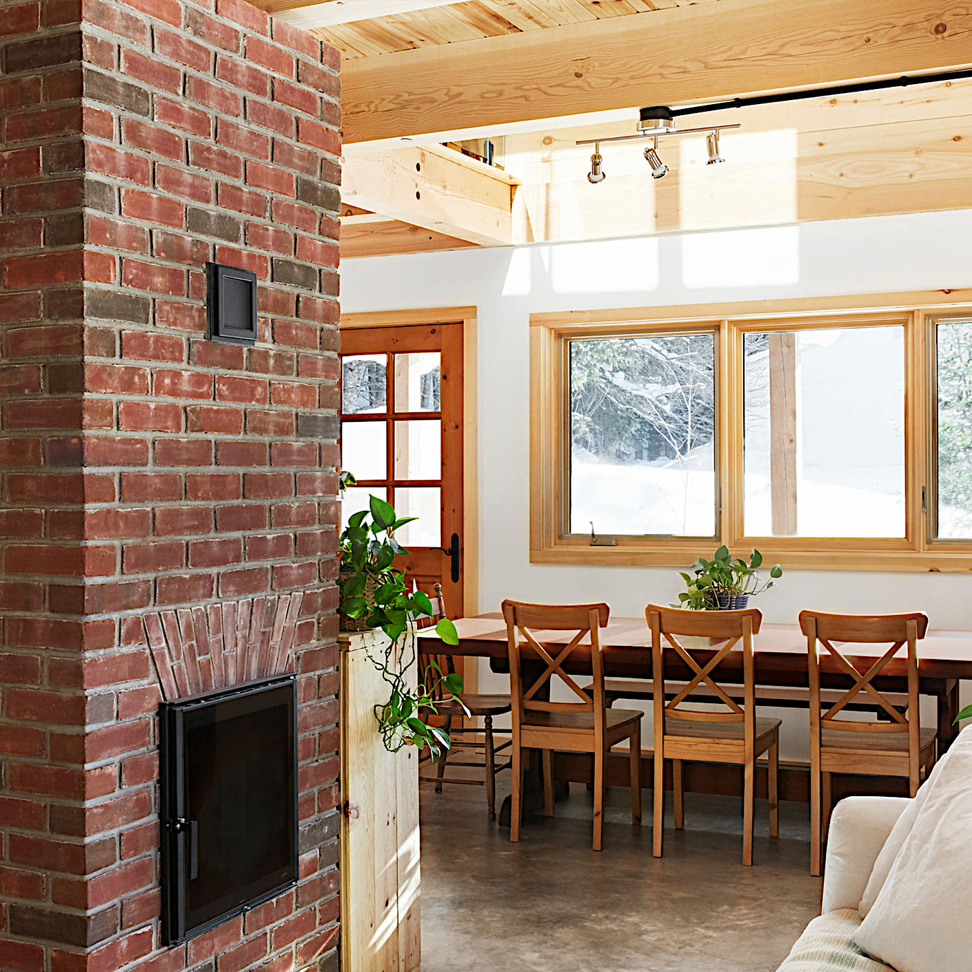 Du bois, du bois, encore du bois...cette maison respire le bois, autant à l'intérieur qu'à l'extérieur. Un matériau sain, écologique et durable. L'odeur que nous remarquons en entrant dans la résidence, nous rappelle celle des belles d'autrefois. De part sa pente de toit à deux versants, ses lucarnes en appentis et ses matériaux de revêtement simples, la résidence Fisette est inspirée des habitations de nos ancêtres.