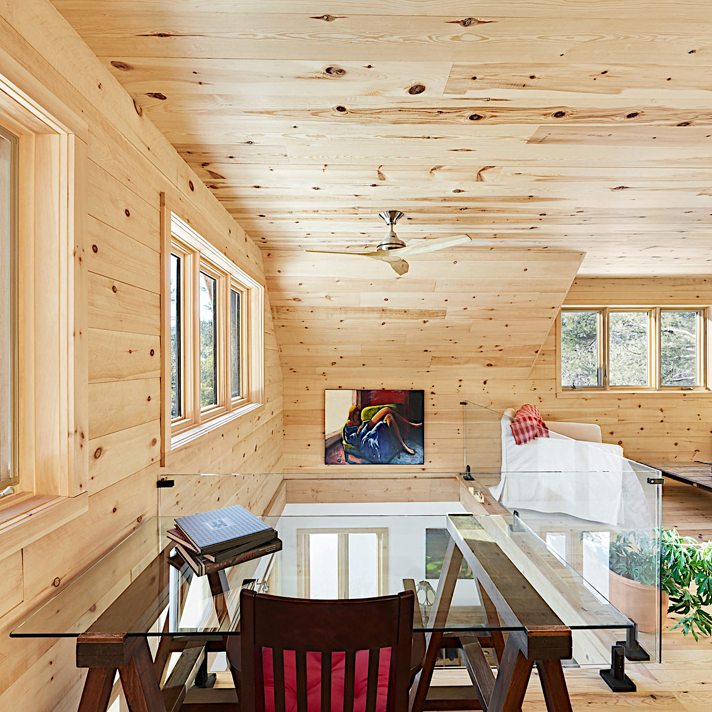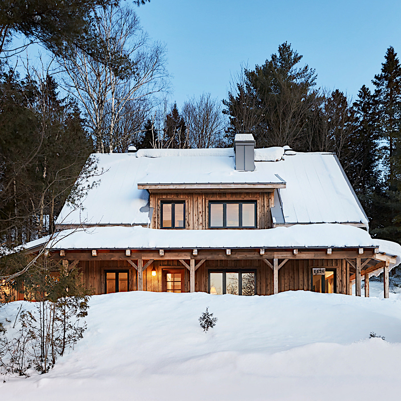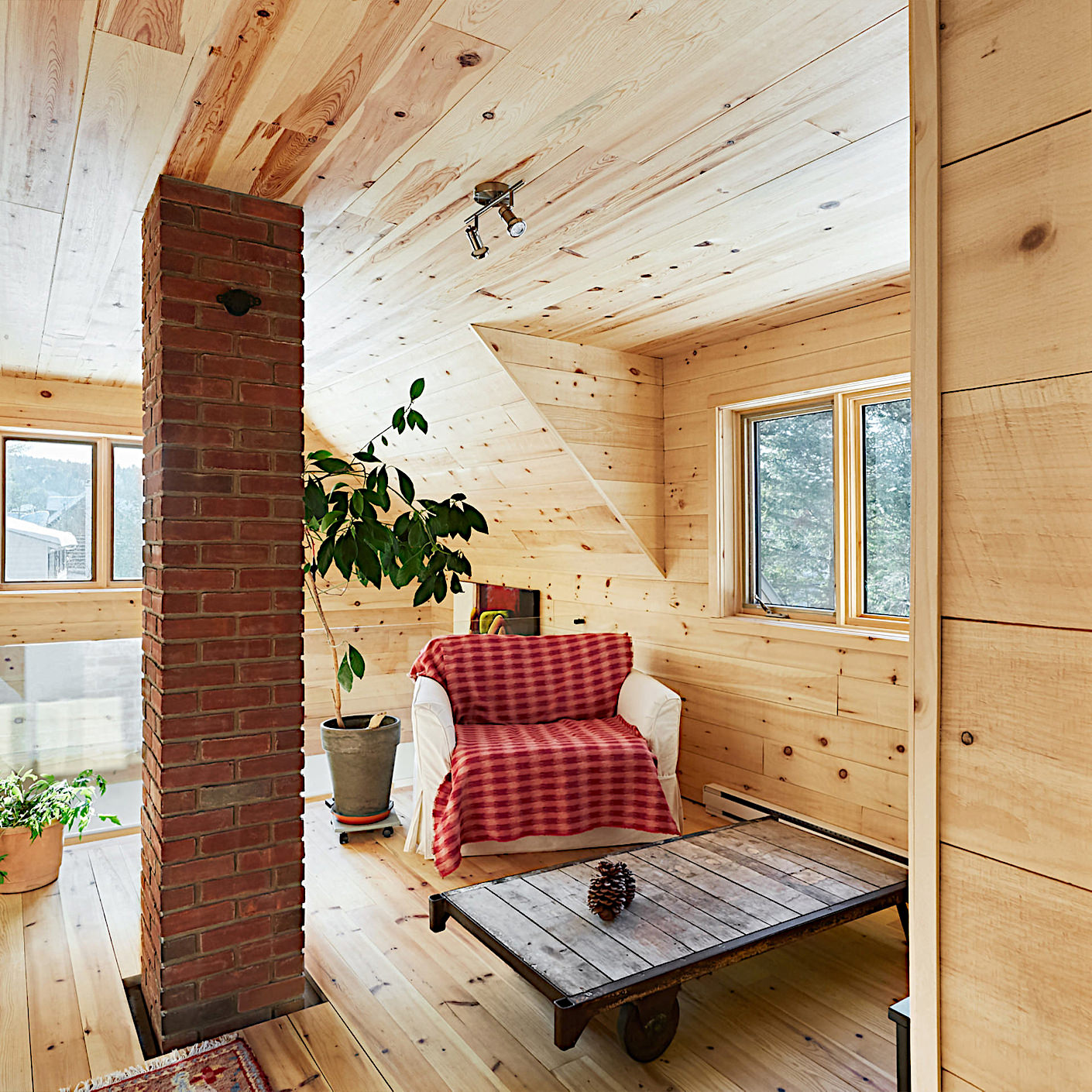 Nichée sur une petite colline, l'implantation ainsi que la position du soleil représentaient un défi .La montagne cache ce dernier et les rayons se pointent le bout du nez seulement qu'en après-midi. L'aménagement intérieur est donc maximisé afin que l'ensoleillement soit présent dans la cuisine et la salle à manger. Quant au boudoir, il longe le mur ouest, permettant une vue sur la rivière. Le cœur de la maisonnée est occupé par le foyer de masse, qui nous réchauffe lors des journées froides. Le second étage y loge 3 chambres compactes, un salle télé, un bureau et une salle d'eau. La mezzanine, ouverte sur la salle à manger, permet les échanges entre les membres de la famille, et abonde le rez-de-chaussée de lumière.