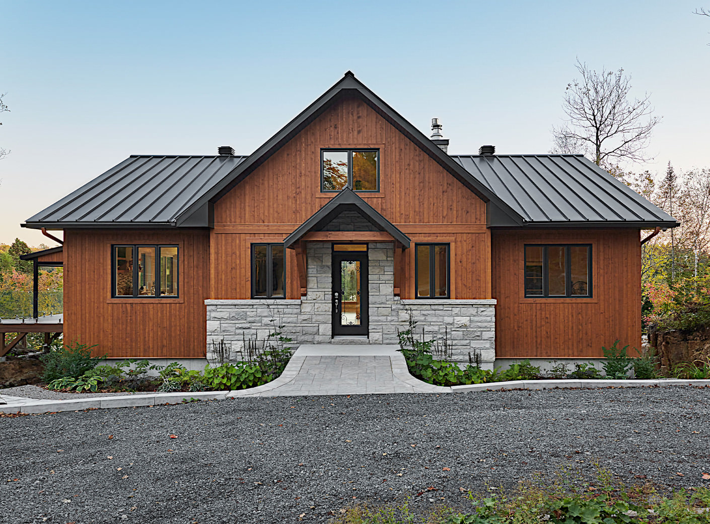 Les lignes architecturales sont classiques et rappellent les chalets de montagne communs aux Laurentides. Les matériaux tels la pierre, le bois et le verre restent intemporels et permettent une intégration tout en sobriété avec l'environnement.