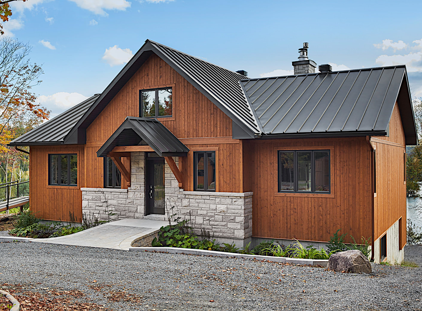 Un chalet avec une généreuse fenestration sur le lac, la nature et le soleil, offrant aux occupants la chance d'apprécier pleinement les saisons et les invitant à aller jouer dehors!