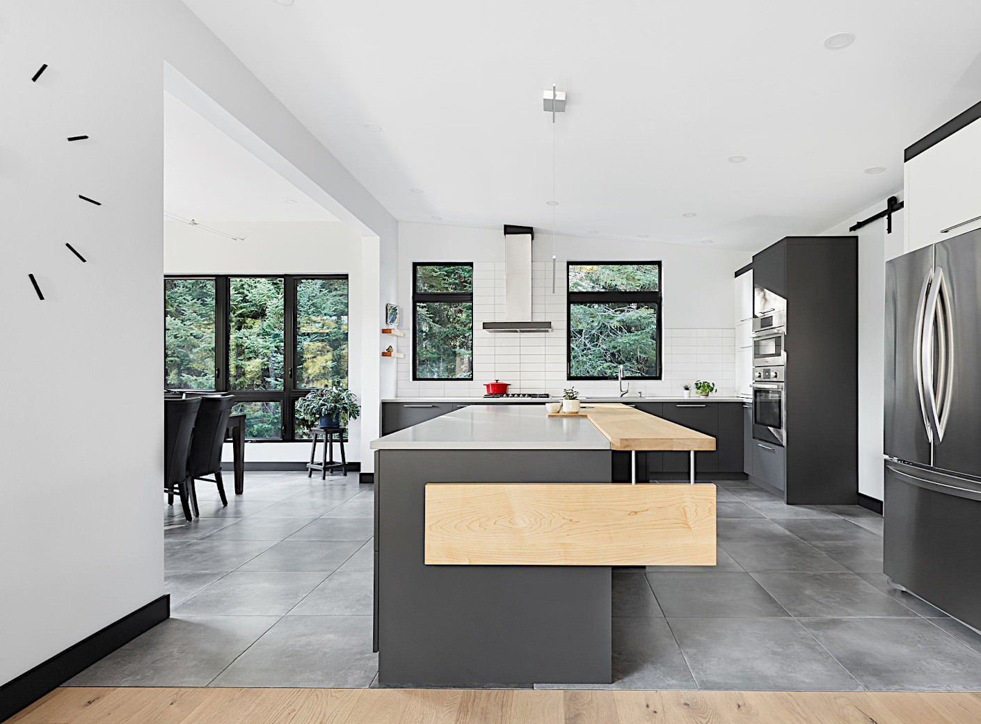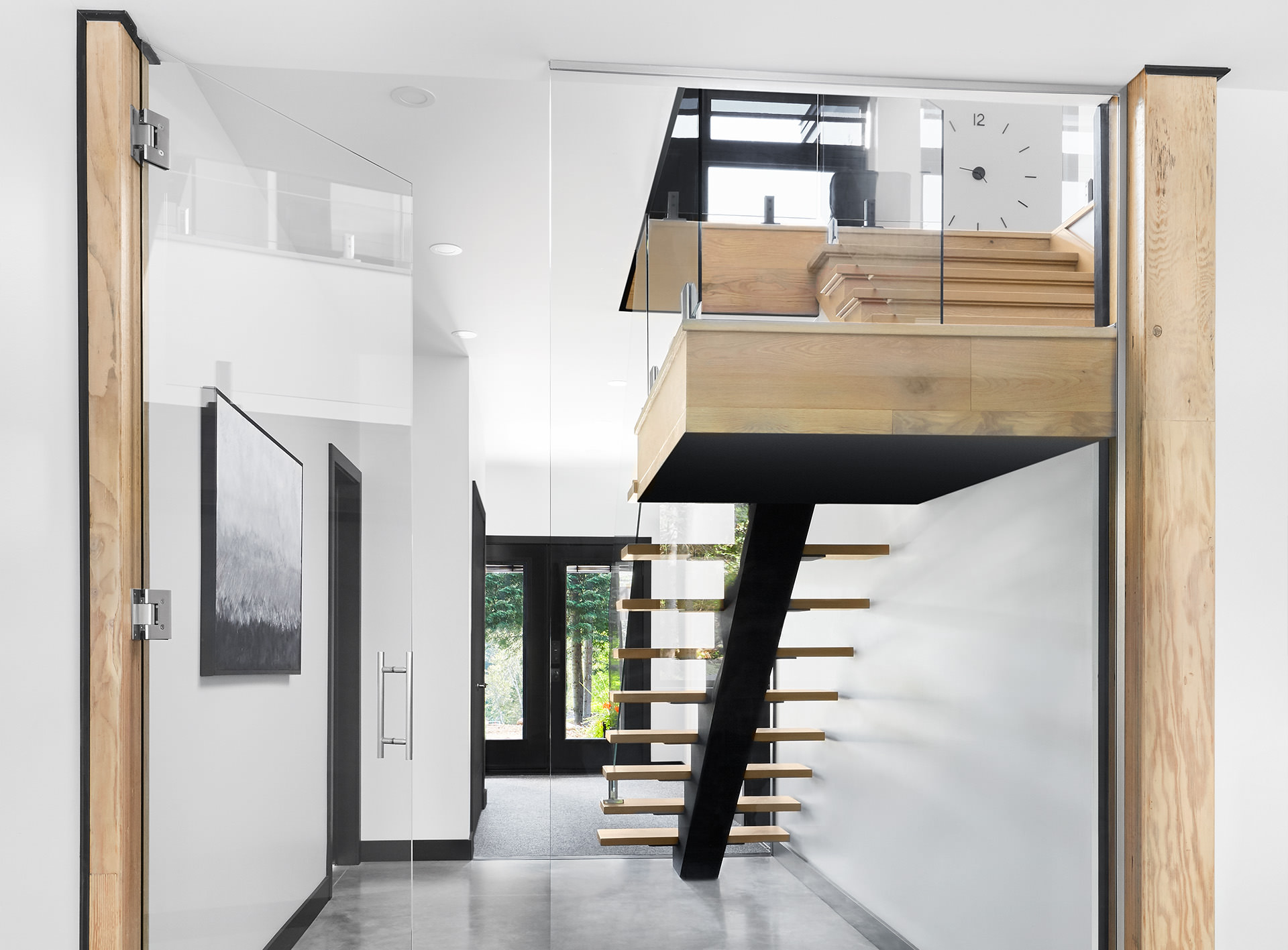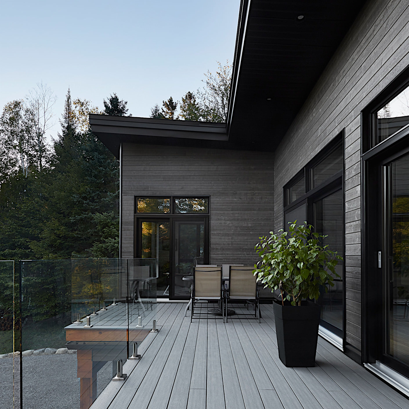 Le terrain idéal pour la maison de Mme Julien et M.Lalonde devait être choisi en fonction de l’accès aux sentiers de plein-air et aux activités nautiques. Située sur un terrain plat, la résidence de style contemporain s’élève sur 2 niveaux. Le rez-de-chaussée est principalement aménagé avec l’entrée principale, le garage, les aires de services et un atelier de poterie. L’escalier architectural menant au second étage flotte au milieu de l’espace, entre des panneaux de verre et le plancher de béton. Un mariage des textures qui se répète à plusieurs endroits, autant à l’intérieur qu’à l’extérieur de la demeure. Au second étage, on y trouve les aires de vie ainsi que 2 chambres, 2 salles de bains et un boudoir. Vous aurez deviné que la fenestration est orientée principalement au sud qui, heureusement, donne vue sur le lac et les montagnes val-morinoises…la vie est si bien faite 😊