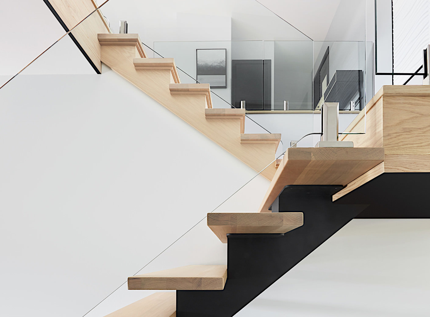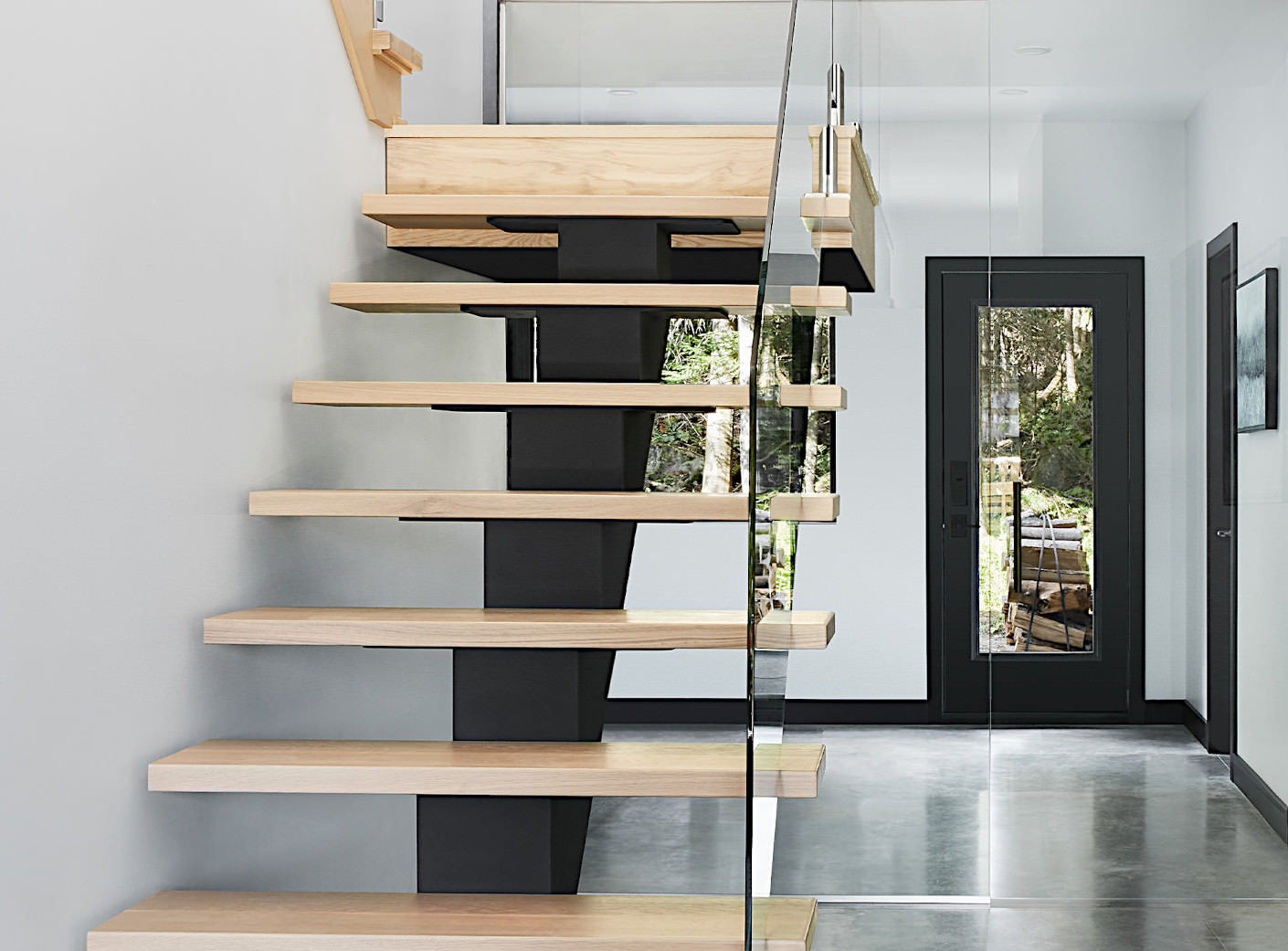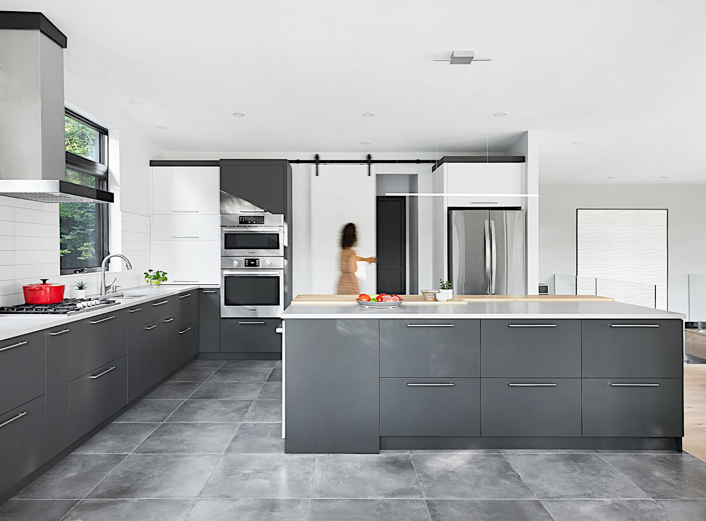 Le terrain idéal pour la maison de Mme Julien et M.Lalonde devait être choisi en fonction de l’accès aux sentiers de plein-air et aux activités nautiques. Située sur un terrain plat, la résidence de style contemporain s’élève sur 2 niveaux. Le rez-de-chaussée est principalement aménagé avec l’entrée principale, le garage, les aires de services et un atelier de poterie. L’escalier architectural menant au second étage flotte au milieu de l’espace, entre des panneaux de verre et le plancher de béton. Un mariage des textures qui se répète à plusieurs endroits, autant à l’intérieur qu’à l’extérieur de la demeure. Au second étage, on y trouve les aires de vie ainsi que 2 chambres, 2 salles de bains et un boudoir. Vous aurez deviné que la fenestration est orientée principalement au sud qui, heureusement, donne vue sur le lac et les montagnes val-morinoises…la vie est si bien faite 😊