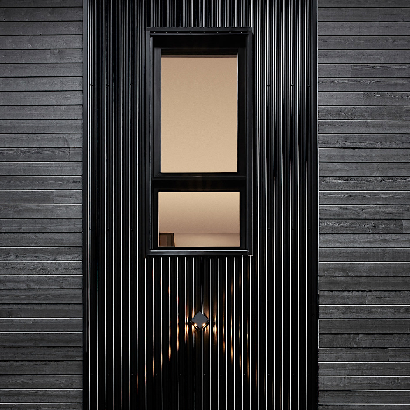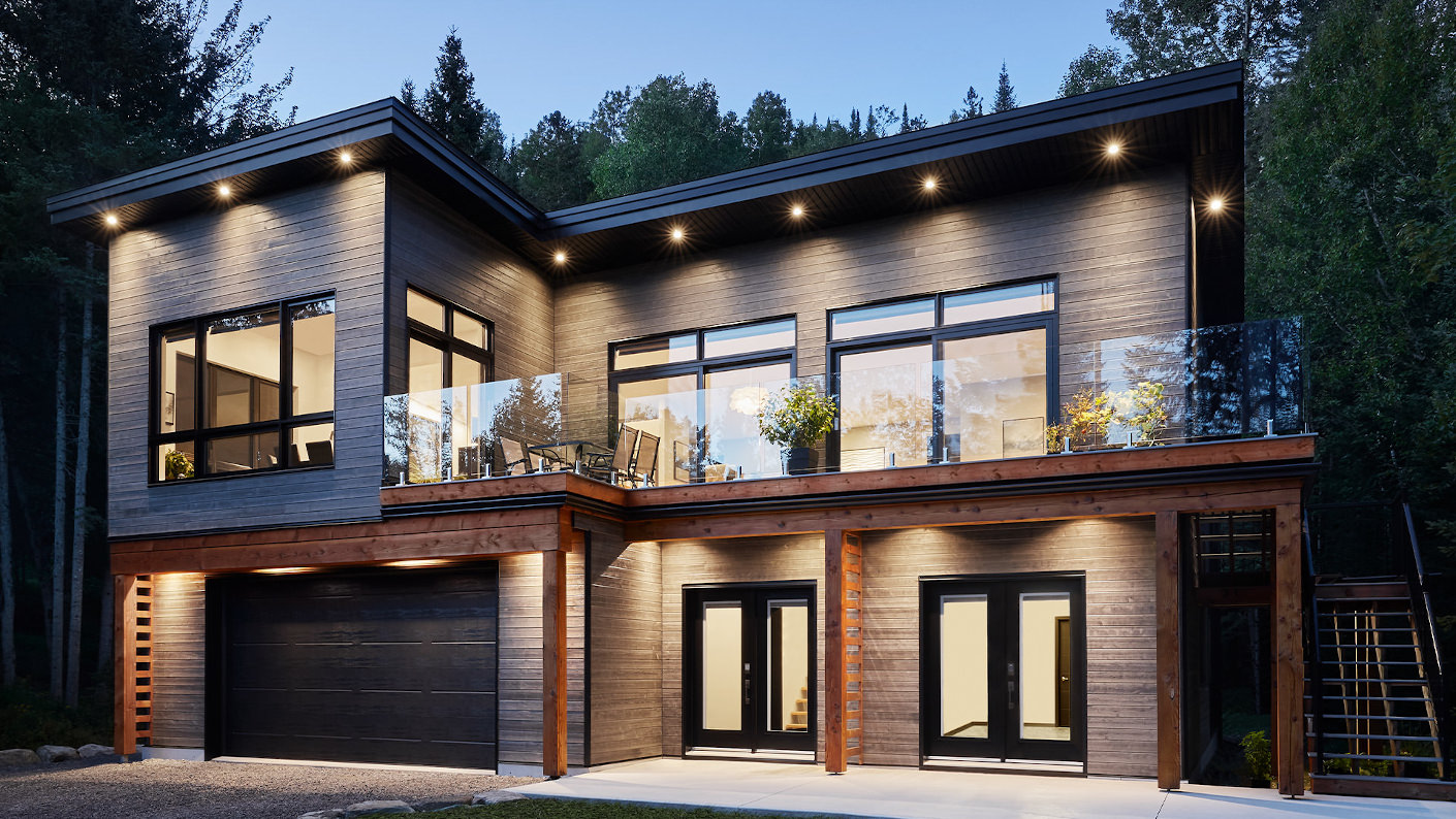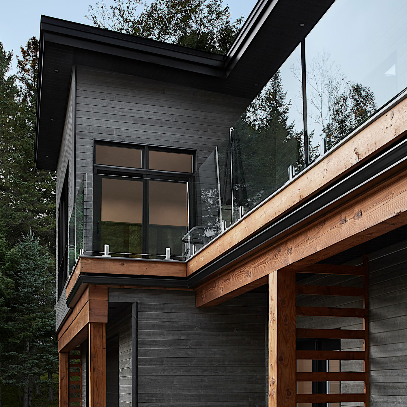La volumétrie asymétrique de la façade principale est mise en valeur par le porte-à faux au- dessus du garage, les murets intimité ajourés, le jeux des poutres de bois et la terrasse. Le toit monopente orienté nord- sud, permet l’ajout de fenêtres en imposte au-dessus des ouvertures côté soleil. Principalement de bois vêtue, le revêtement de teinte foncé vient assumer l’aspect contemporain de la maison, ainsi que les touches de couleur noir retrouvées dans les fenêtres, portes, soffites et revêtement d’aluminium.