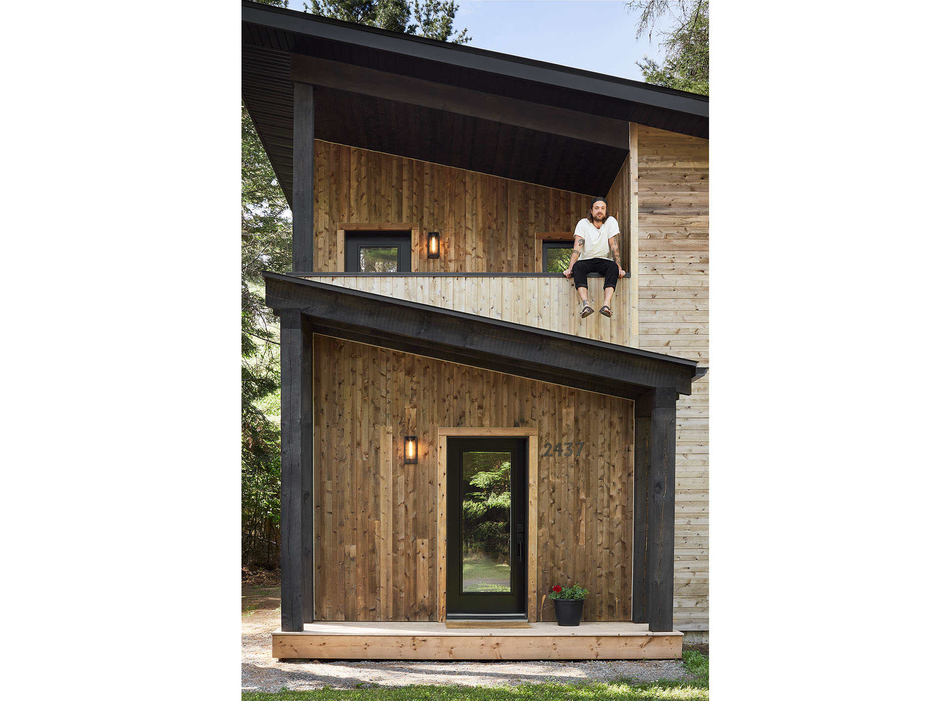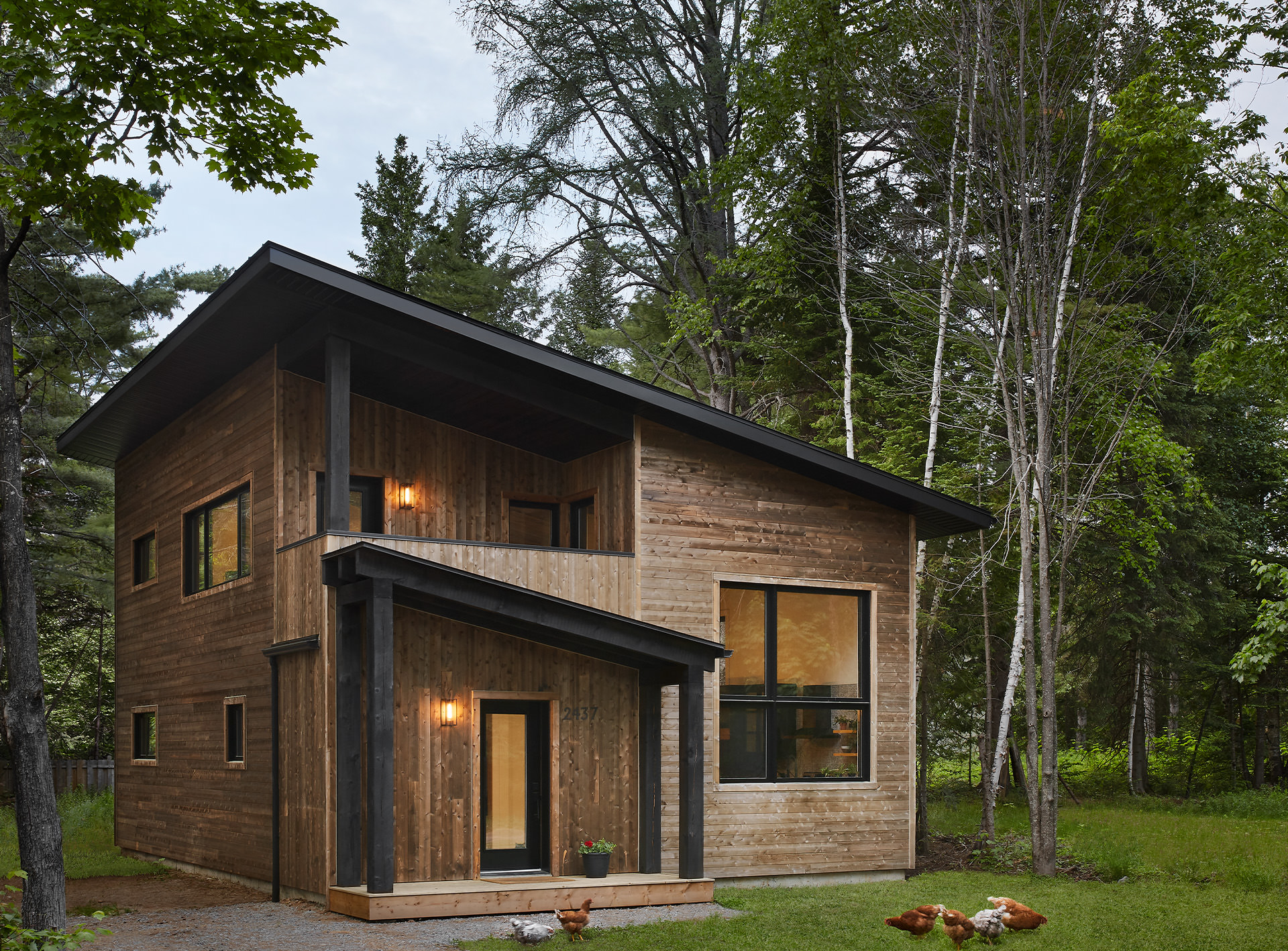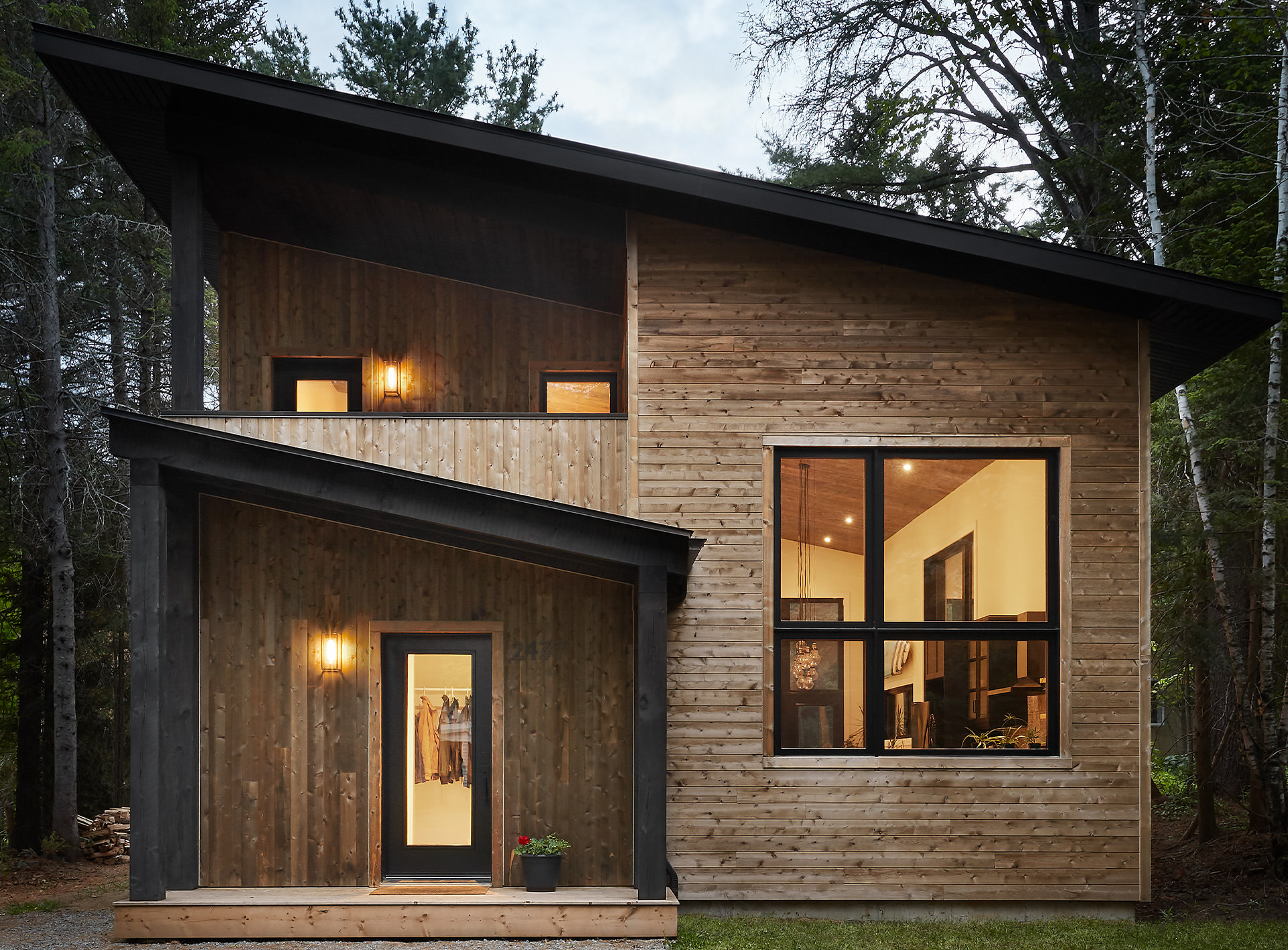 Le toit principal mono pente, couvrant le petit balcon avant, est orienté du Nord au Sud. Le garde-corps de l’étage, tel un mur aveugle, assure une certaine intimité. La répétition du toit vient situer l’entrée et est délimitée par les poteaux et poutres de bois teints de couleur noir. Les jeux de revêtement mural en cèdre naturel, planches de bois verticales et horizontales, accentuent les retraits et les volumes de l’ensemble architectural.
