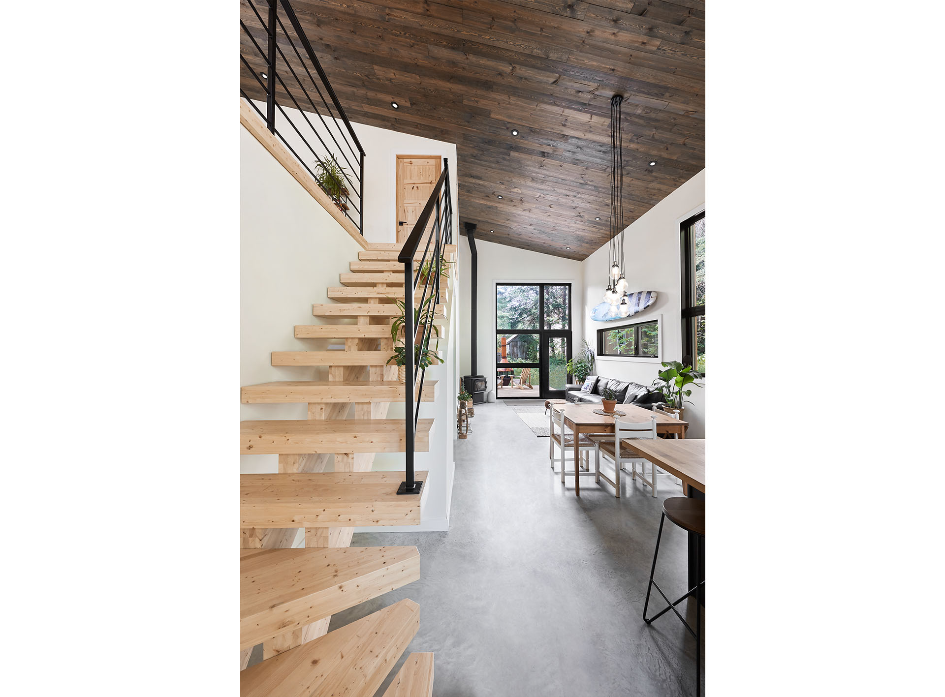 Vu la petitesse du terrain, les limites de superficie habitable imposaient une architecture sur 2 niveaux. Parmi les défis, la maison voisine est très près de la résidence projetée et est localisée au Sud. Nous avons alors opté pour maximiser l’entrée de lumière au lever et au coucher de soleil avec de grandes ouvertures à l’avant et à l’arrière de la maison. Malgré sa petite taille, cette résidence comporte tout de même 2 chambres à coucher, un bureau et une aire de vie pratique et confortable. Un escalier unique, conçu par un artisan local, est le cœur même de la maison. Pour ne pas négliger le potentiel lumineux venant du sud, une mezzanine ouverte, avec son plafond cathédral, a été aménagée de ce côté. De plus, un petit balcon à l’étage permet d’apprécier les levers du jour en sirotant le café du matin, et la grande terrasse à l’ouest ouvre l’espace sur la cour arrière.