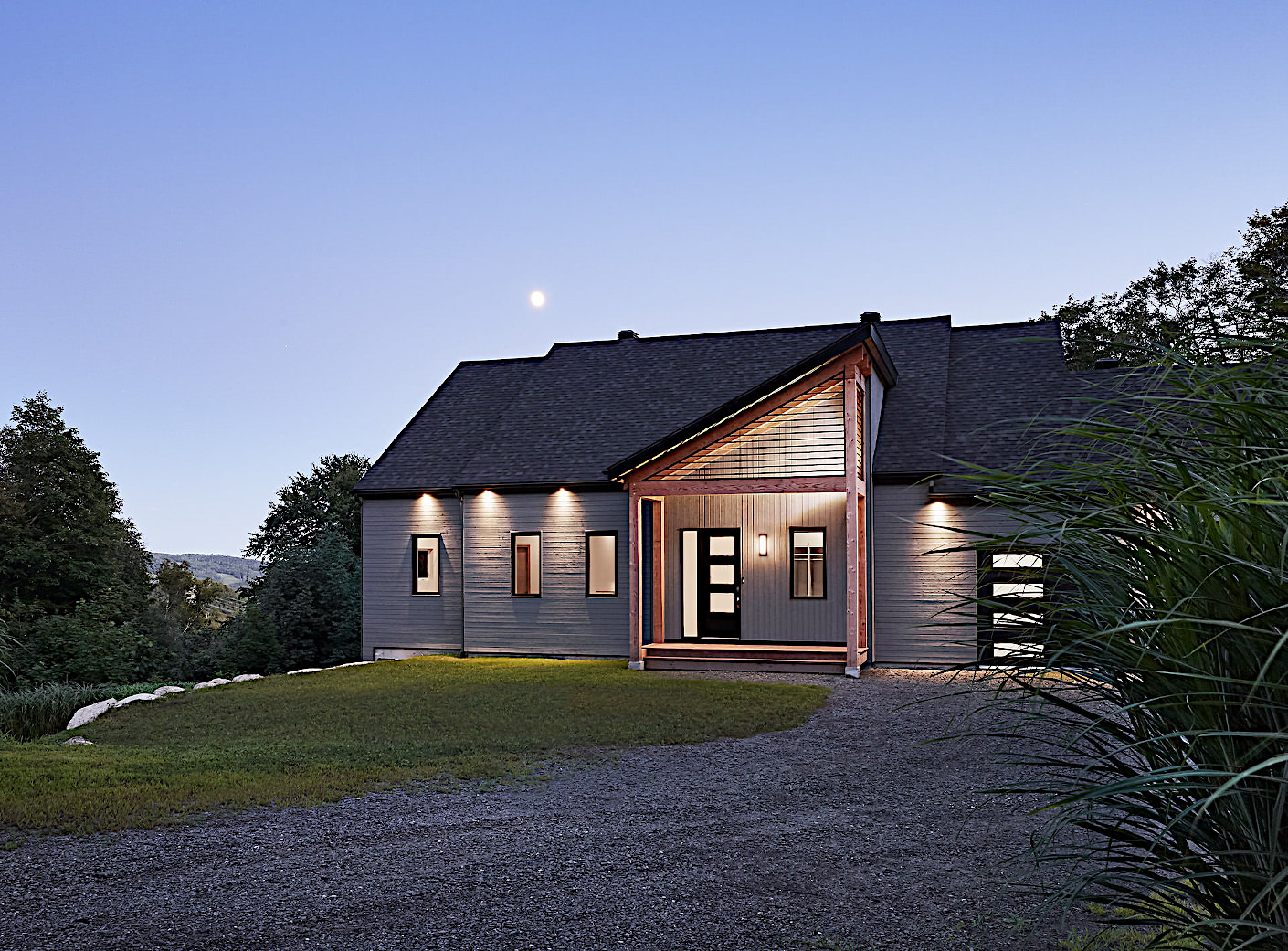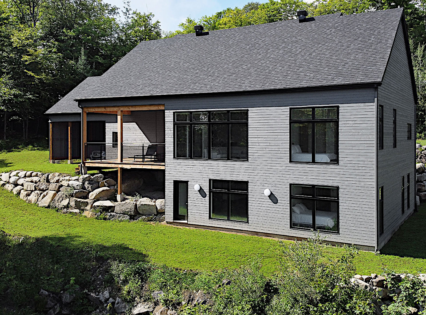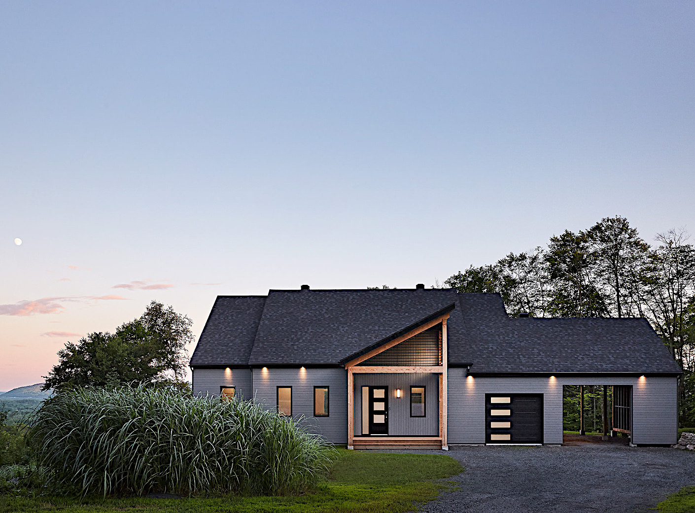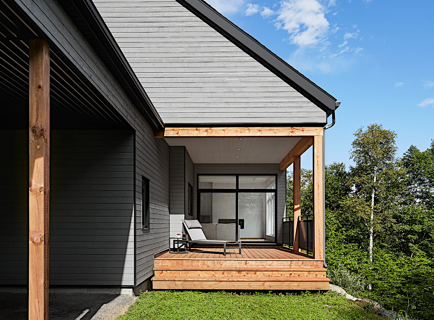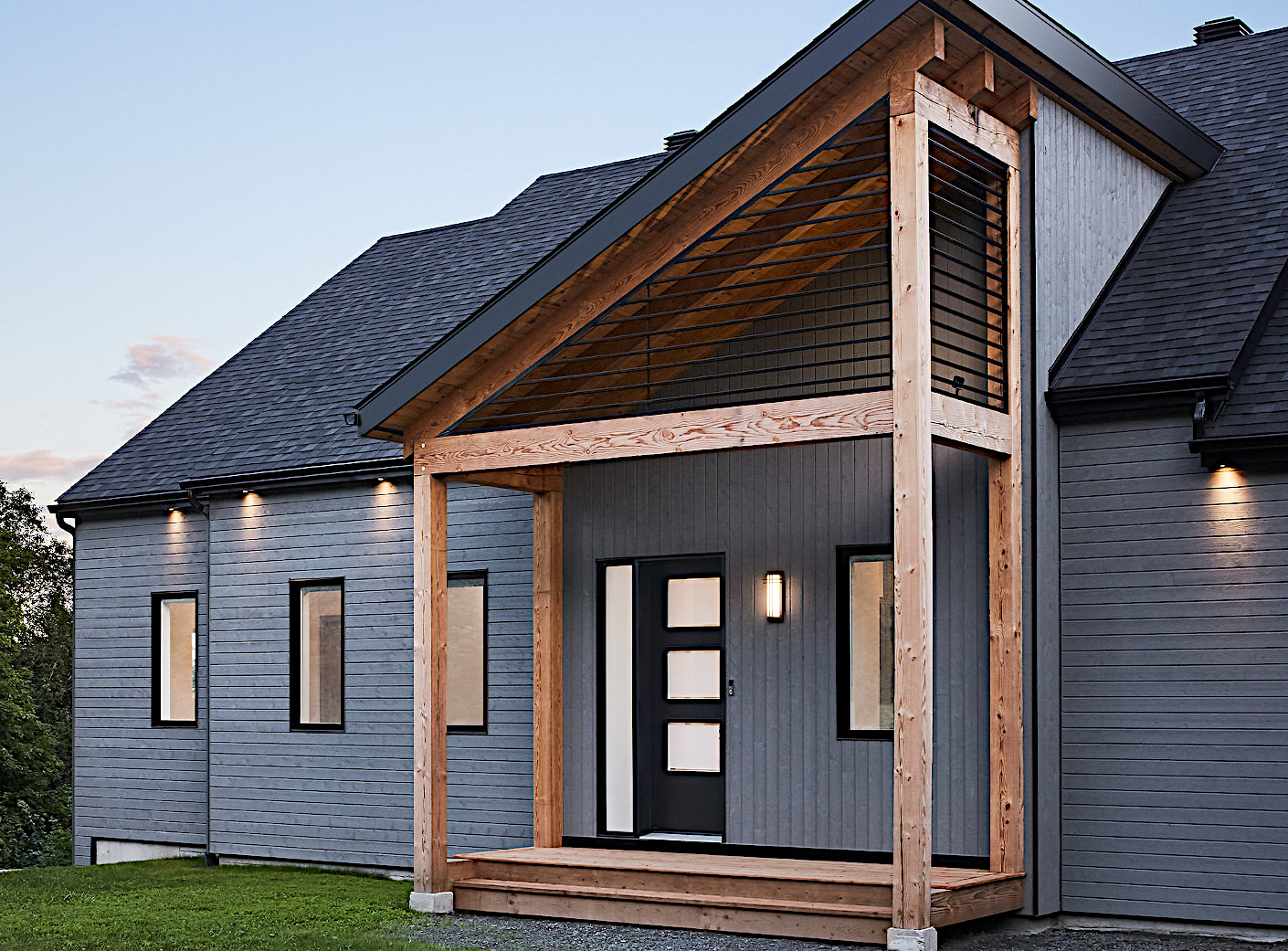 Le revêtement de bois extérieur foncé et son fini lisse, les débordements de toit peu prononcés, la touche de bois naturel pour les balcons et terrasses ainsi que les grandes fenêtres donne un aspect moderne et intemporel à l’ensemble architectural de la maison de M.Ménard. Le porche d’entrée unique de par sa pente de toit différente du bâtiment et par le treillis d’aluminium dans le pignon, dynamise la façade en créant des effets lumineux lorsque la nuit tombe.