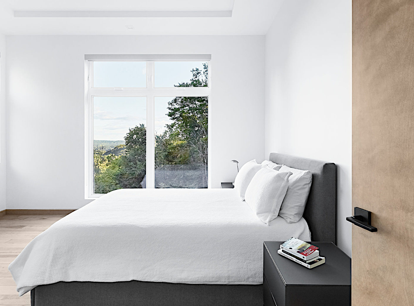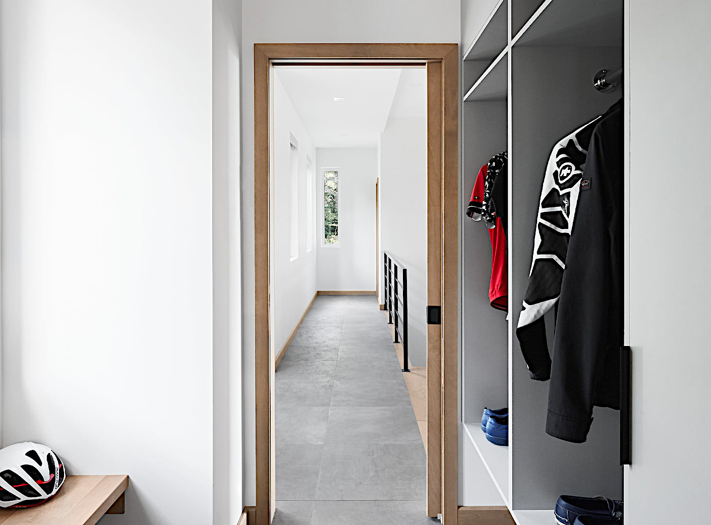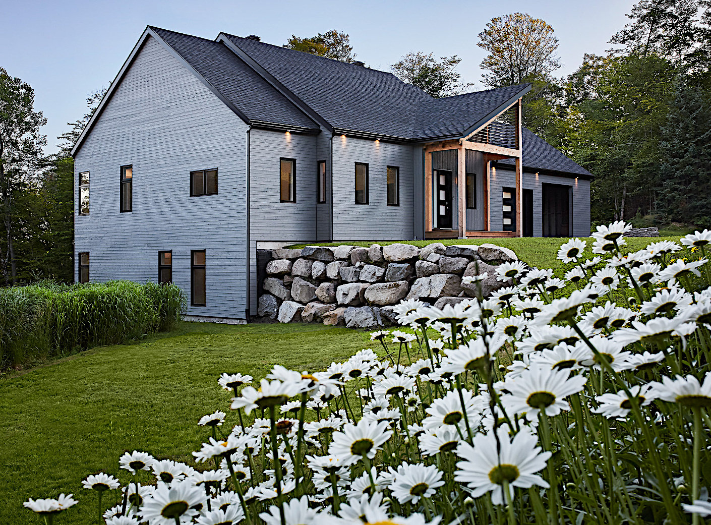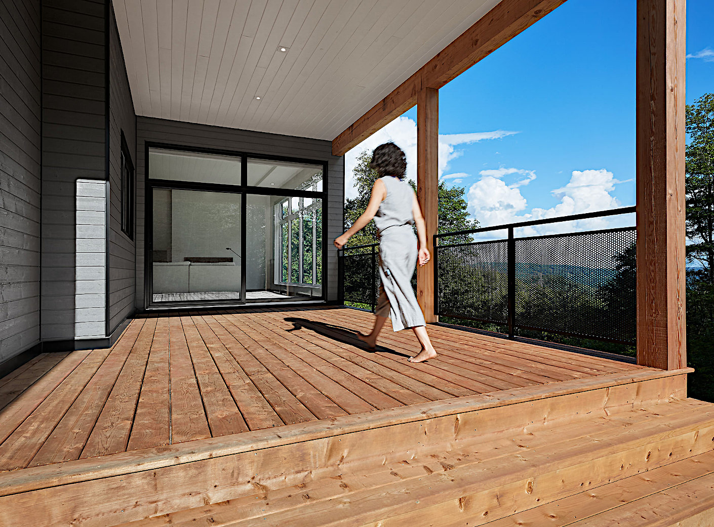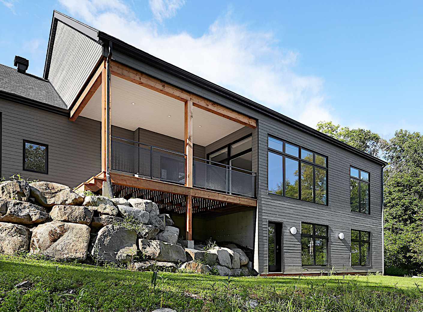 Le revêtement de bois extérieur foncé et son fini lisse, les débordements de toit peu prononcés, la touche de bois naturel pour les balcons et terrasses ainsi que les grandes fenêtres donne un aspect moderne et intemporel à l’ensemble architectural de la maison de M.Ménard. Le porche d’entrée unique de par sa pente de toit différente du bâtiment et par le treillis d’aluminium dans le pignon, dynamise la façade en créant des effets lumineux lorsque la nuit tombe.