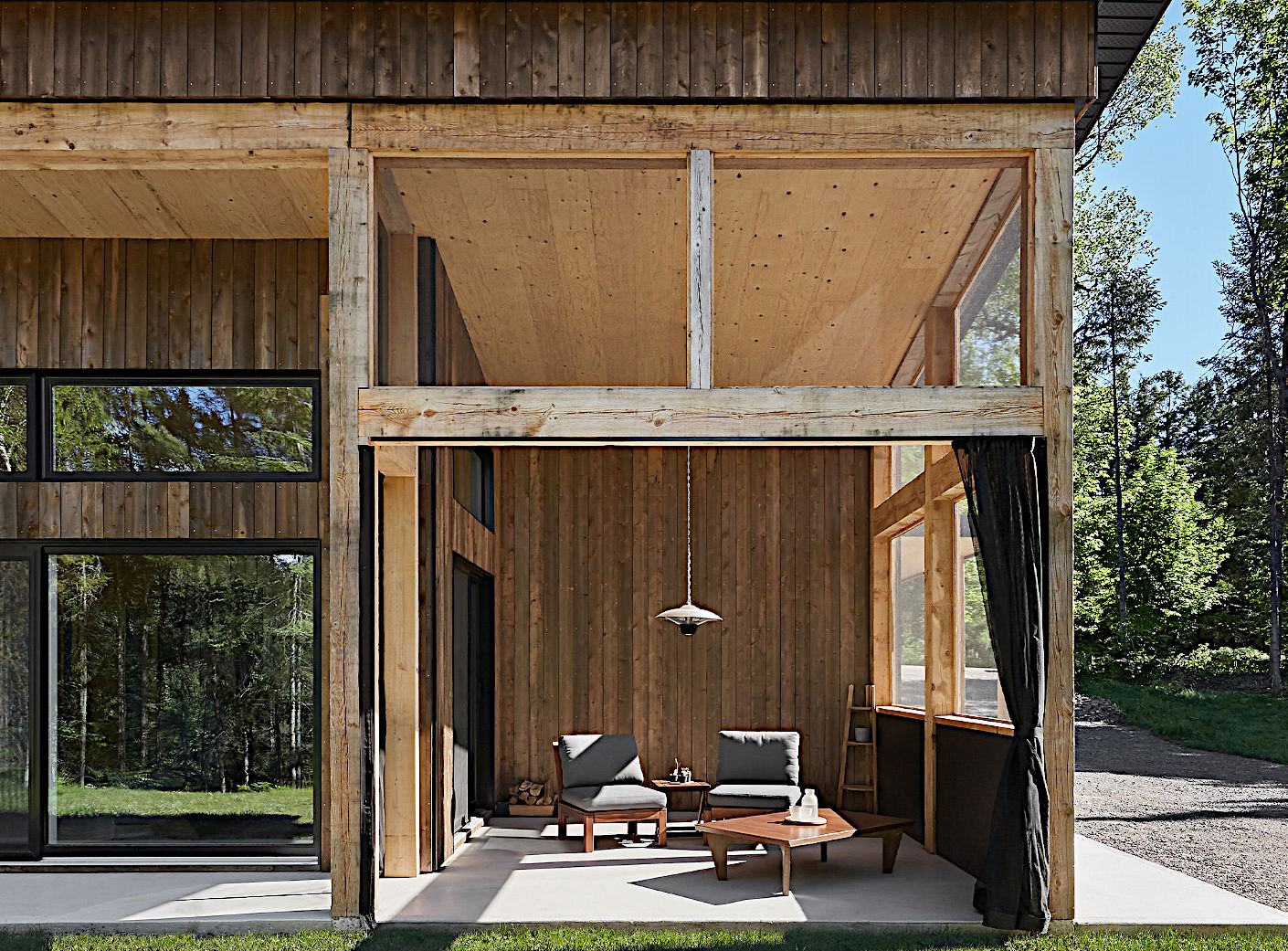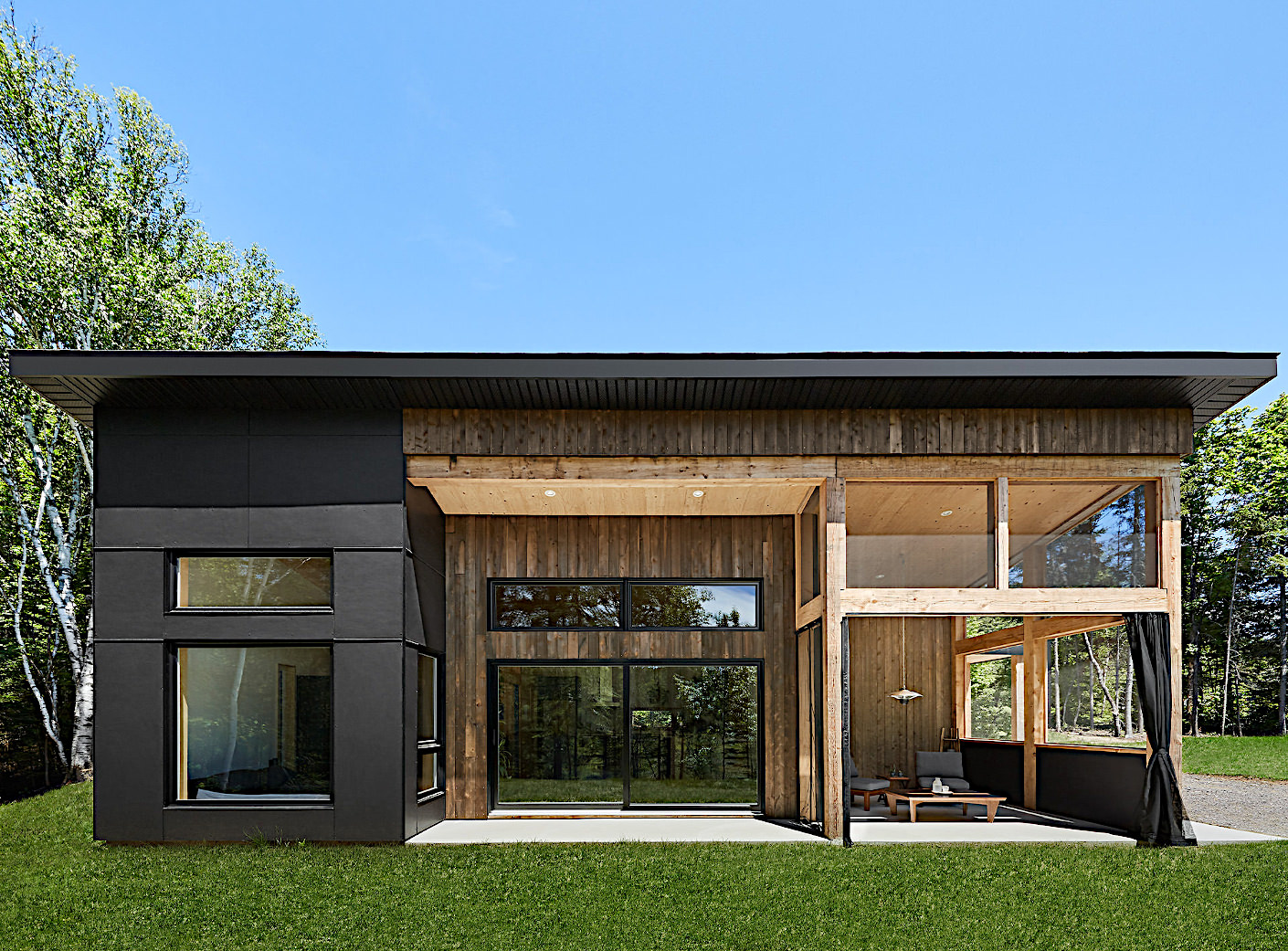L’architecture de la résidence du MARAIS est marquée par le toit principal mono pente et ses matériaux extérieurs naturels, tels que le revêtement de cèdre grisonnant. L’entrée principale se démarque par son toit plat et les panneaux de fibrociment peints de couleur noir. De larges poutres et poteaux de bois encadrent la véranda et la petite terrasse couverte.