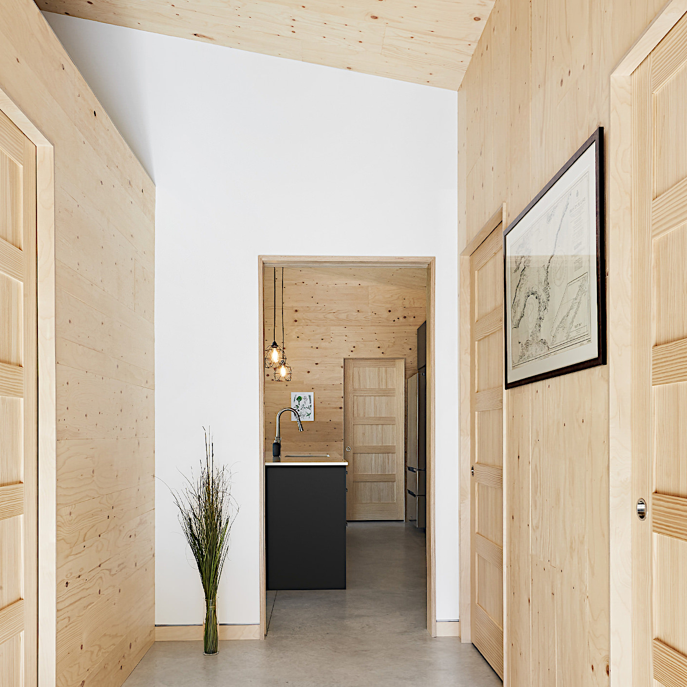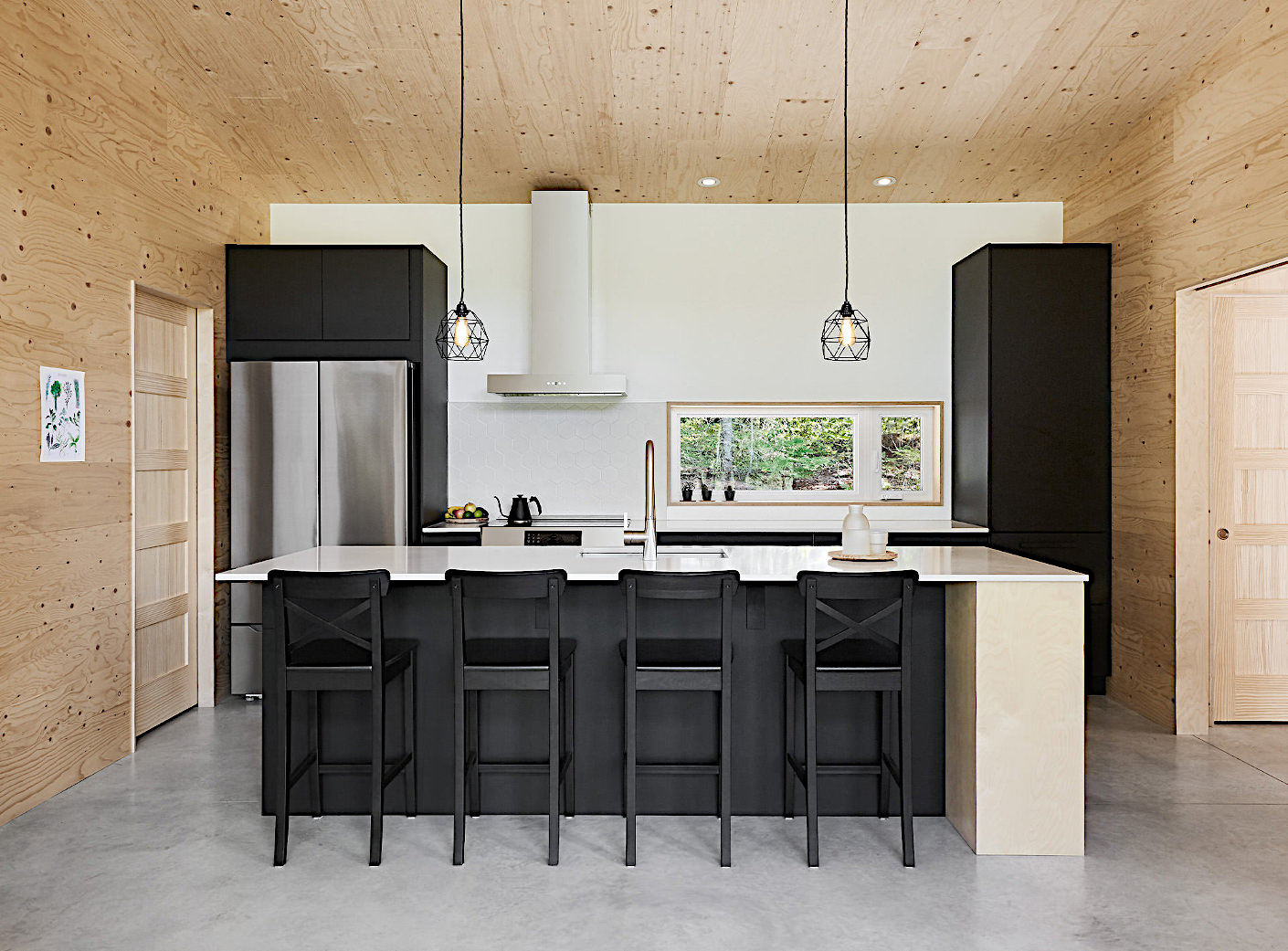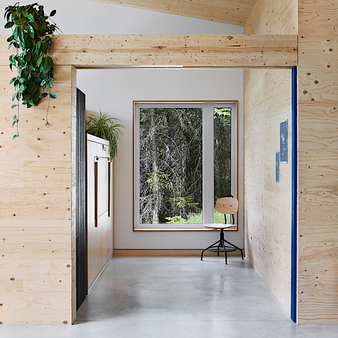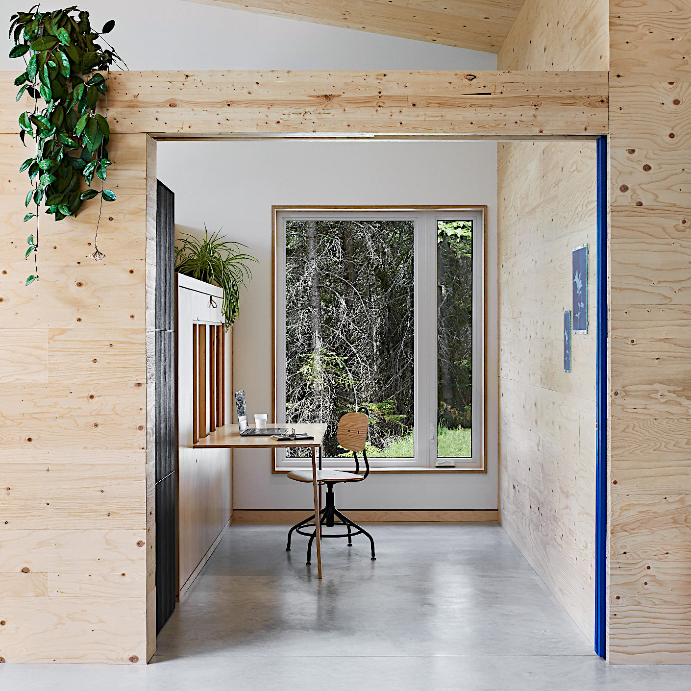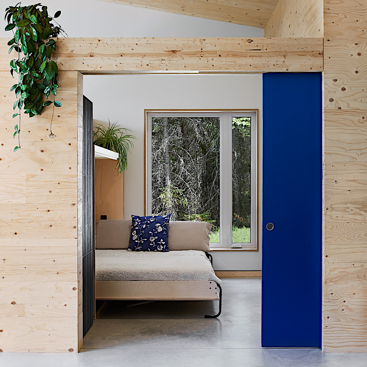 De par sa nature humide, l’implantation de la future résidence se devait de respecter la zone de protection du marais et imposait donc une superficie restreinte. Implantée sur un terrain plat, la résidence de nature contemporaine se présente sur un seul plancher et ne dépasse pas les 860 pi2 (80m2). En forme de « U », la volumétrie permet à la chambre à coucher principale et à la véranda moustiquaire de s’avancer vers la nature, tandis que l’aire de vie se retire pour plus d’intimité. Le plafond cathédral, recouvert de panneaux de contreplaqué récupérés, apporte une touche unique à l’ensemble architectural. Une abondance de lumière venant de la fenestration située au sud, inonde toute la maisonnée, du matin au soir. Afin de conserver le minimum de superficie, les pièces sont pensées afin de répondre à plusieurs usages à la fois. La salle de yoga se transforme en 2 clics en bureau de travail et aussi rapidement en chambre d’amis. La table de salon se converti en table à manger pour 6 personnes et hop ! par ici la visite. L’entrée est compacte, tout en longeant garde-robe, salle mécanique, salle de lavage et vélos.