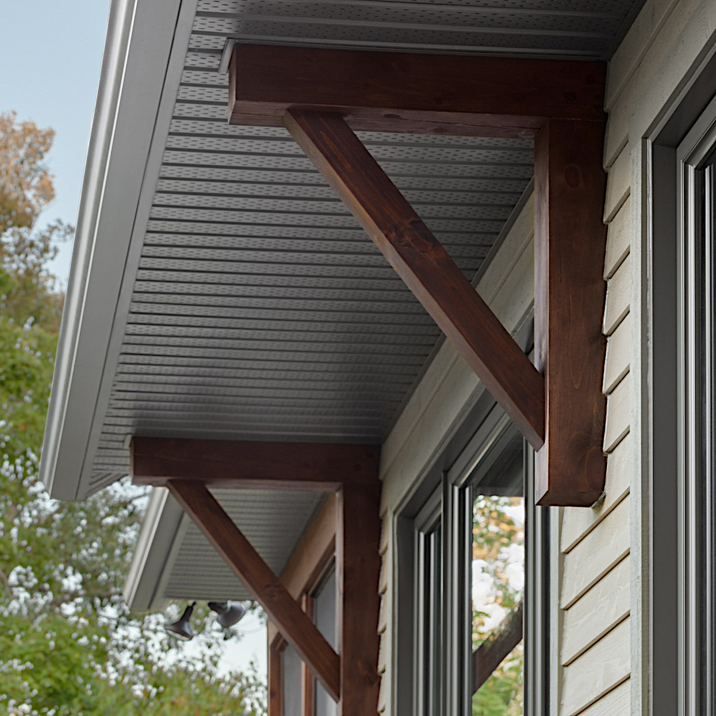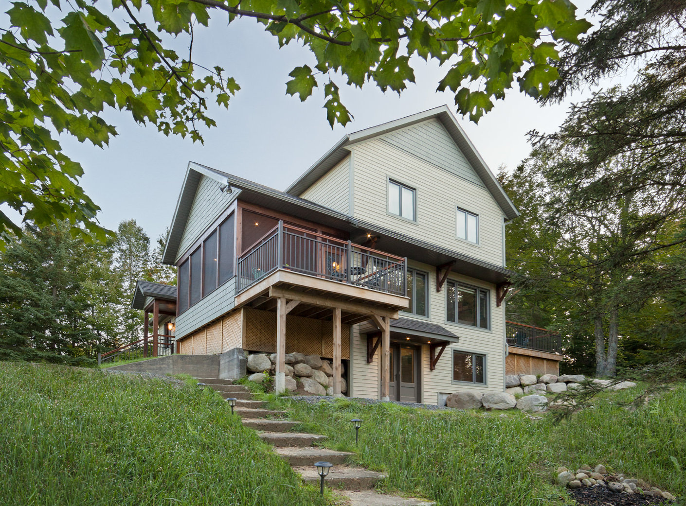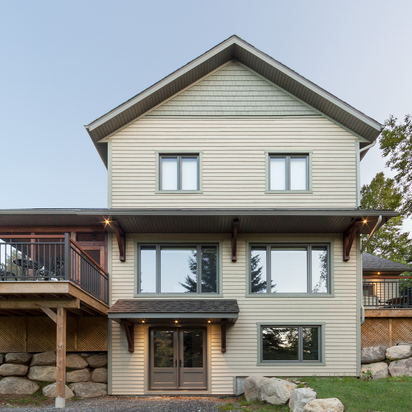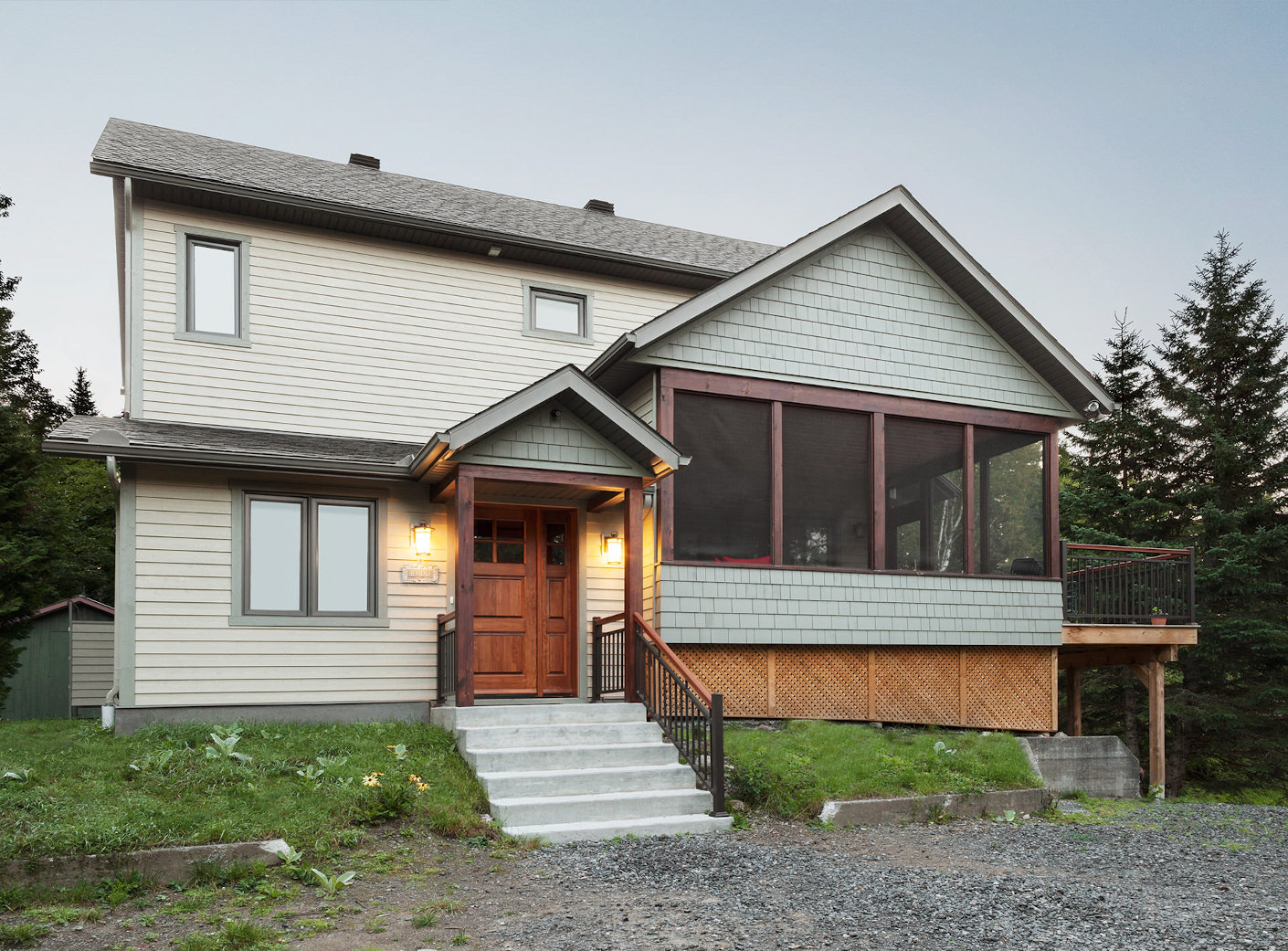 Afin de réduire les coûts de construction, les fondations existantes de la maison, ainsi que certains murs sont restés intacts. Entièrement revêtit de bois, l’extérieur reste sobre et classique avec des teintes inspirées de la nature et du paysage laurentien qui l’entoure.