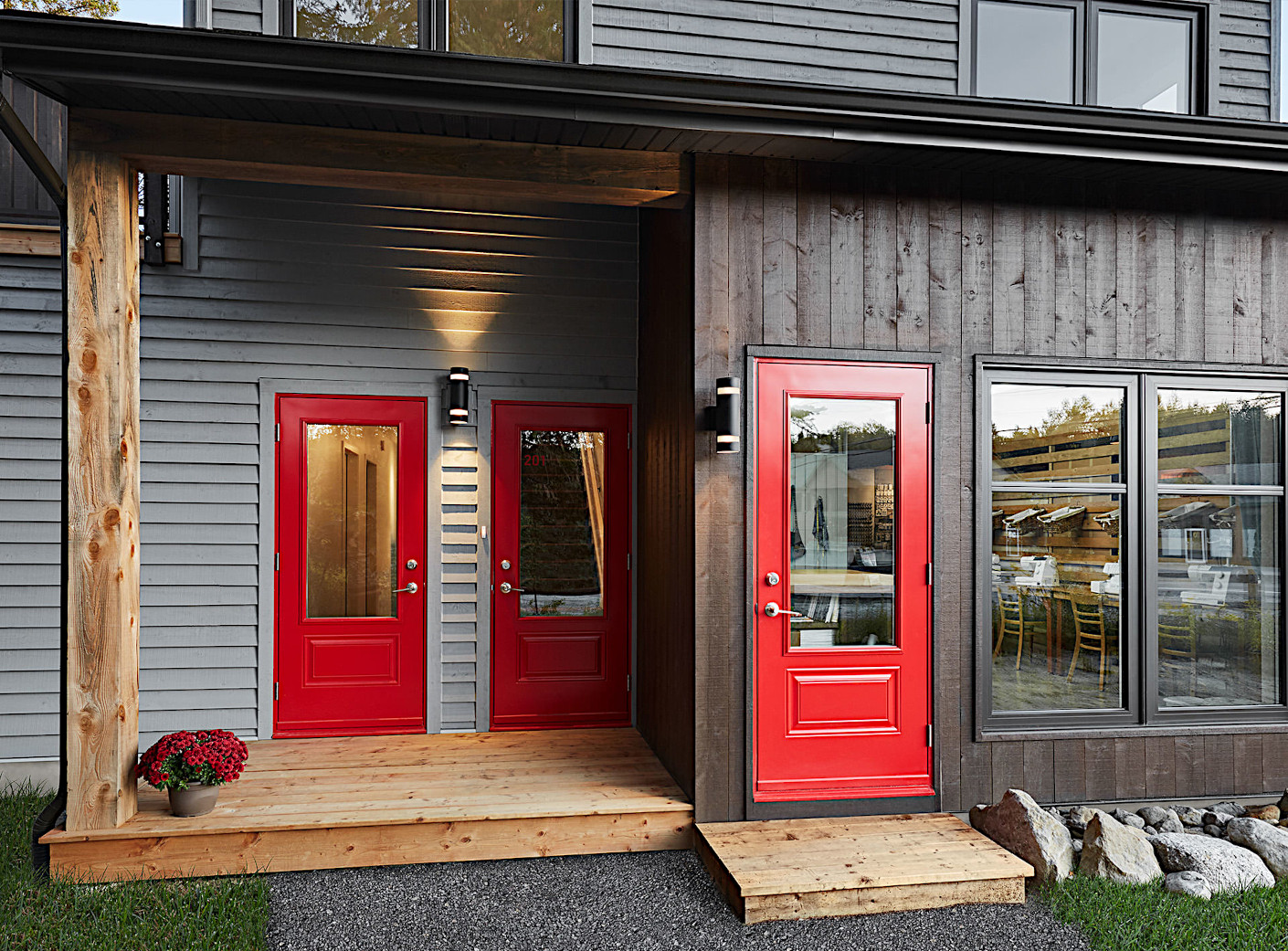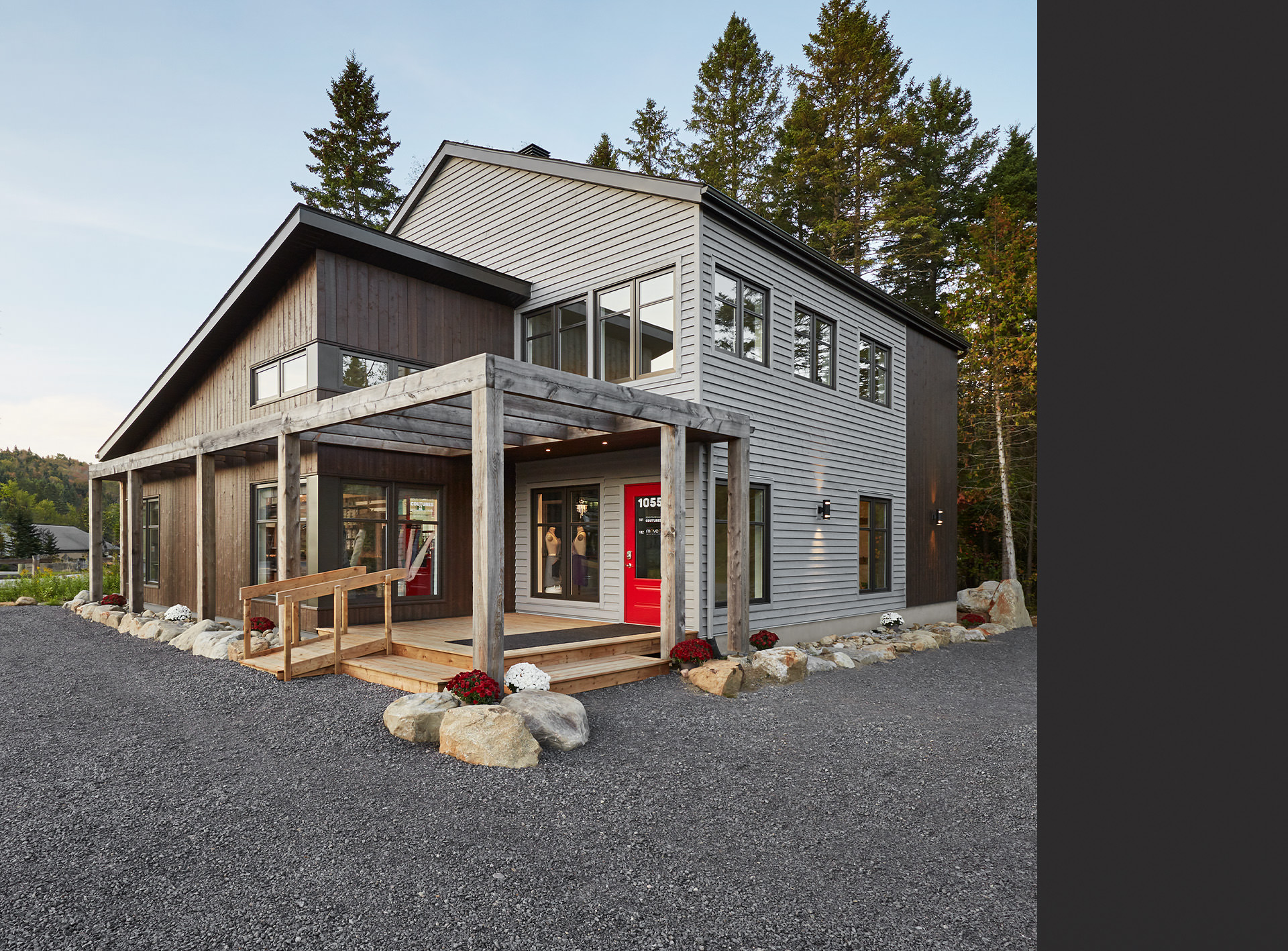 Cette construction s'intègre parfaitement dans la trame commerciale de Val-David contribuant à bonifier la qualité architecturale du cadre bâti de ce secteur de la route 117.