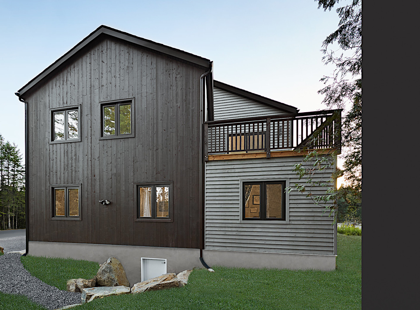 Lise rêvait d'un lieu de travail gorgé de lumière et de chaleur. René désirait un bâtiment aux allures contemporaines tout en s'intégrant à l'architecture laurentienne de Val-David. Les propriétaires peuvent maintenant dire que leurs souhaits sont réalisés!