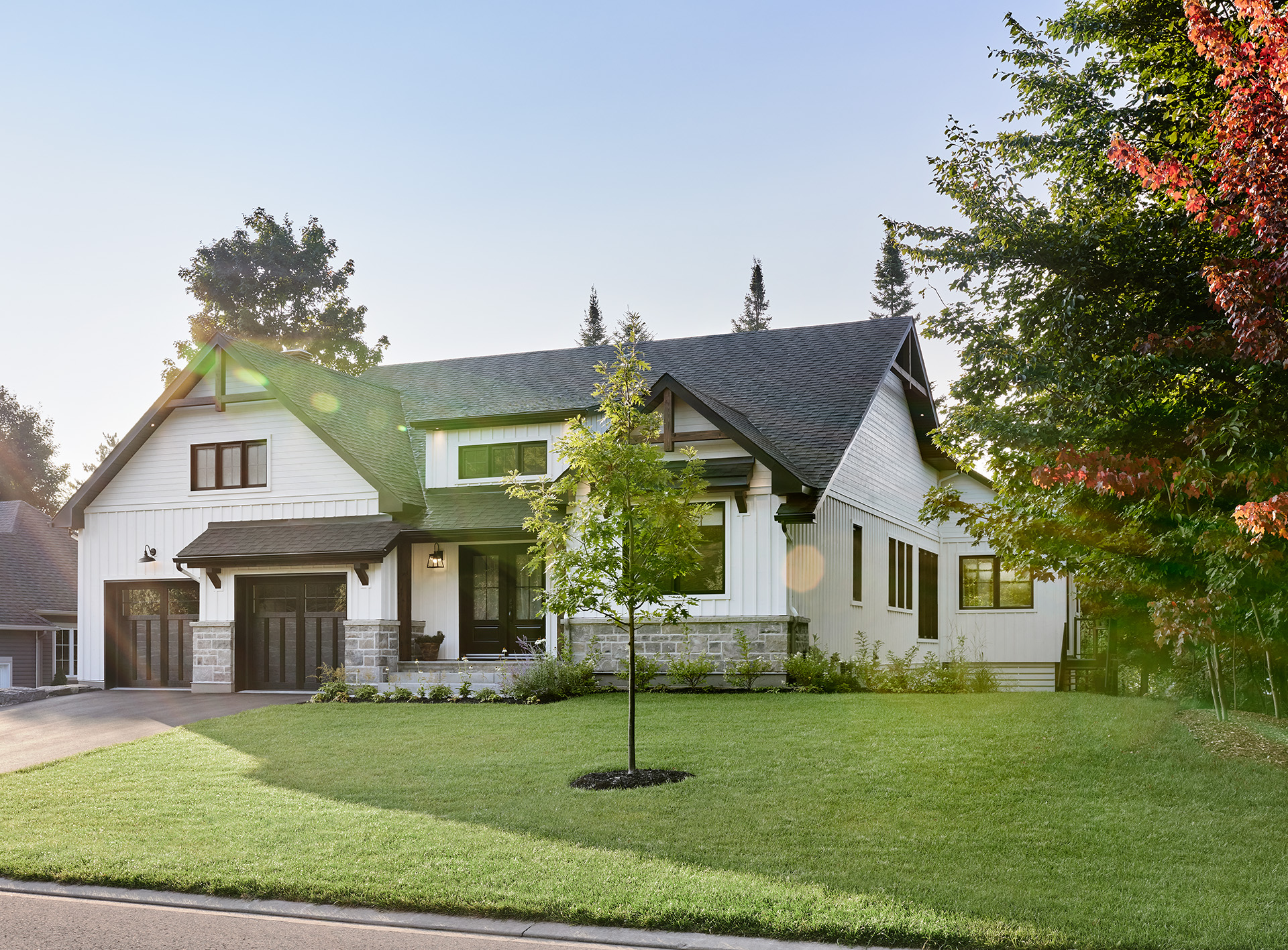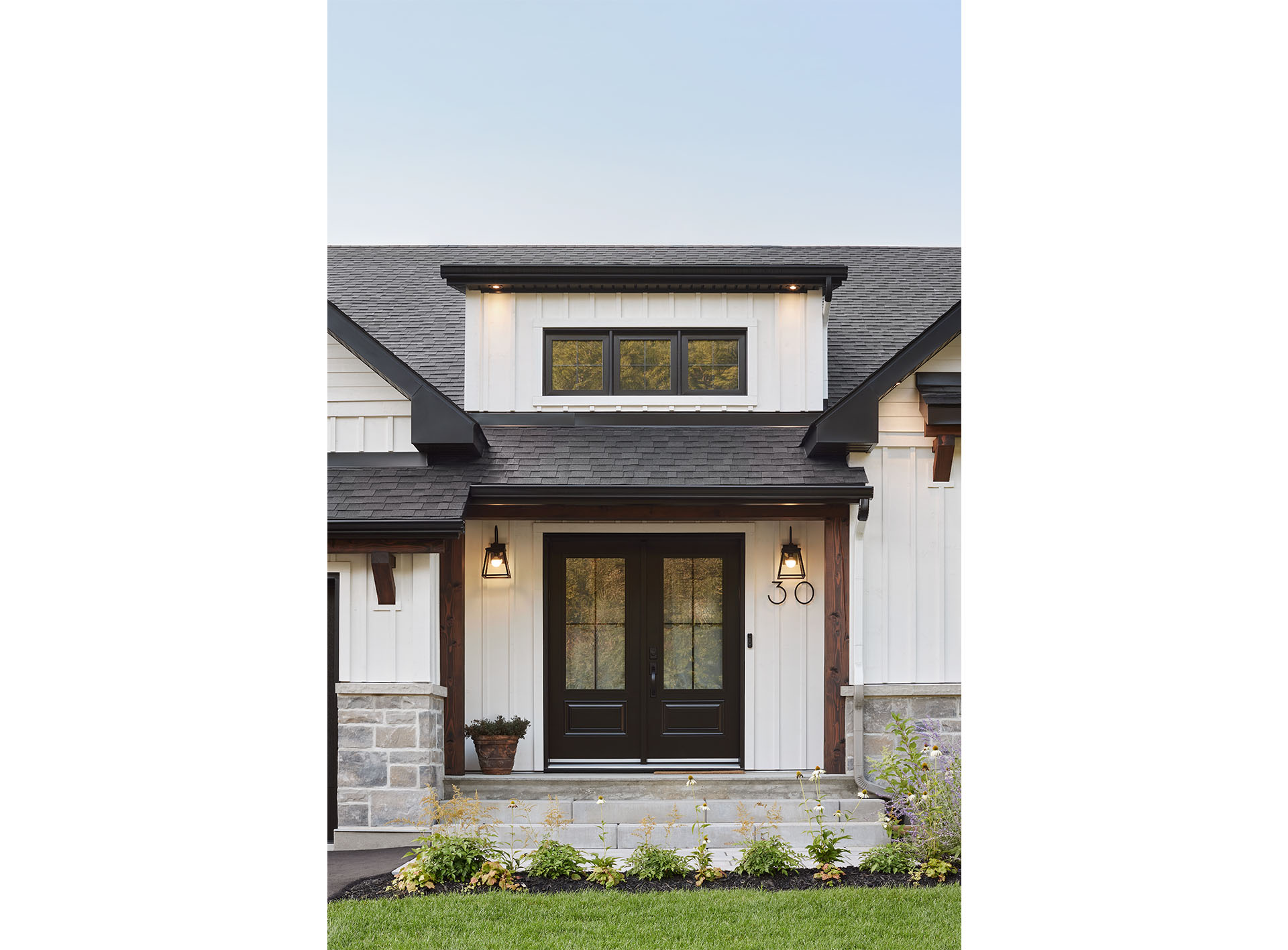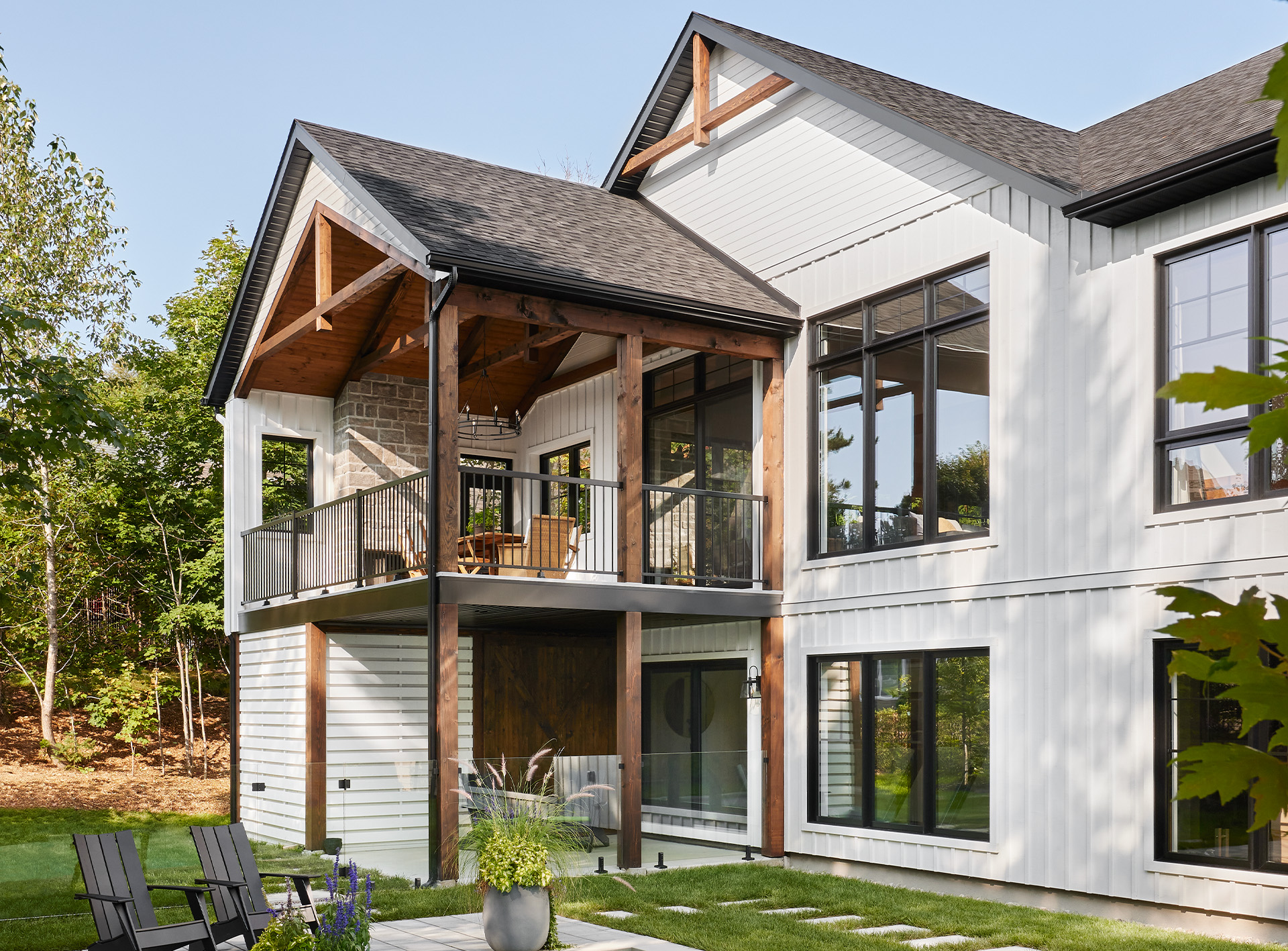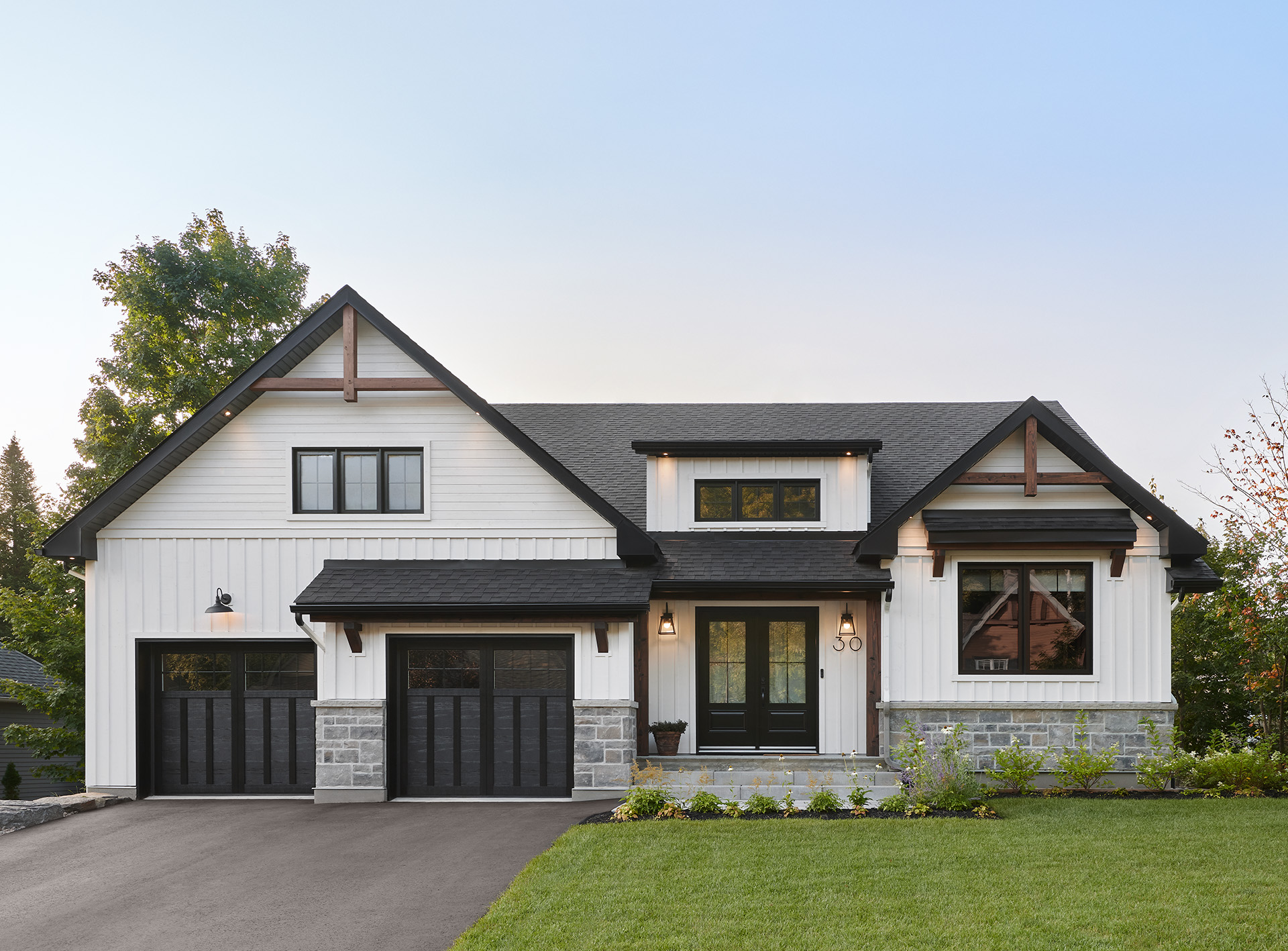 Le style «Farmhouse» est caractérisé par les revêtements de bois en planches et couvre-joints, par les couleurs blanc et noir, le carrelage dans les fenêtres, les poutres de bois et la touche de parement de pierres. La magie opère également dès l’entrée dans la maisonnée, avec la lucarne qui apporte la lumière de fin de journée dans l’ensemble de la maison. Au rez-de-chaussée, nous y trouvons toutes les pièces importantes dont le couple occupe la majorité du temps, sans oublier la terrasse couverte agrémentée d’un foyer extérieur. Le rez-de-jardin est occupé par des chambres d’extra, un bureau-gym et des pièces de rangement. Un atelier est situé en dessous du garage avec un accès direct à la cour arrière.