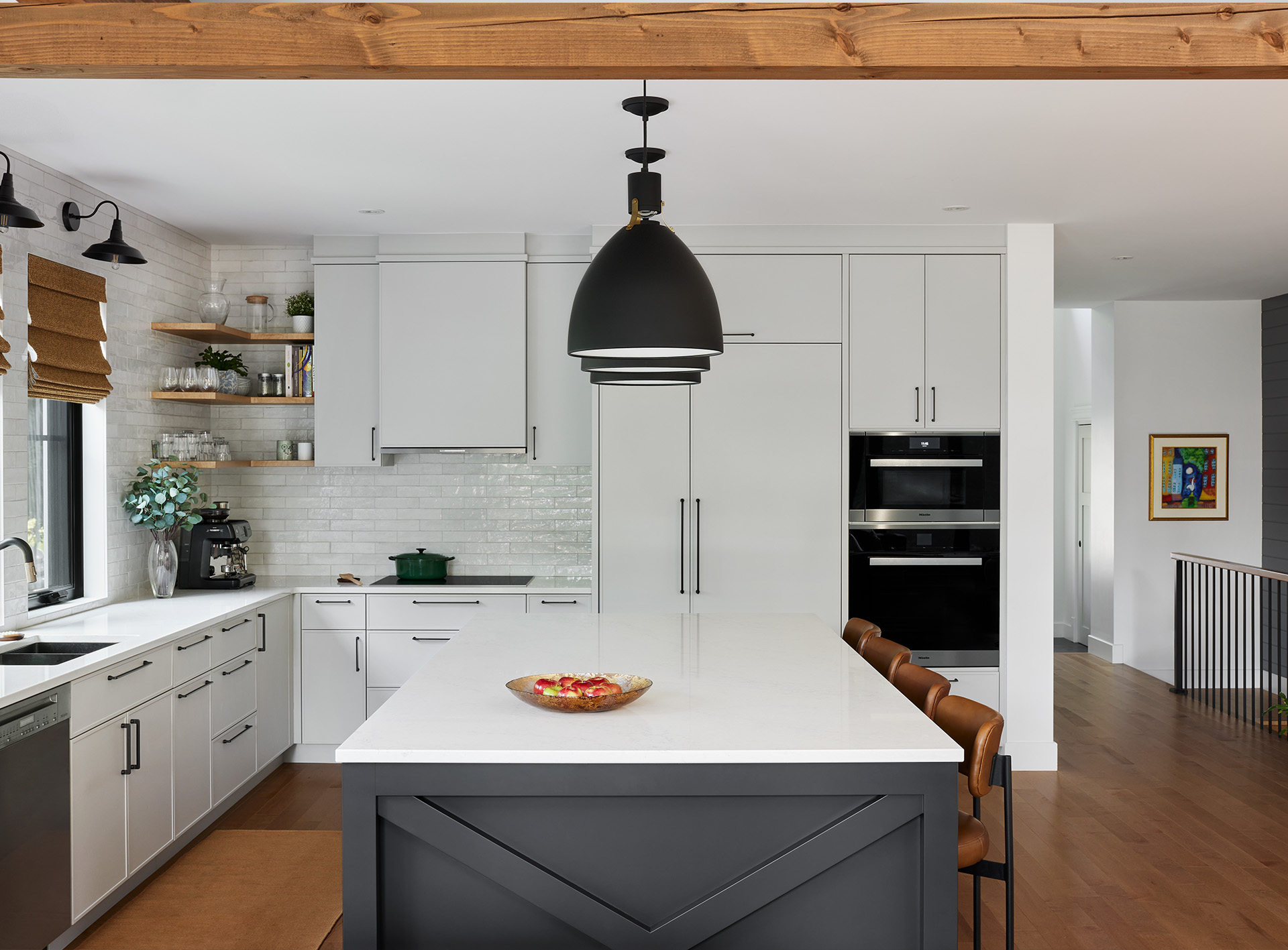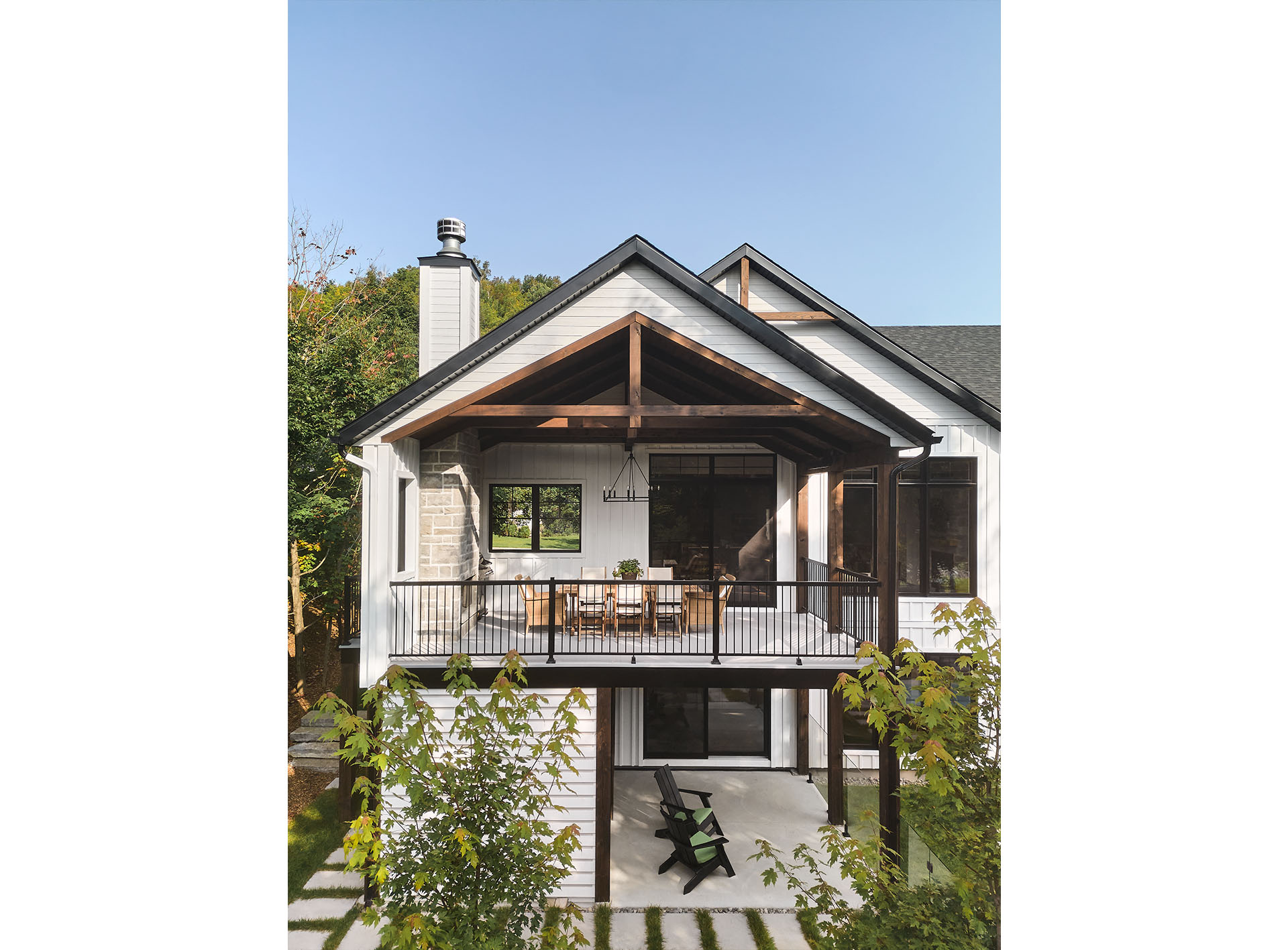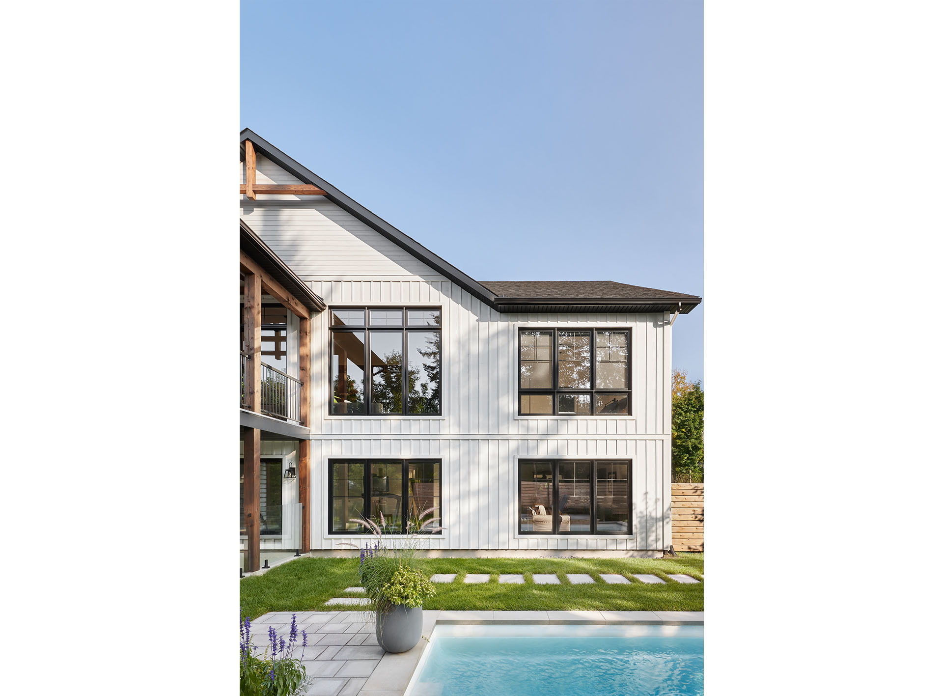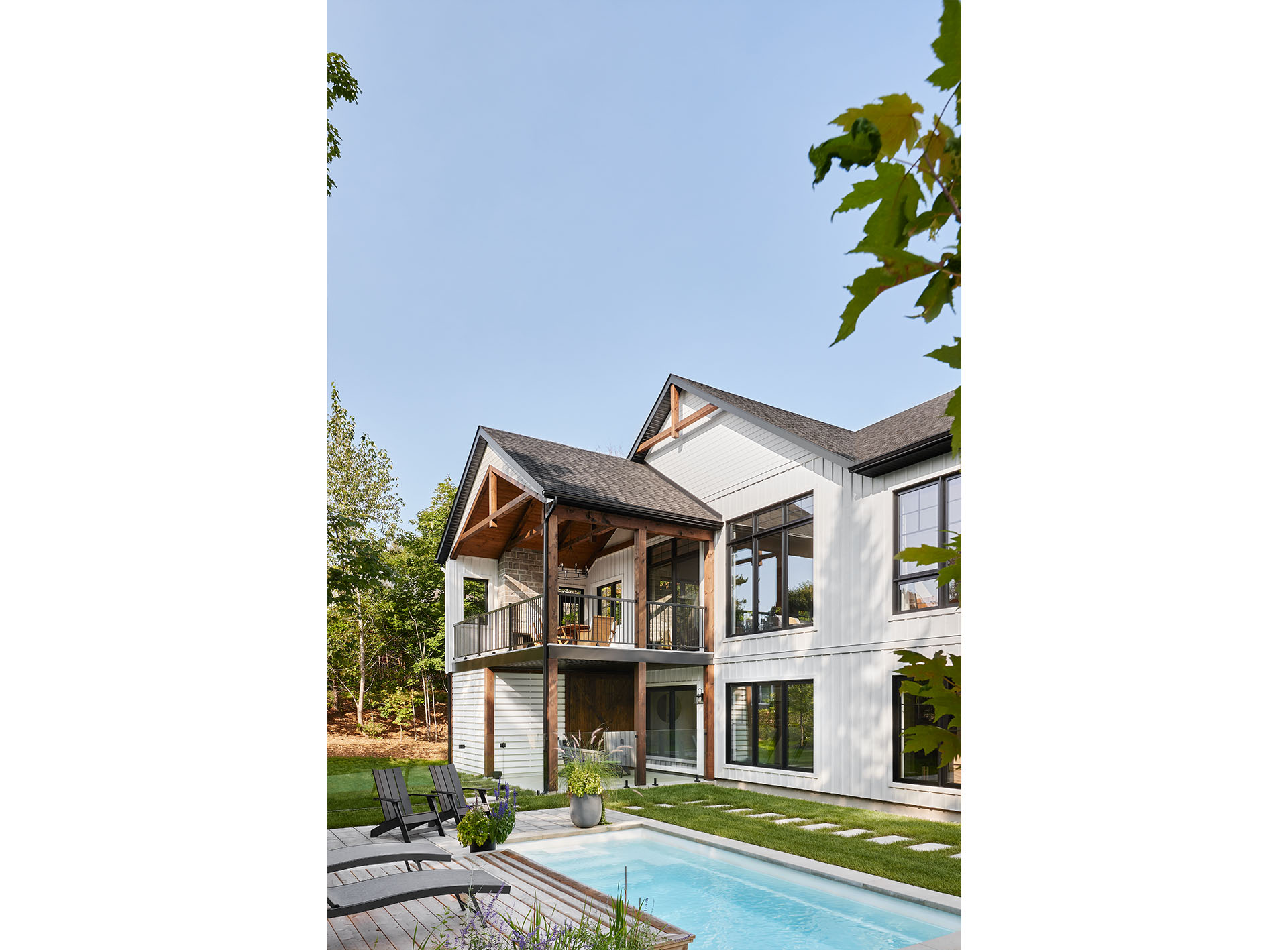 Le style «Farmhouse» est caractérisé par les revêtements de bois en planches et couvre-joints, par les couleurs blanc et noir, le carrelage dans les fenêtres, les poutres de bois et la touche de parement de pierres. La magie opère également dès l’entrée dans la maisonnée, avec la lucarne qui apporte la lumière de fin de journée dans l’ensemble de la maison. Au rez-de-chaussée, nous y trouvons toutes les pièces importantes dont le couple occupe la majorité du temps, sans oublier la terrasse couverte agrémentée d’un foyer extérieur. Le rez-de-jardin est occupé par des chambres d’extra, un bureau-gym et des pièces de rangement. Un atelier est situé en dessous du garage avec un accès direct à la cour arrière.