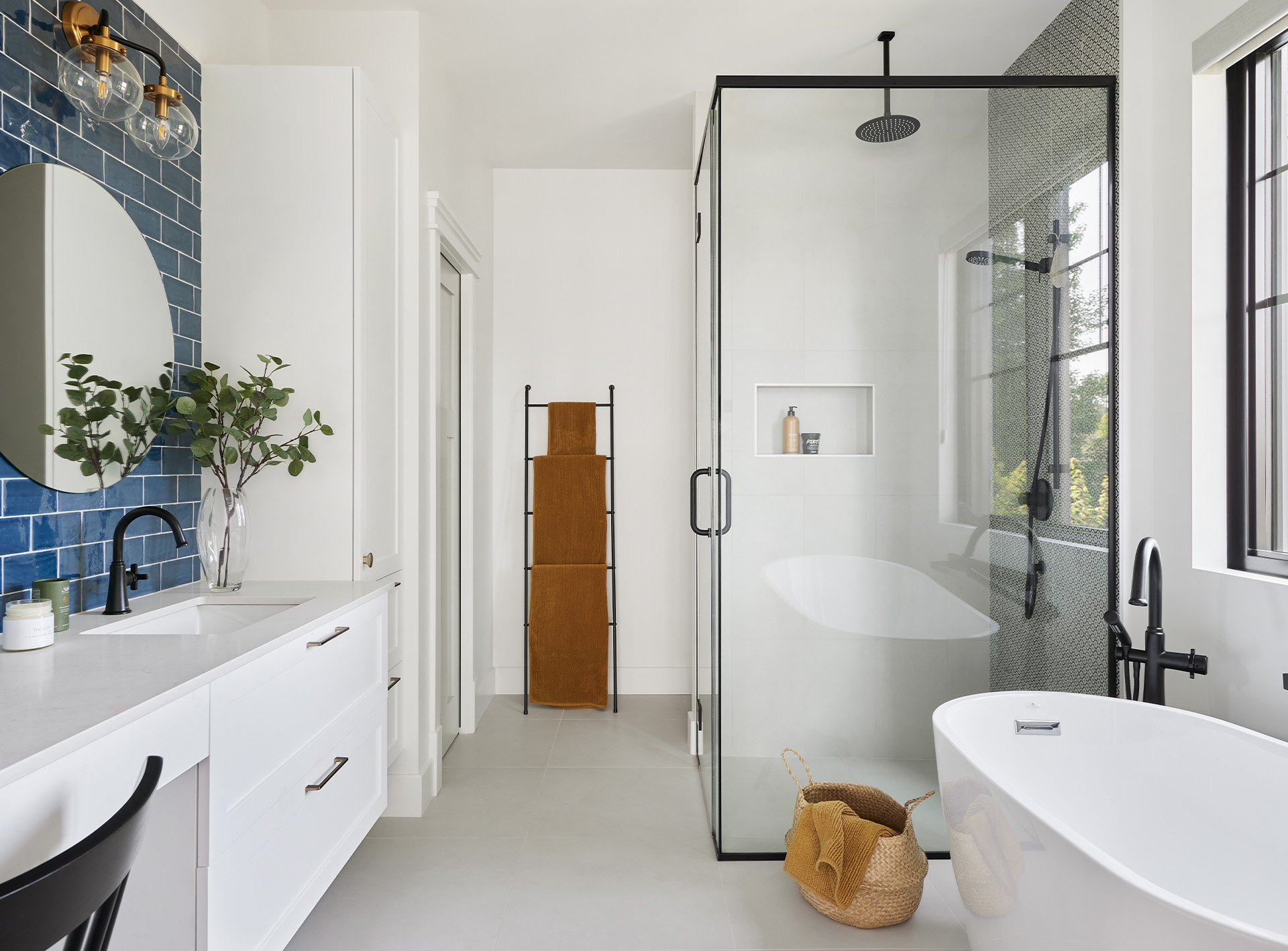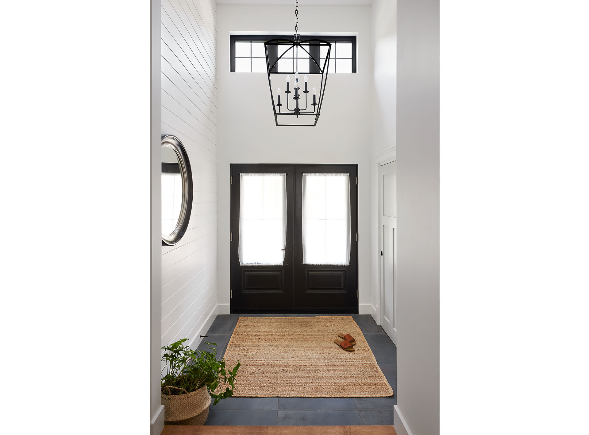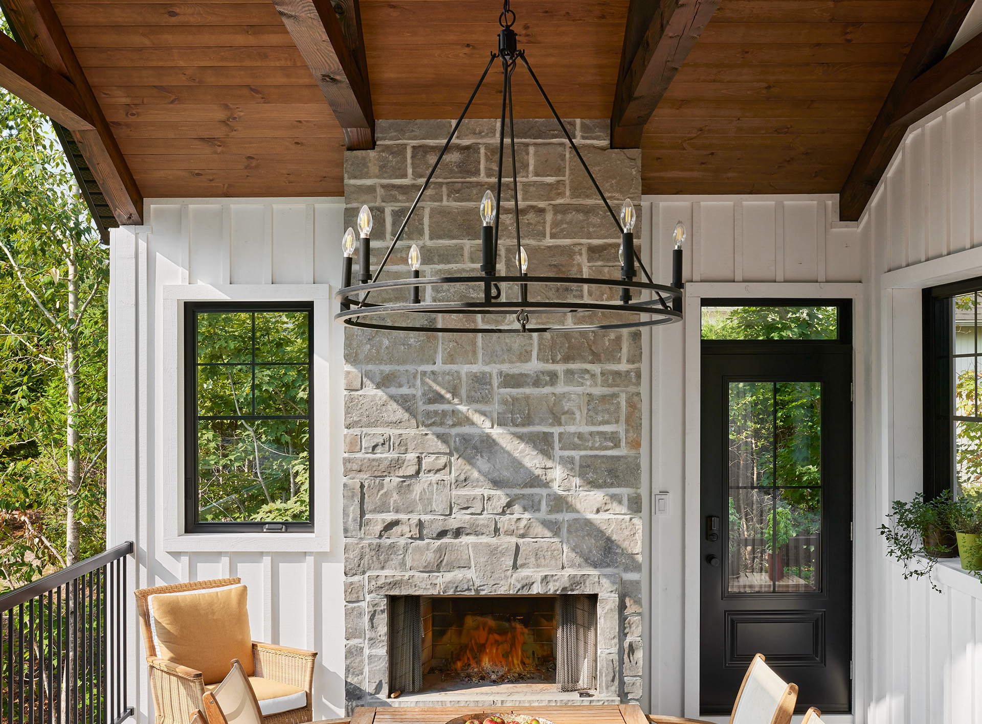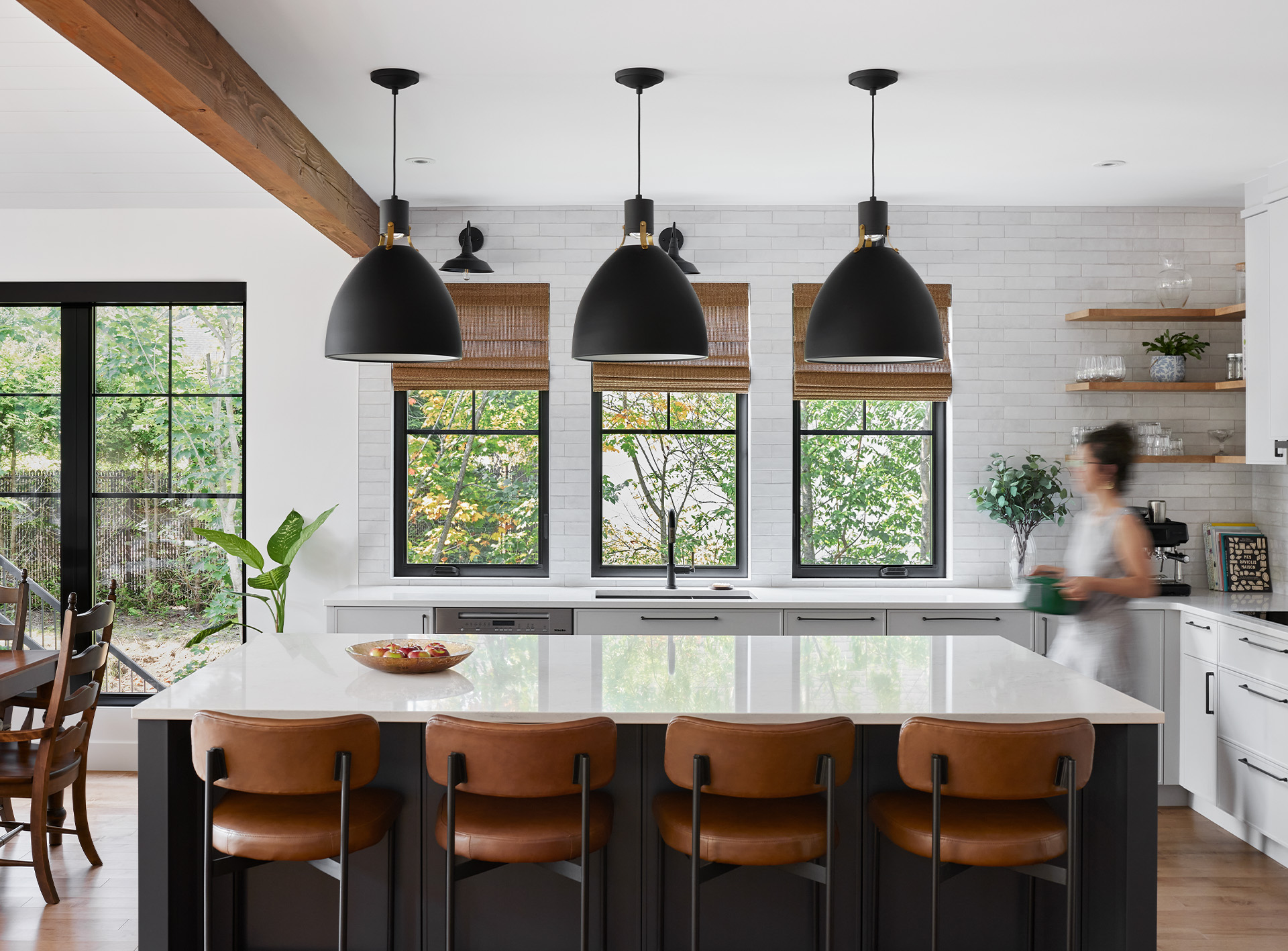 Le style «Farmhouse» est caractérisé par les revêtements de bois en planches et couvre-joints, par les couleurs blanc et noir, le carrelage dans les fenêtres, les poutres de bois et la touche de parement de pierres. La magie opère également dès l’entrée dans la maisonnée, avec la lucarne qui apporte la lumière de fin de journée dans l’ensemble de la maison. Au rez-de-chaussée, nous y trouvons toutes les pièces importantes dont le couple occupe la majorité du temps, sans oublier la terrasse couverte agrémentée d’un foyer extérieur. Le rez-de-jardin est occupé par des chambres d’extra, un bureau-gym et des pièces de rangement. Un atelier est situé en dessous du garage avec un accès direct à la cour arrière.